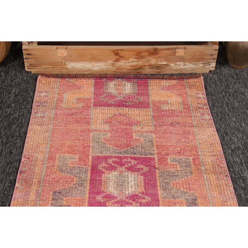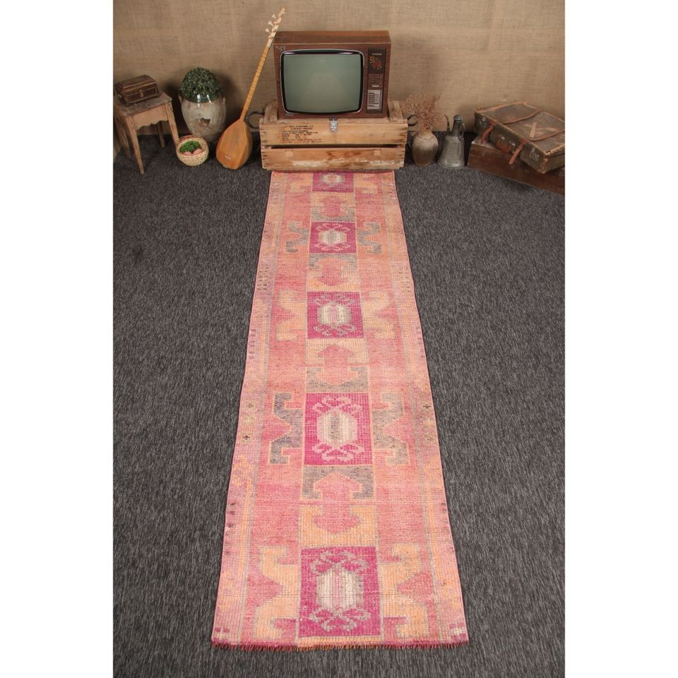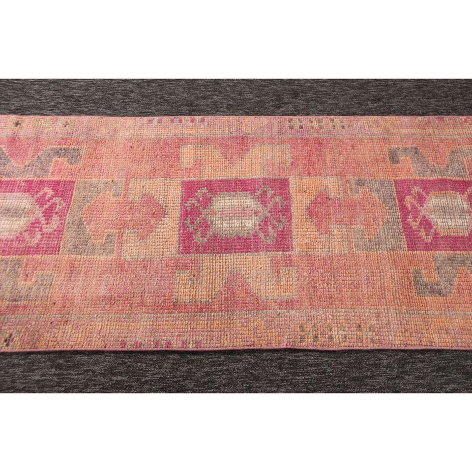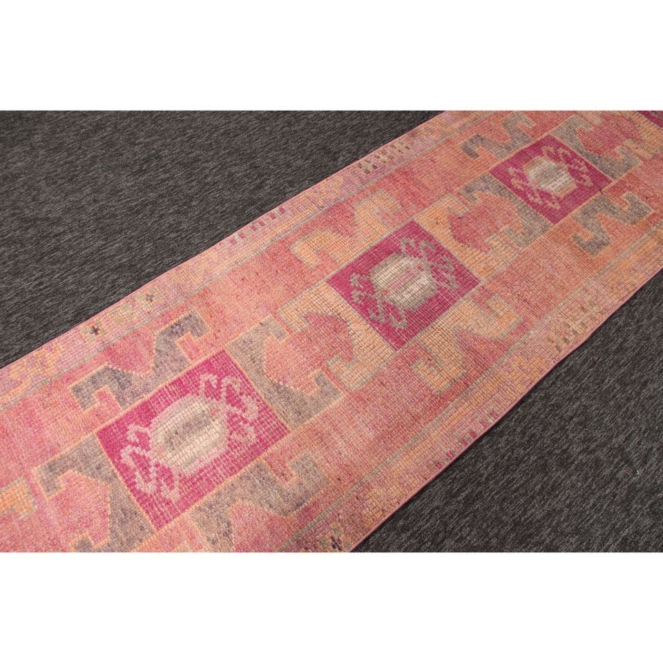 พรมเฮอร์กีตุรกีวินเทจ ขนาด 2.8x9.5 ฟุต สีชมพู ลายเรขาคณิตเล็กๆ