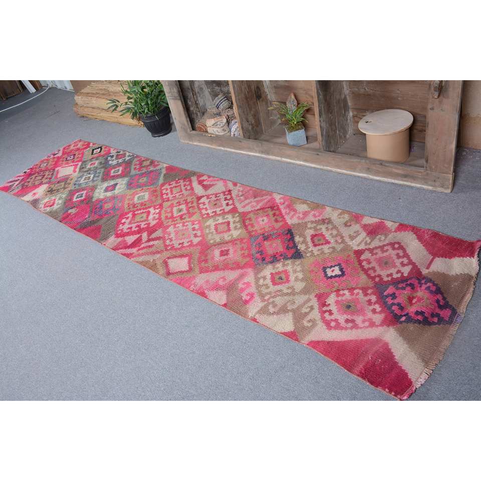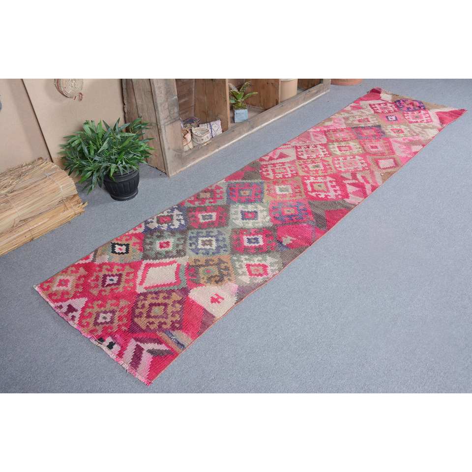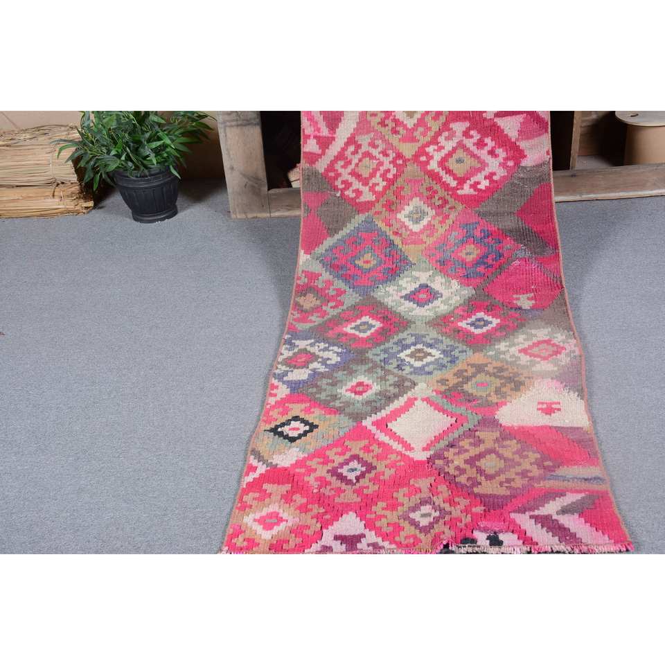 พรมสไตล์ตุรกีโบราณ2.4x10.1ft การออกแบบการเย็บปะติดปะต่อกันสีชมพูวัสดุขนสัตว์ที่มีน้ำยางด้านหลังสำหรับตกแต่งห้องนั่งเล่นสำหรับวัยรุ่น