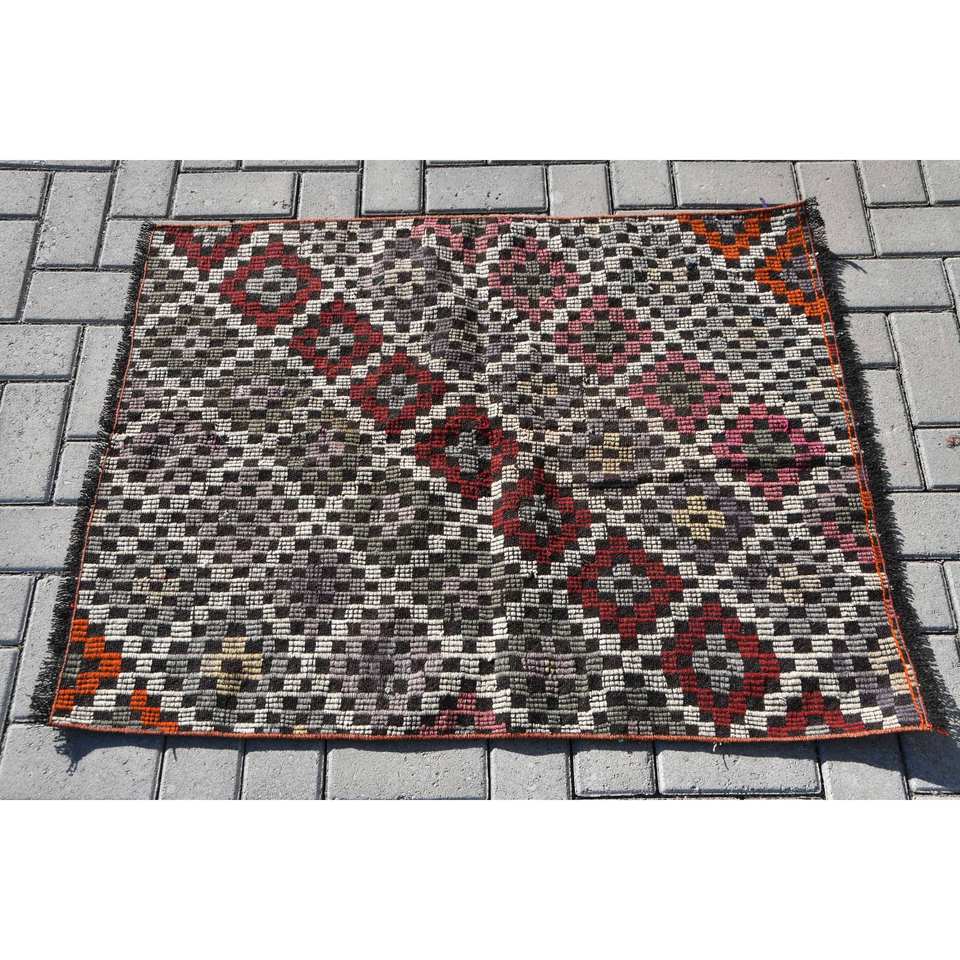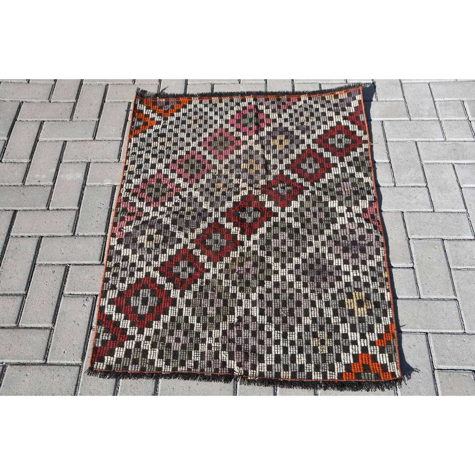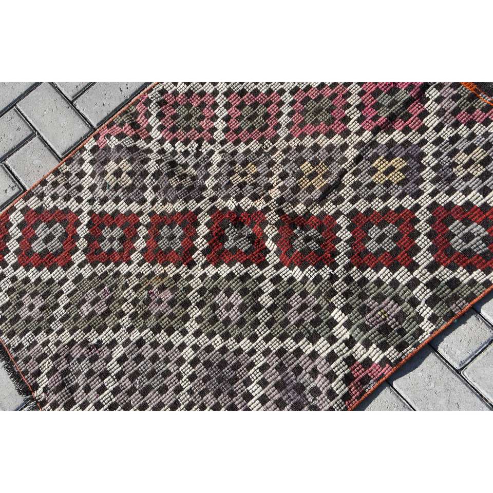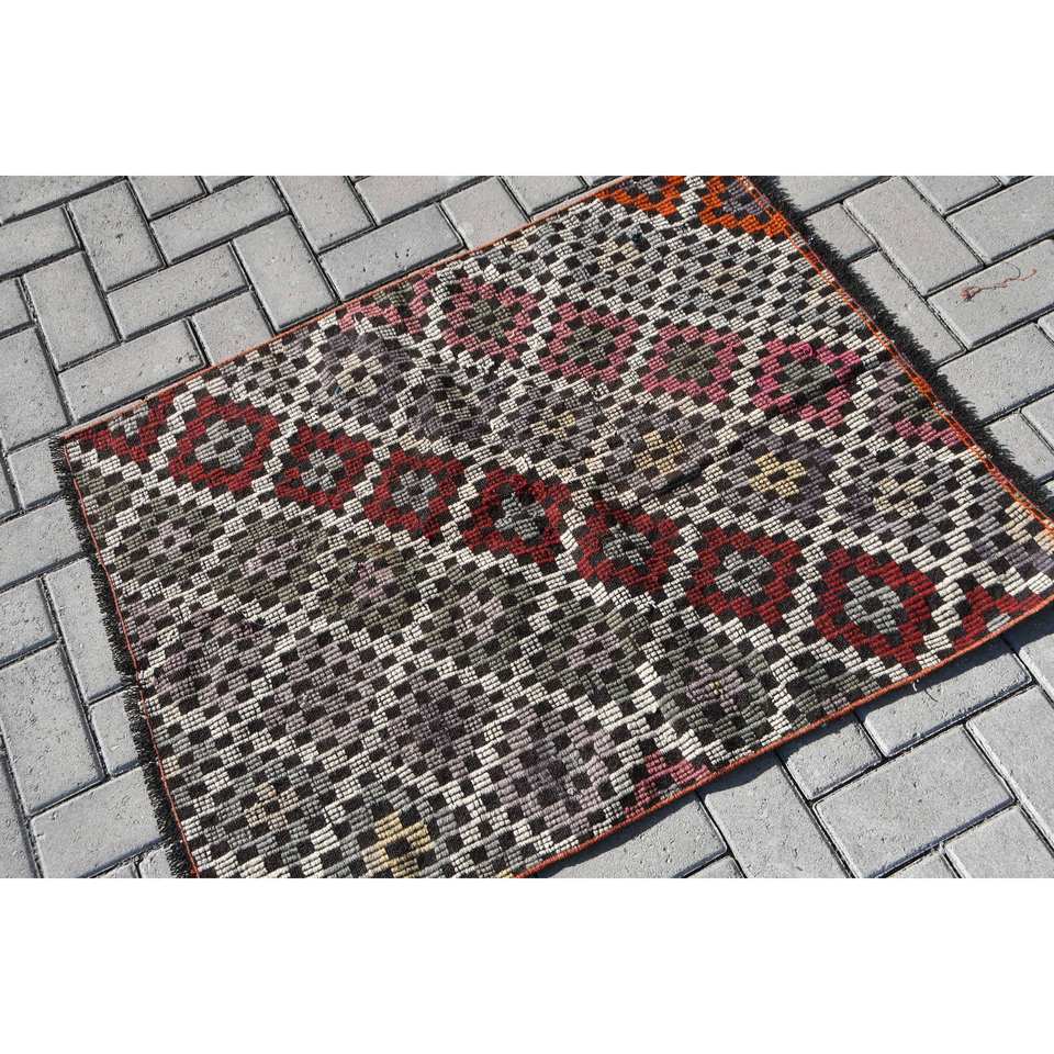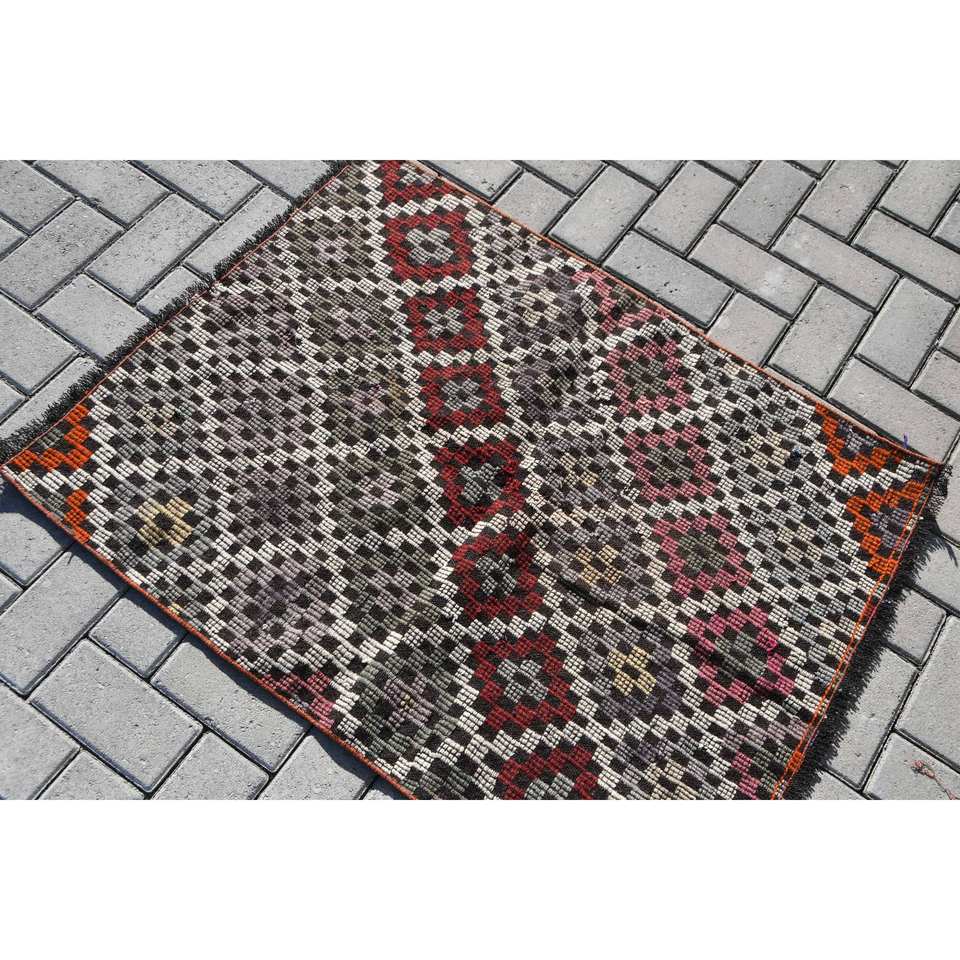 Vintage Turkish Kilim Rug 2.7 X 3.5 ft Red Black Patchwork Design Flat Weave Technique Wool Material 10mm for Teenagers