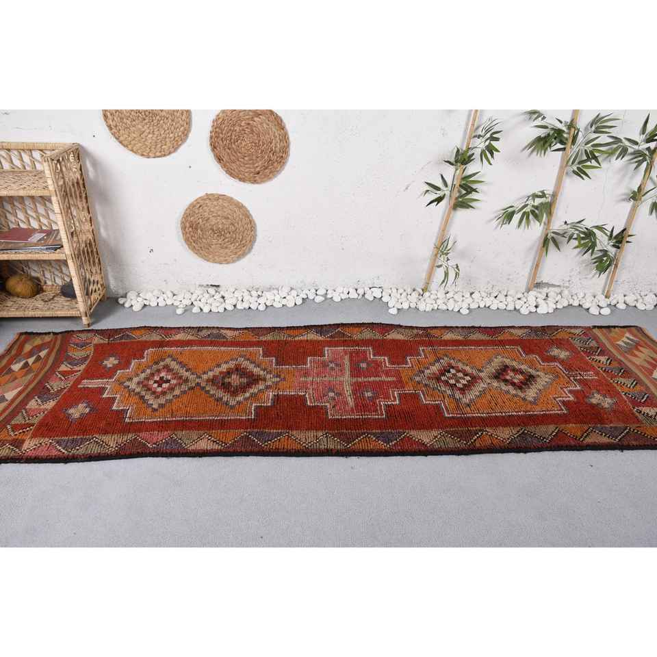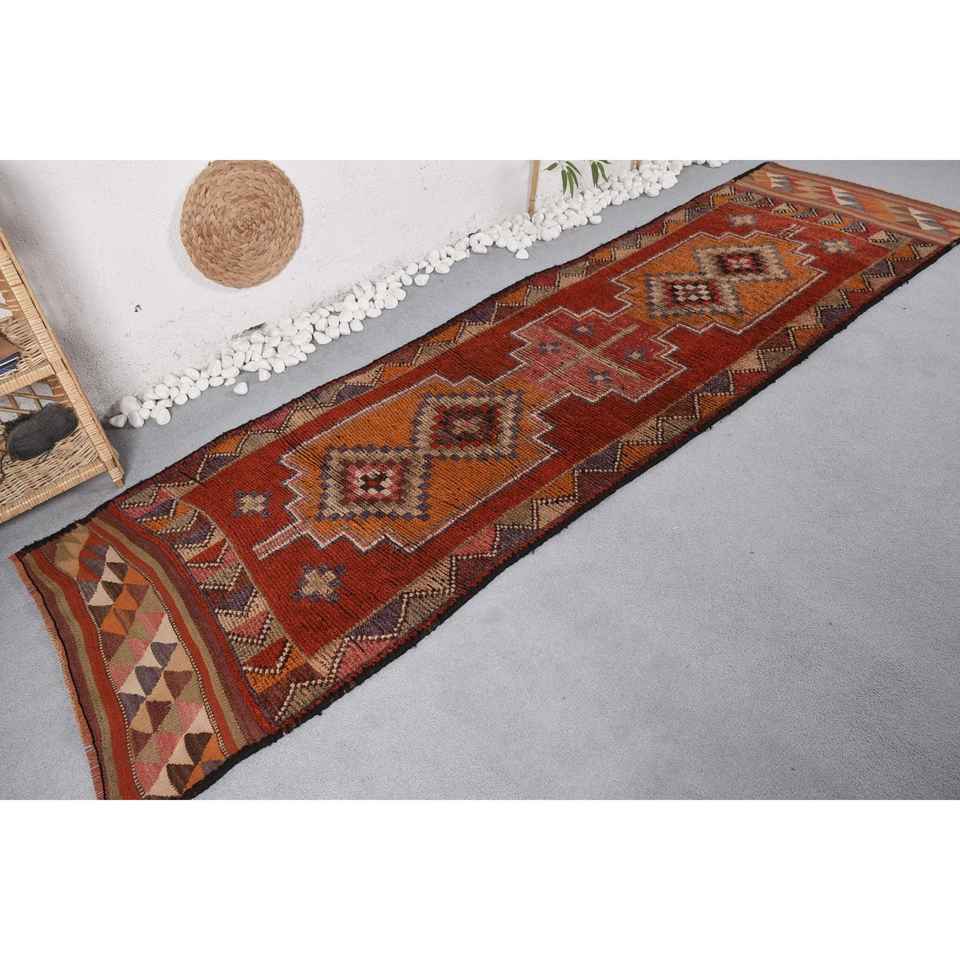 พรมคิลิมตุรกีวินเทจ ขนาด 2.8 x 10 ฟุต สีแดงส้ม ทอแบบเรียบ ทำจากขนสัตว์ เป็นมิตรกับสิ่งแวดล้อม ด้านหลังเป็นยางลาเท็กซ์ ลายปะติดปะต่อ เหมาะสำหรับวัยรุ่นและผู้ใหญ่