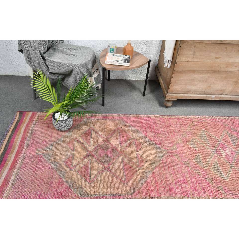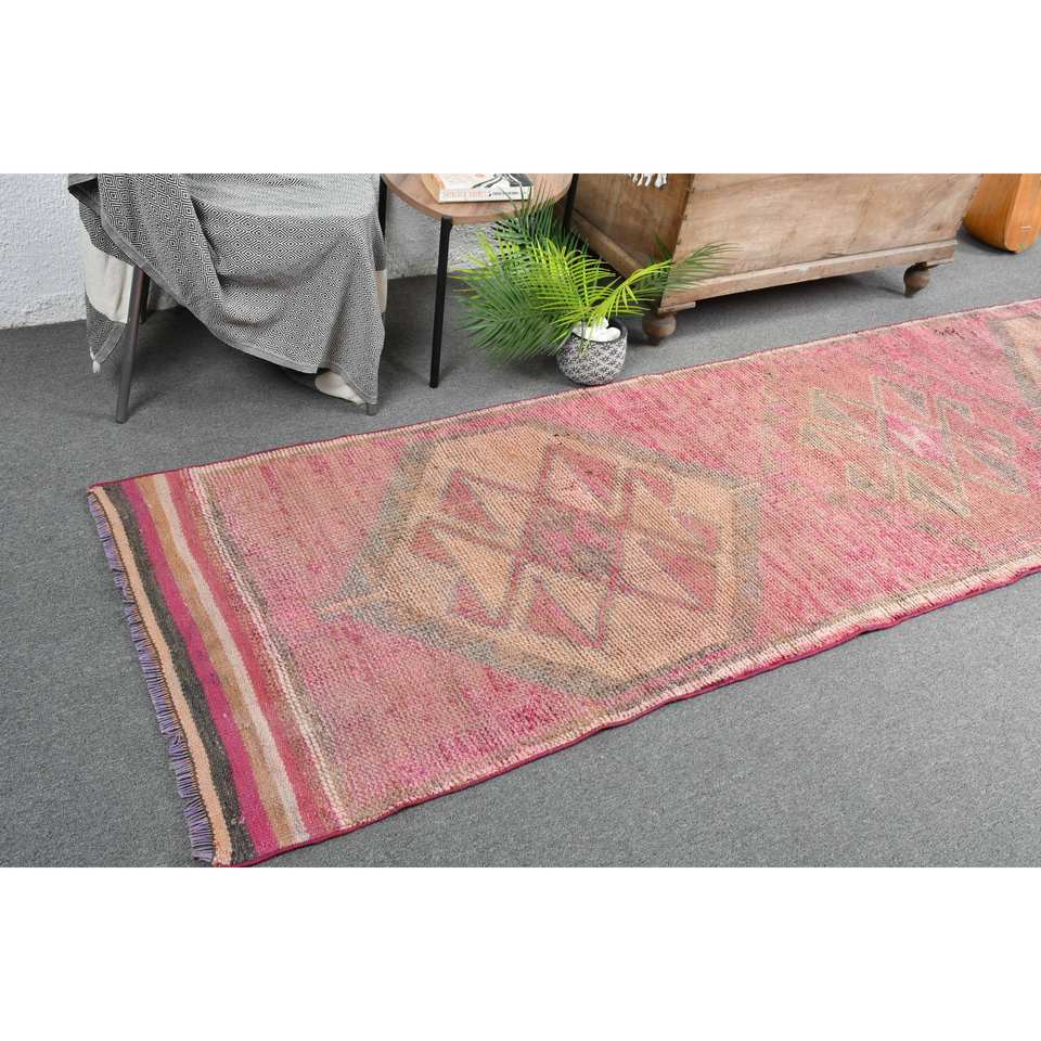 พรมถักสไตล์ตุรกีโบราณขนาด2.9 x 10.1ft งานเย็บปะทำด้วยมือทำจากผ้าขนสัตว์สีน้ำตาลสีชมพูงานปะติดด้านหลังสำหรับวัยรุ่นสี่เหลี่ยมผืนผ้าสไตล์แอบสแตรก