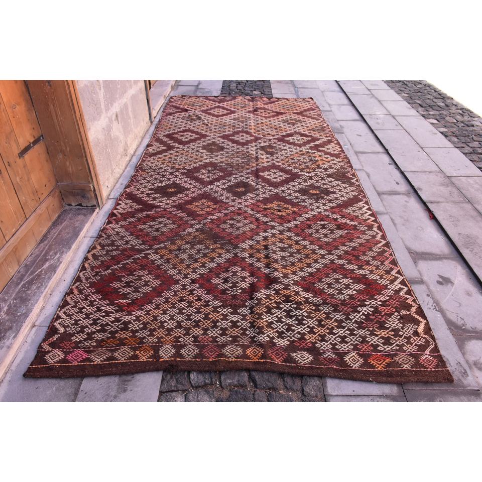 พรมถักสไตล์ตุรกีโบราณขนาด5.5x11.7ฟุตสีน้ำตาลแดงถักแบบแบนขนแกะปอกระเจาผ้าปะต่อทรงสี่เหลี่ยมผืนผ้าสำหรับตกแต่งโถงทางเดินห้อง