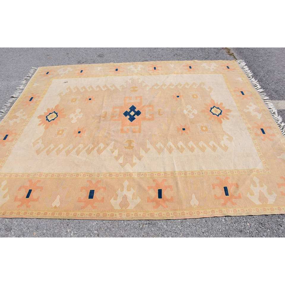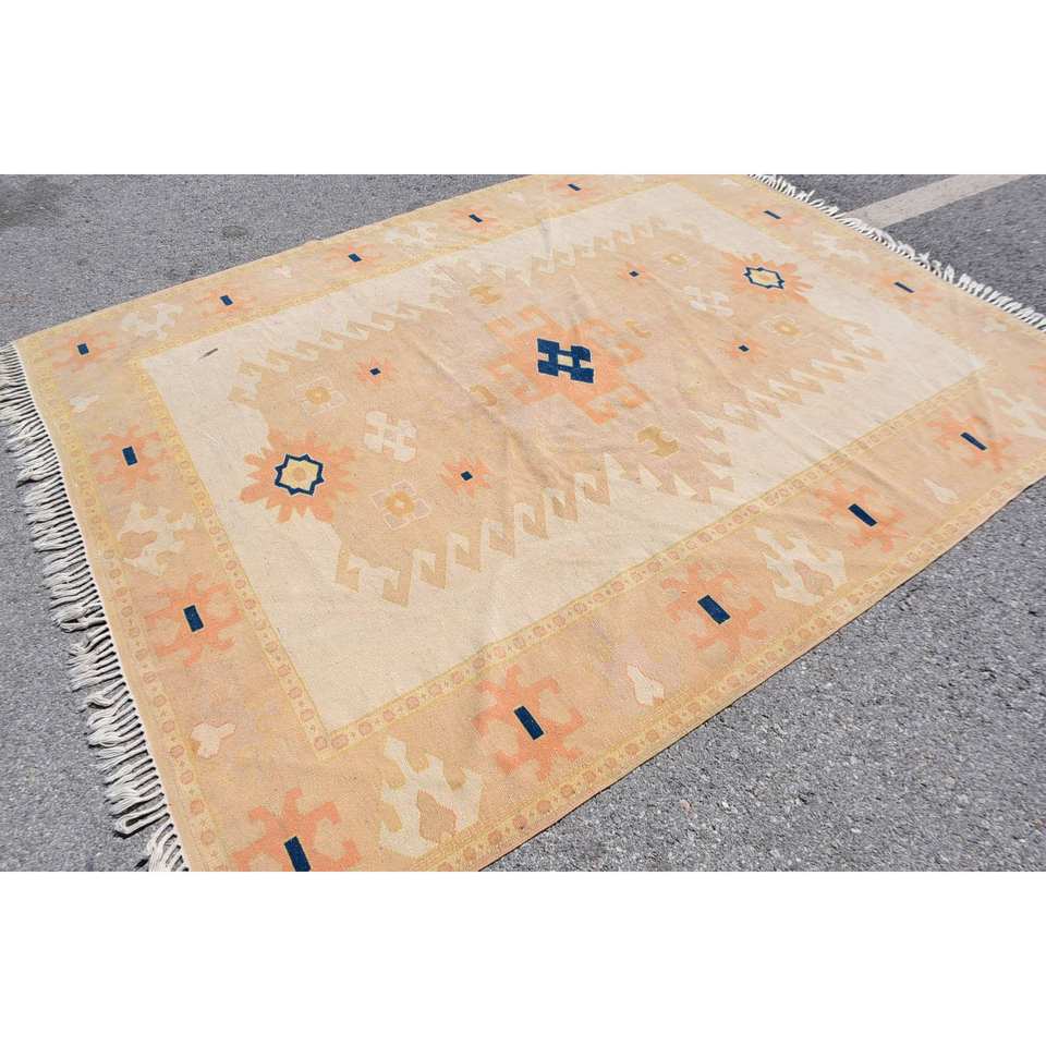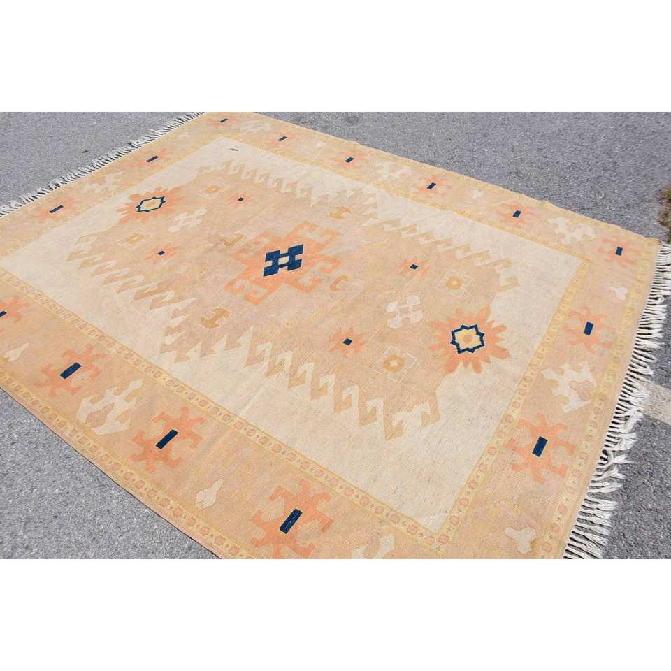พรมถักสไตล์ตุรกีโบราณ6.6 x 8.4ft เบจสีส้มการออกแบบการเย็บปะติดปะต่อกันพรมห้องนั่งเล่นขนแกะคลาสสิกพร้อมแผ่นยางรองสำหรับวัยรุ่น