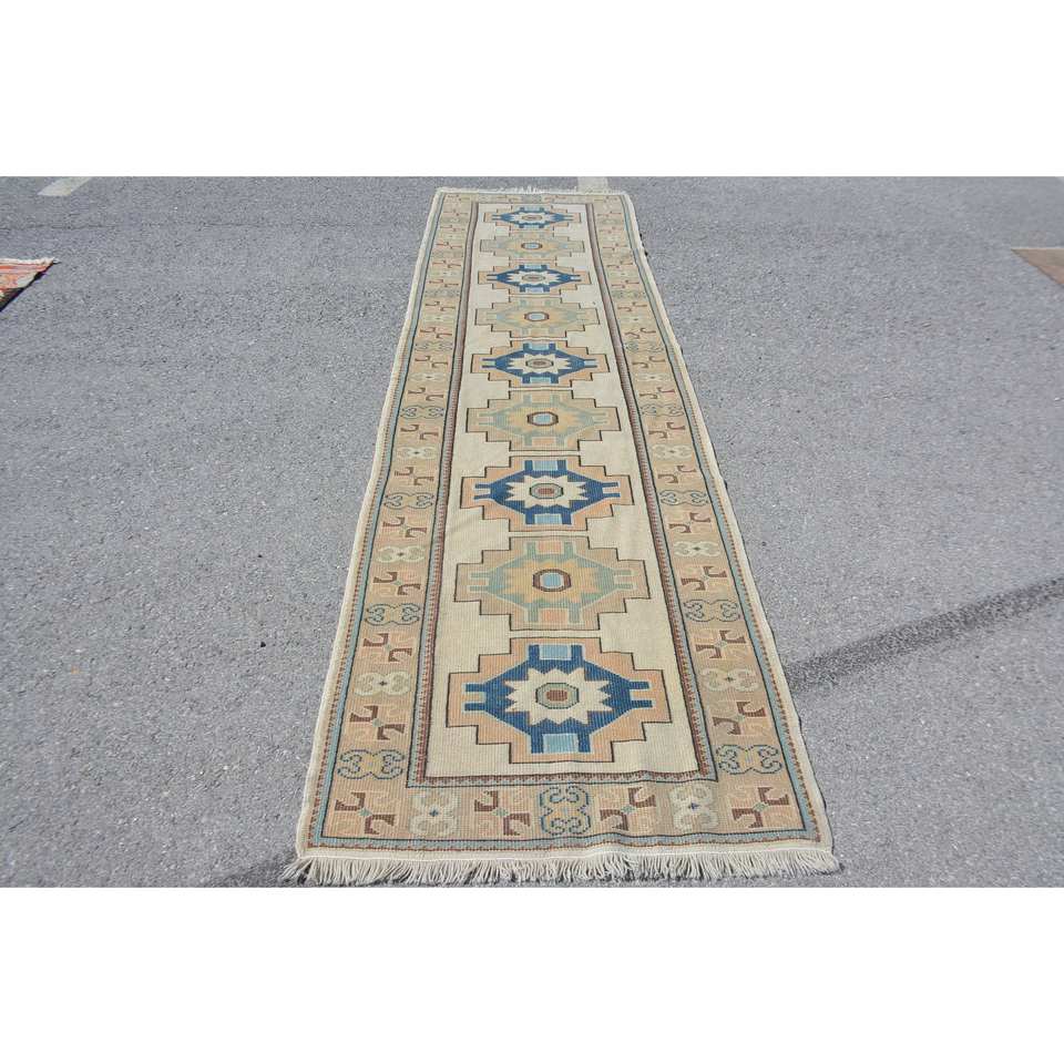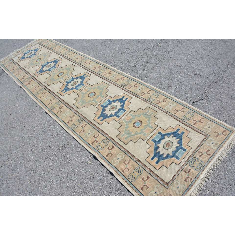 พรมตุรกีวินเทจสีเบจสีฟ้า3 x 10,4ft ทำด้วยมือผ้าขนสัตว์ยางรองสำหรับห้องนอนห้องโถงห้องนั่งเล่นการเย็บปะติดปะต่อกันนามธรรม