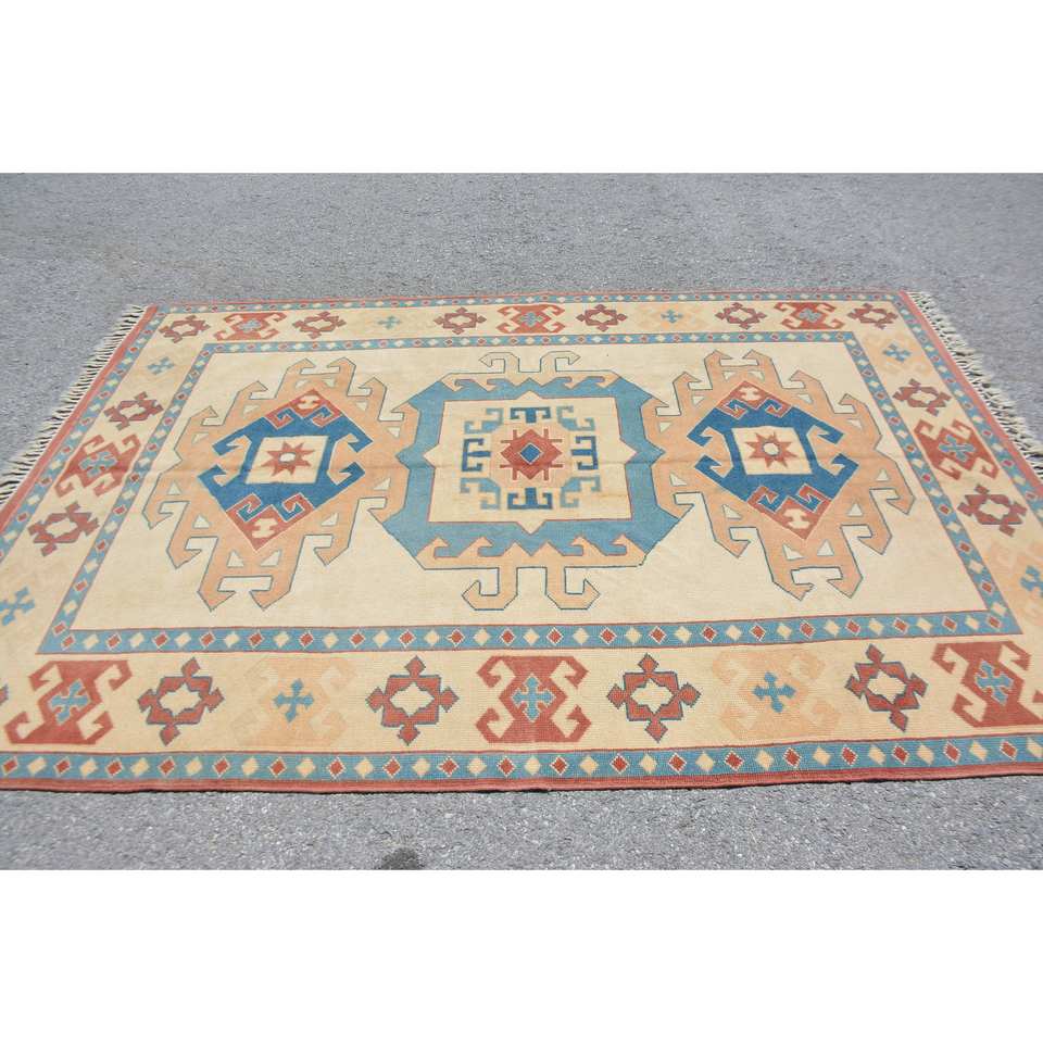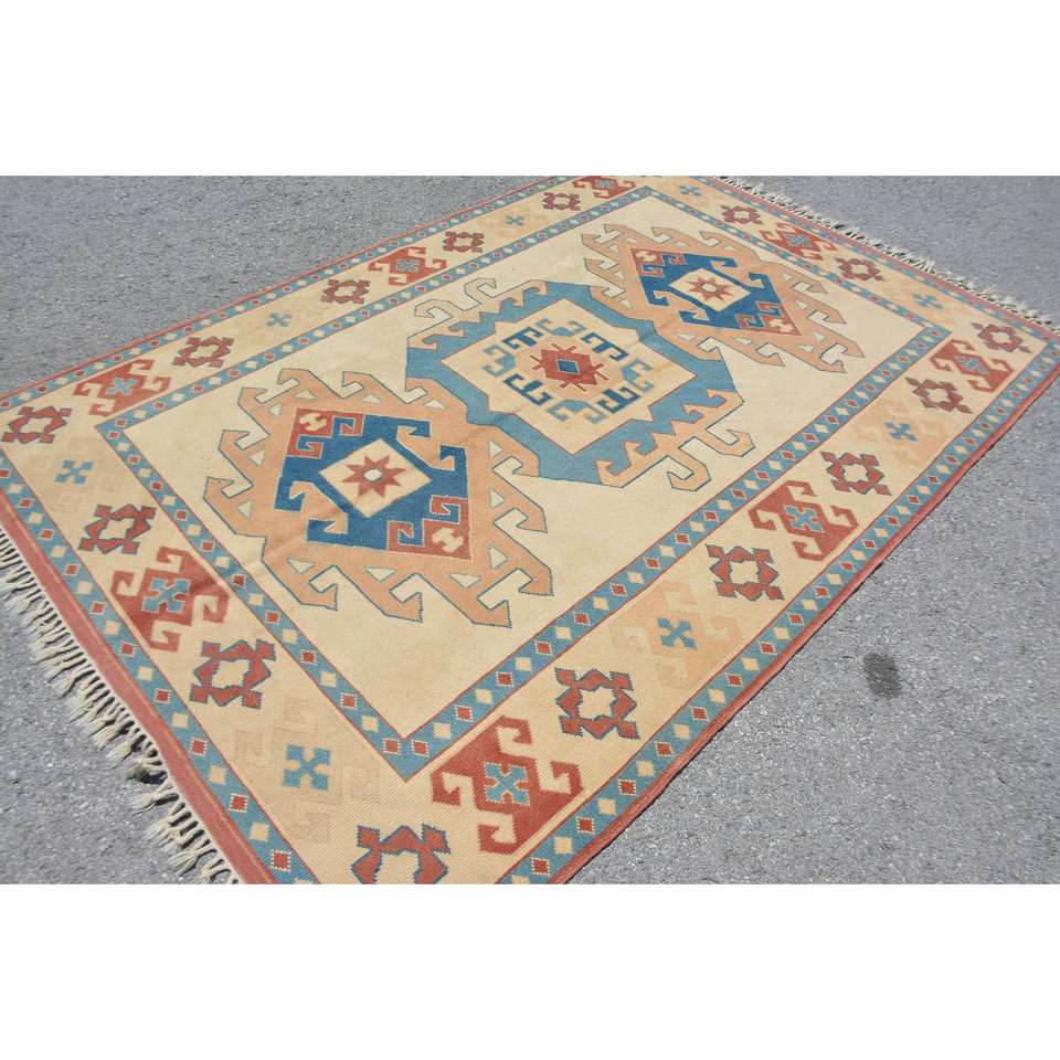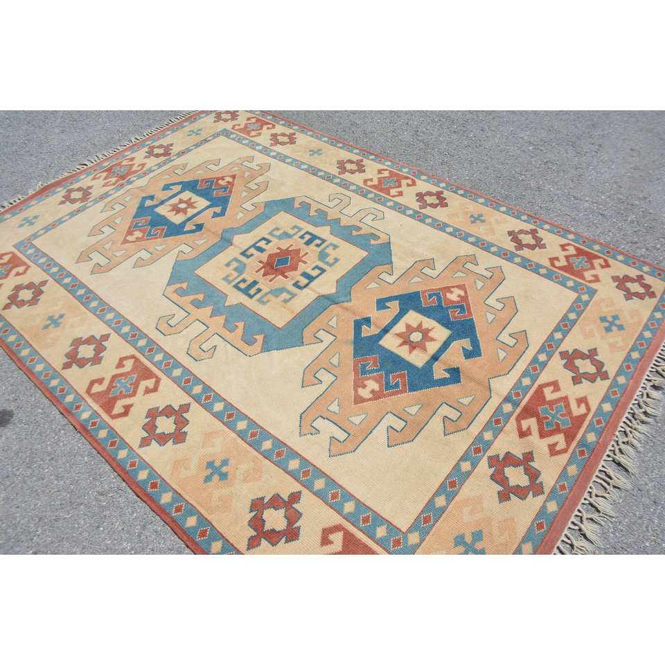 พรมถักสไตล์ตุรกีวินเทจขนสัตว์สีเบจสีฟ้า5.8x8.4ft ผ้าขนสัตว์แบบเย็บปะติดปะต่อกันตกแต่งห้องนั่งเล่นขนาด9x12