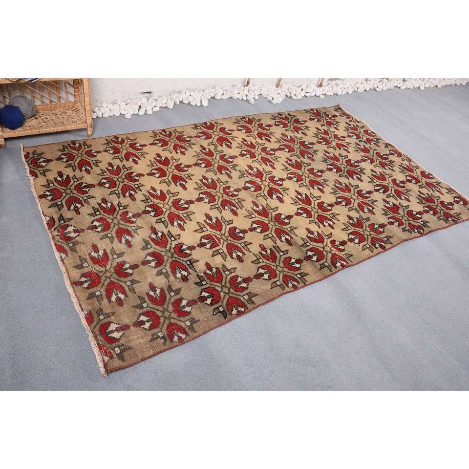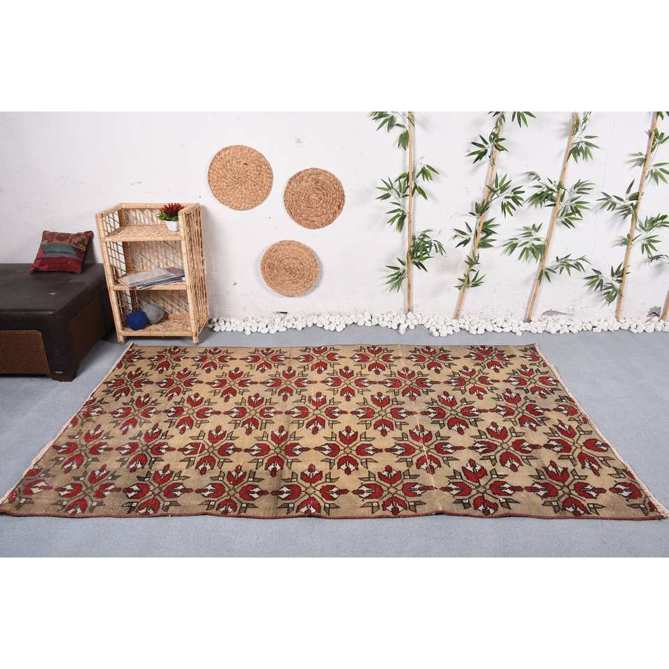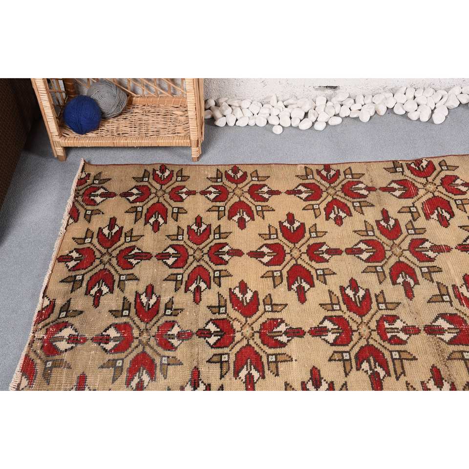 พรมตุรกีโบราณสีเบจสีแดงขนาด4.6x7.9ฟุตงานเย็บปะแบบคลาสสิกงานเย็บปะติดปะต่อวัสดุขนสัตว์ด้านหลังสำหรับใช้ชีวิตขนาด10มม.
