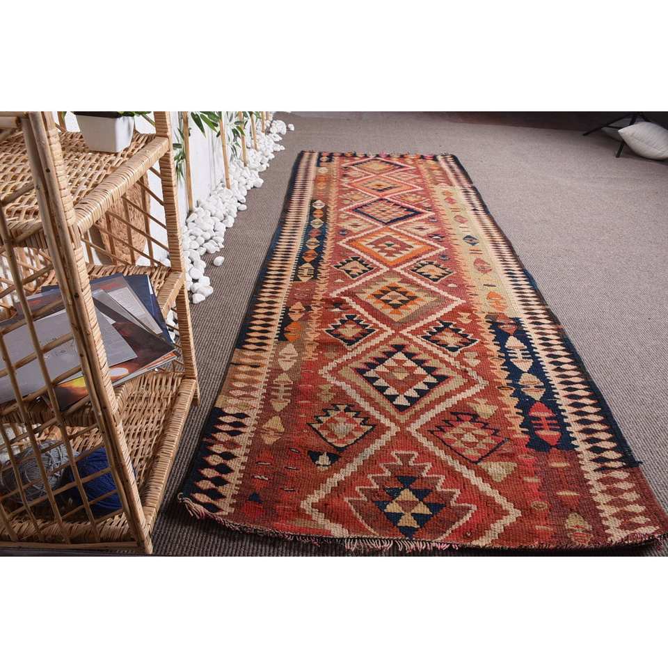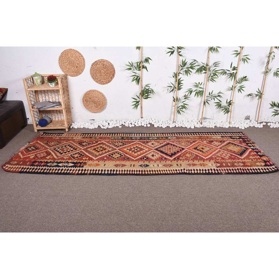 พรมตุรกีวินเทจสีแดงส้ม3.4 x 9.7ft ใหม่10มม. ผ้าขนสัตว์ยางเย็บปะติดปะต่อกันลวดลายนามธรรมสำหรับห้องนั่งเล่นที่บ้าน