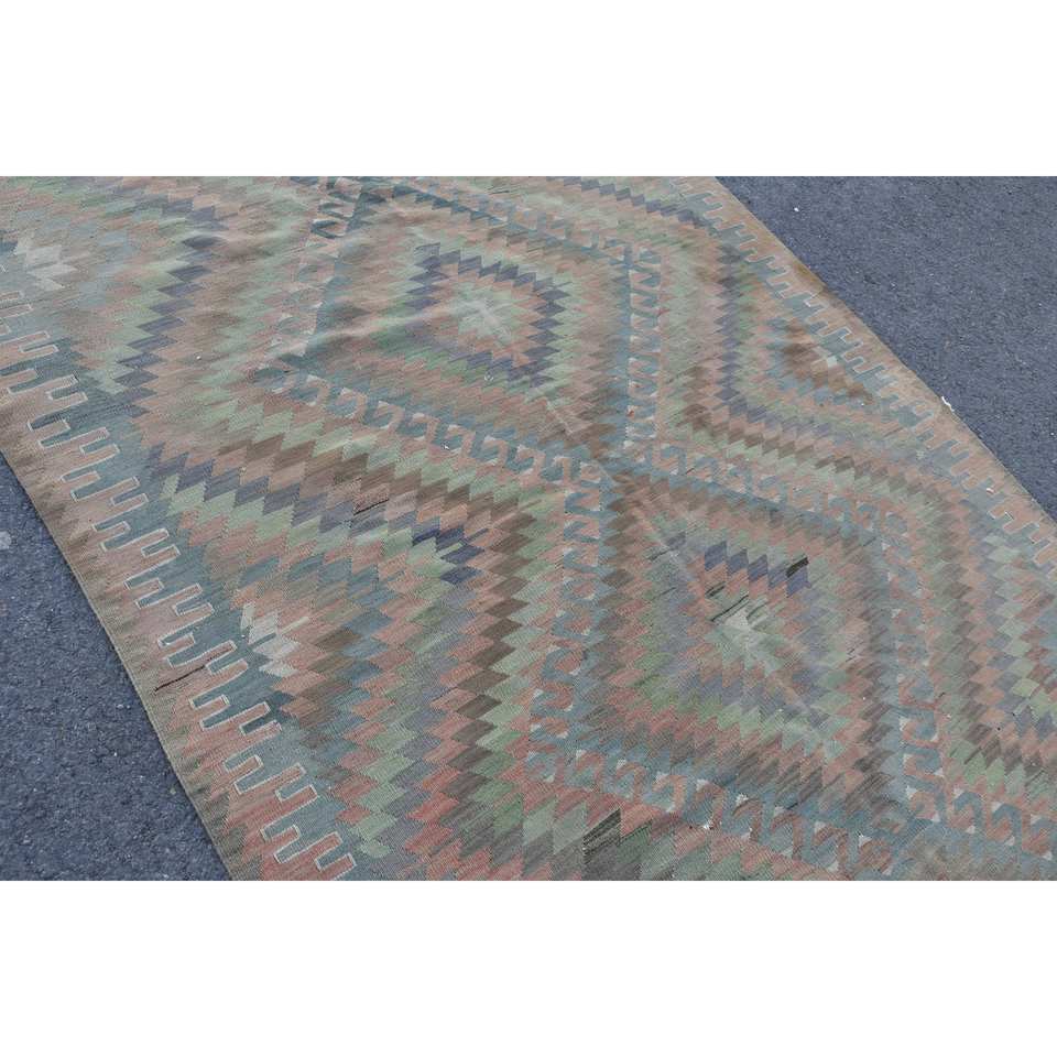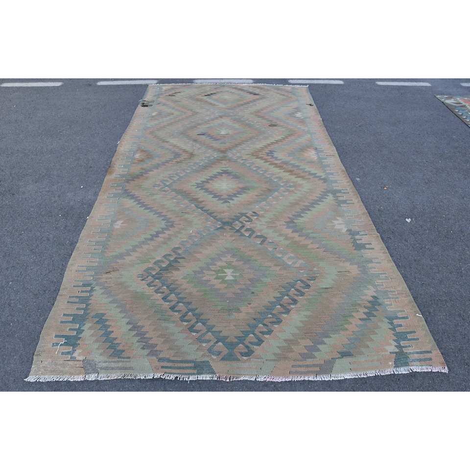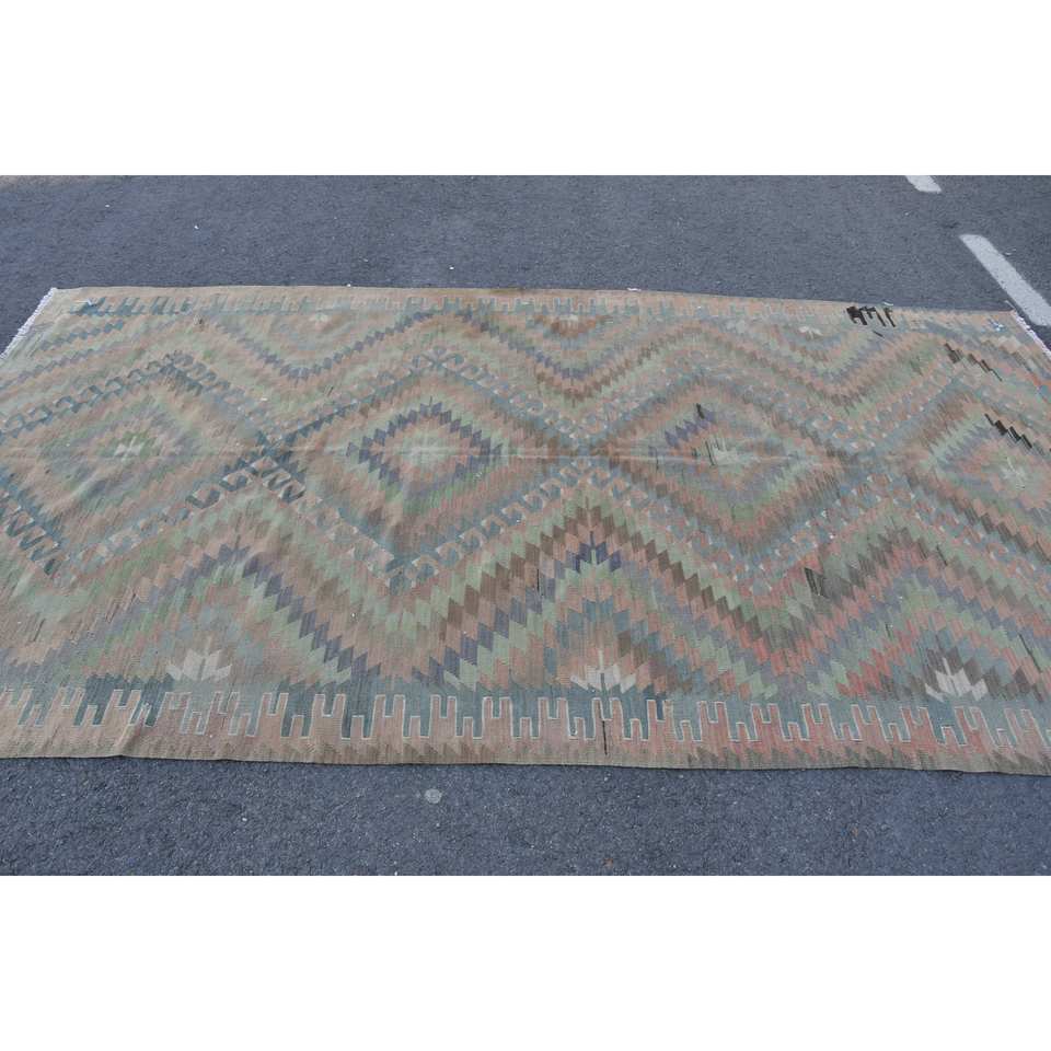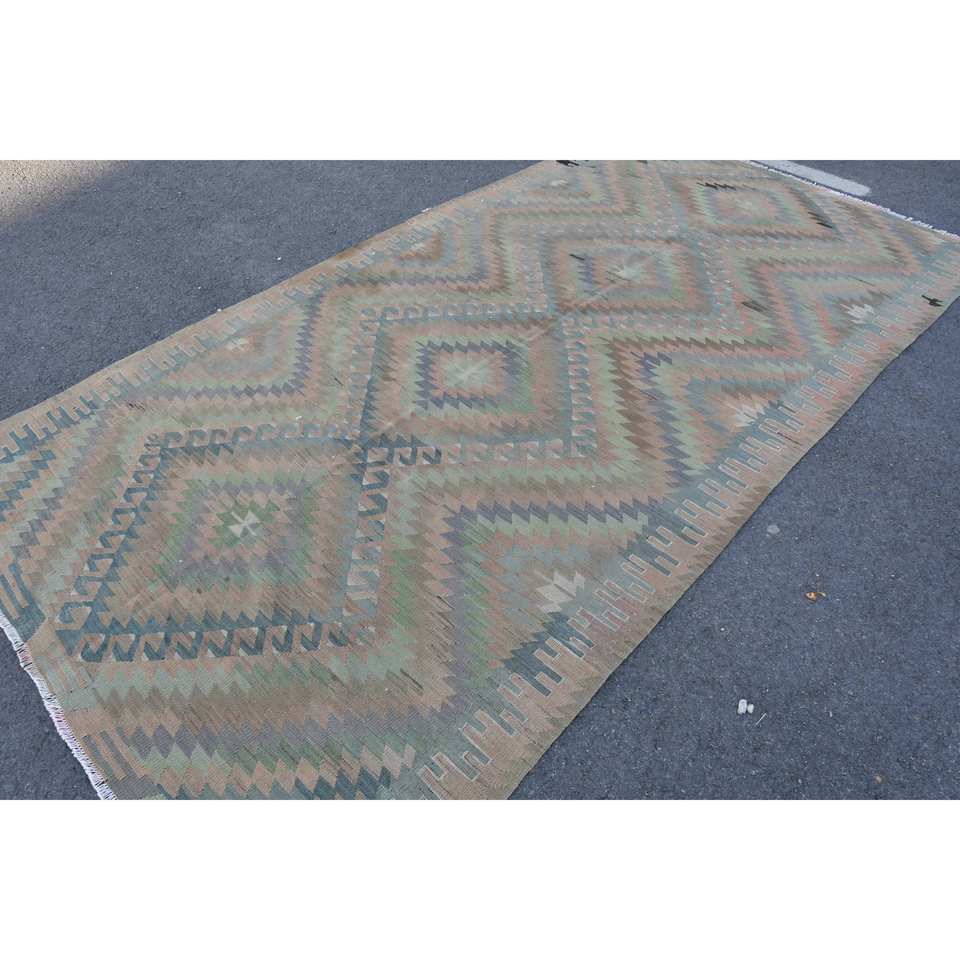 พรมปูพื้นขนแกะสไตล์ตุรกีวินเทจสีเบจสีเขียวงานเย็บปะ5.3x10.2ฟุตผ้าทอเรียบลาเท็กซ์สำหรับตกแต่งห้องนั่งเล่นรถ