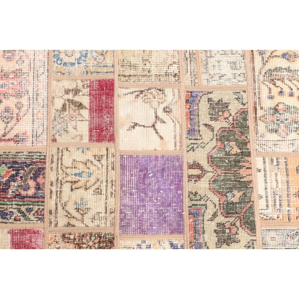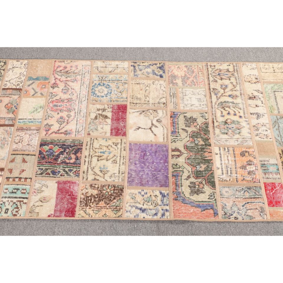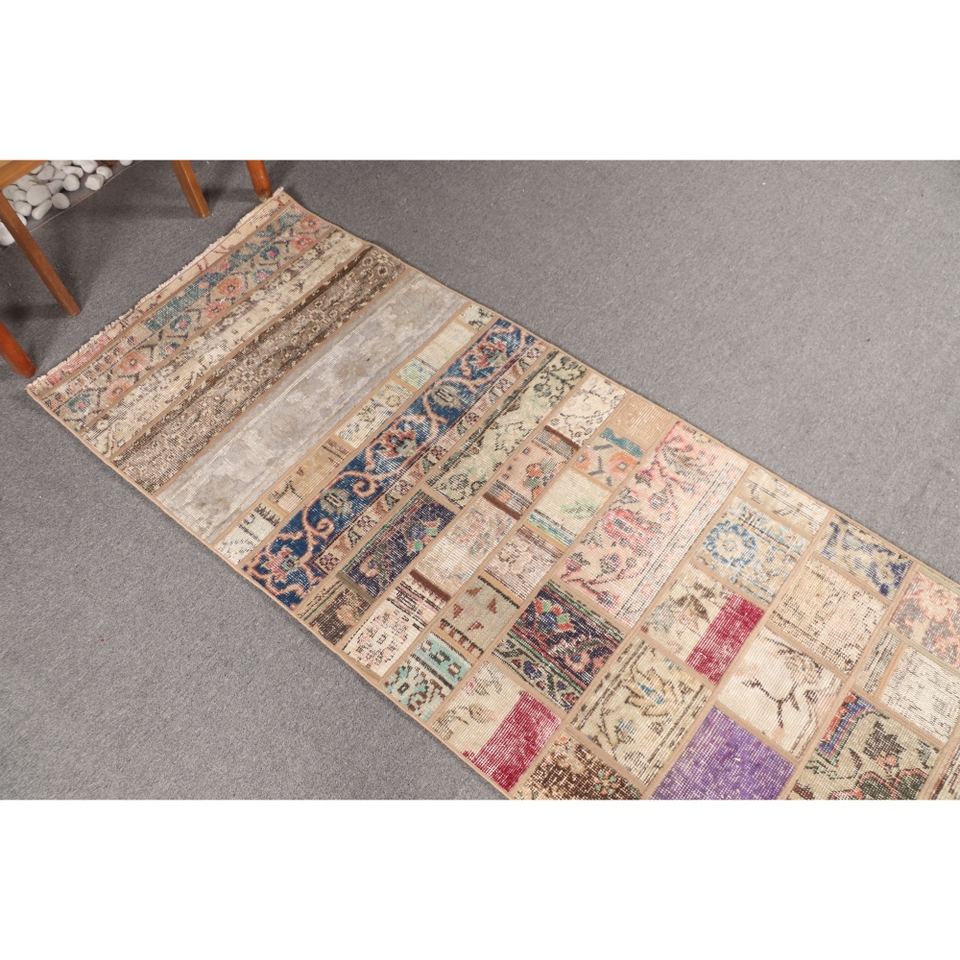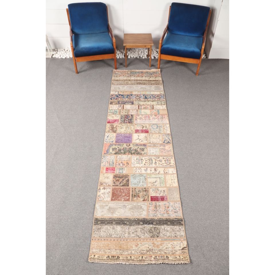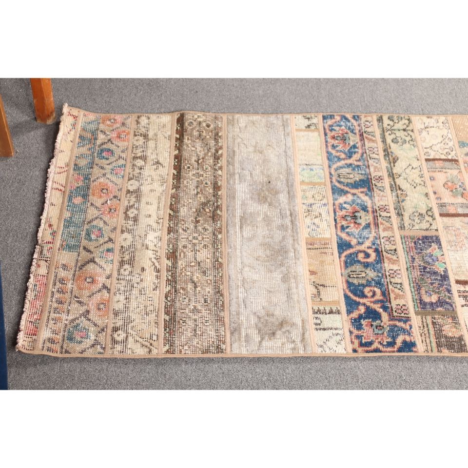 พรมตุรกีลายปะติดแบบวินเทจ ขนาด 2.6x9.5 ฟุต (78x290 ซม.) สีเบจลายดอกไม้
