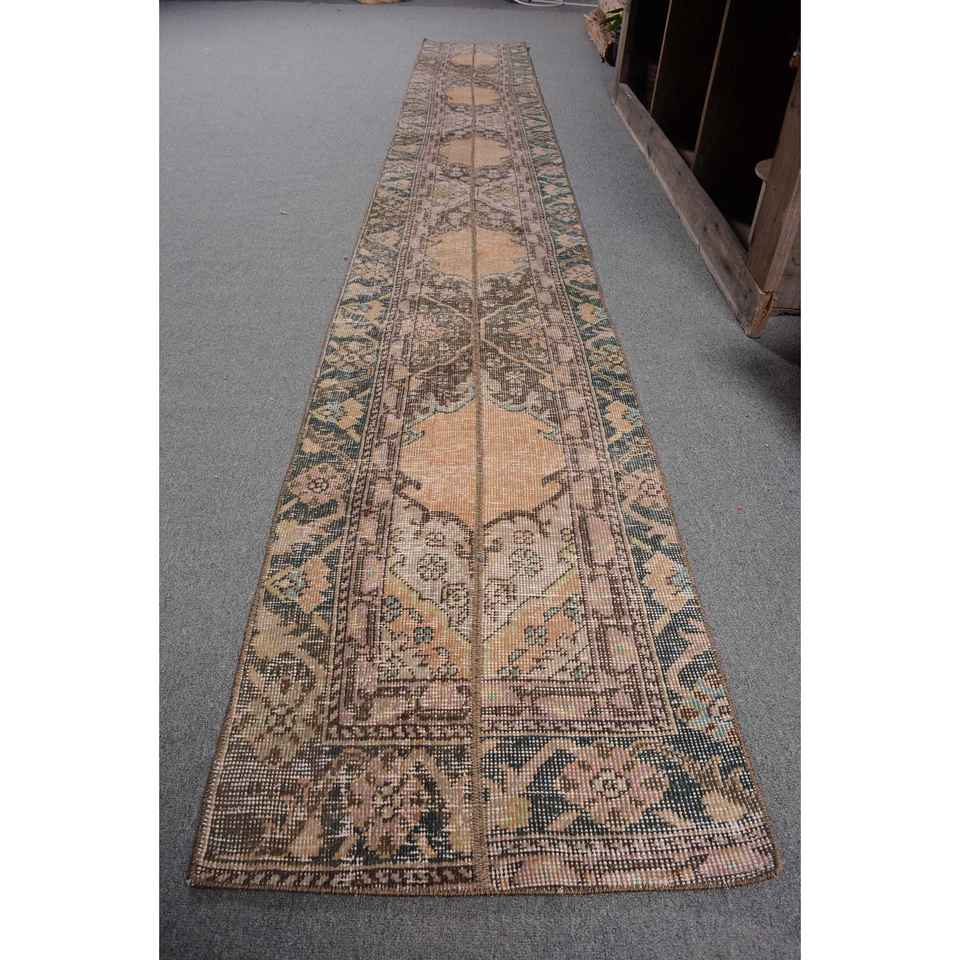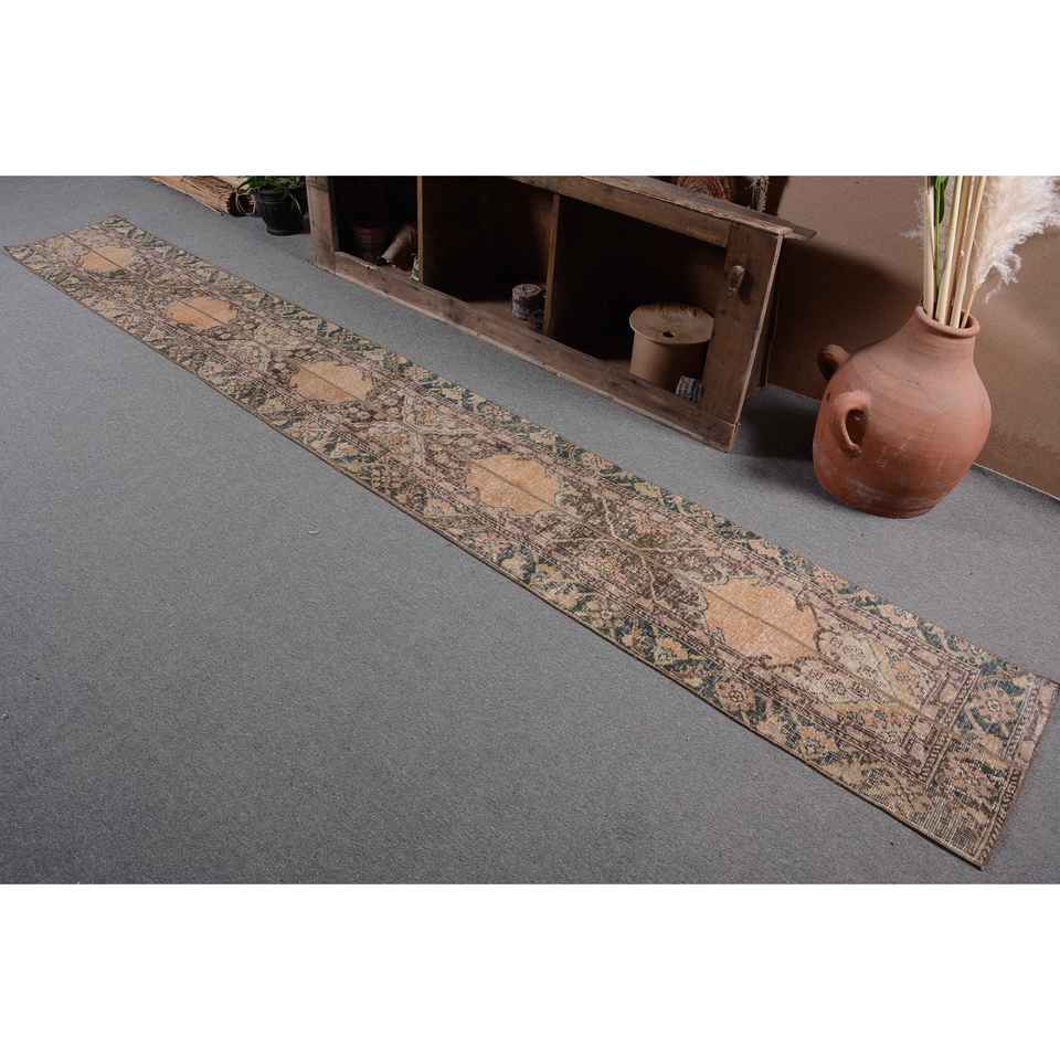 พรมตุรกีโบราณ1.7 x 12.6ft เบจขนสัตว์แฮนด์เมดพื้นที่ขนาดใหญ่งานเย็บปะดีไซน์สี่เหลี่ยมโถงทางเดินสำหรับห้องนั่งเล่น
