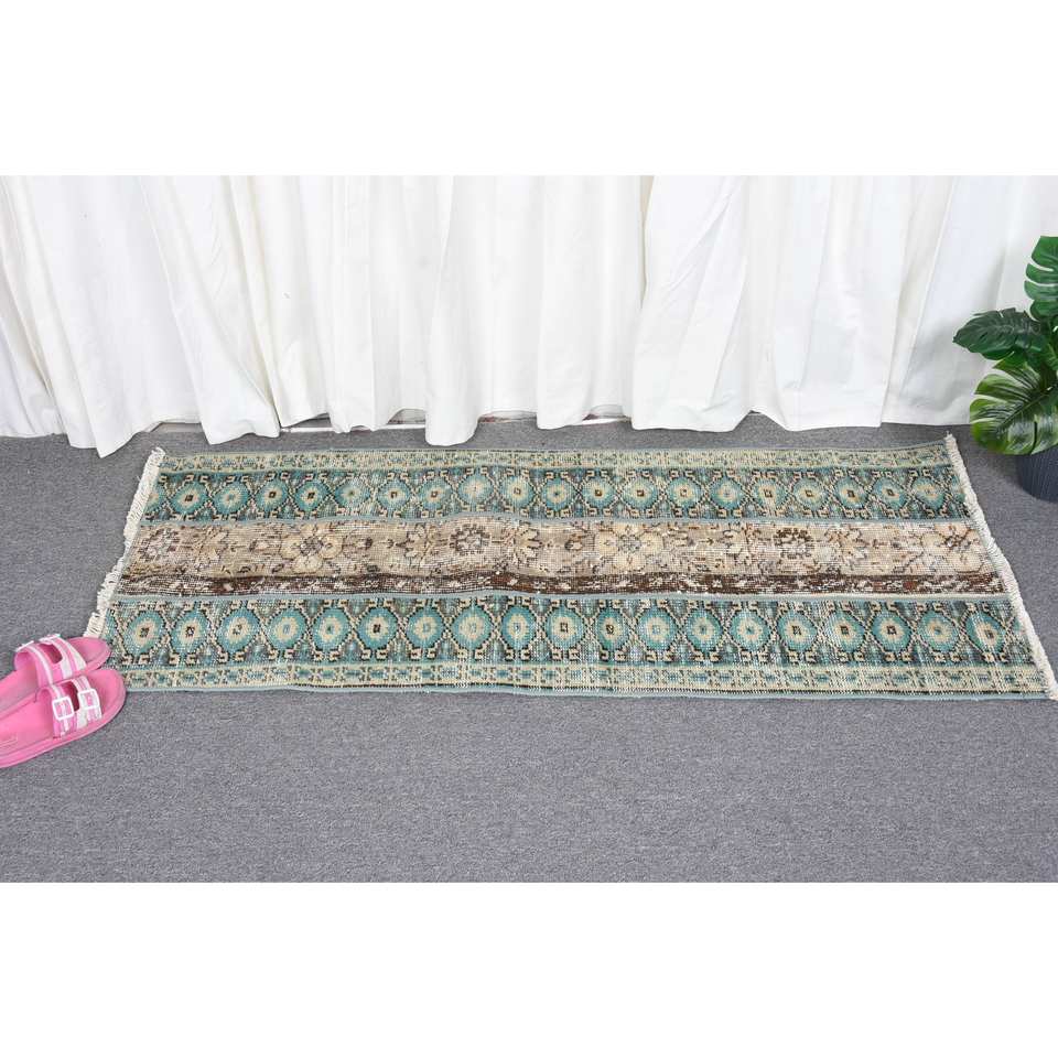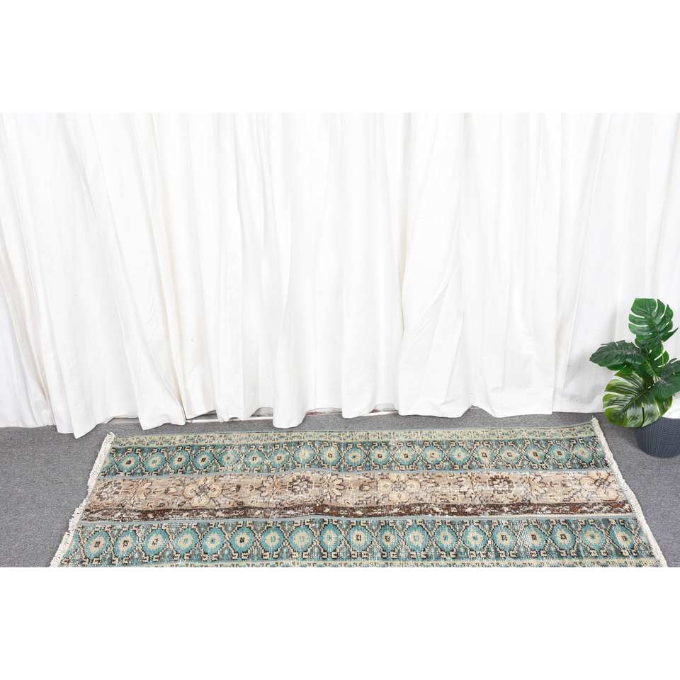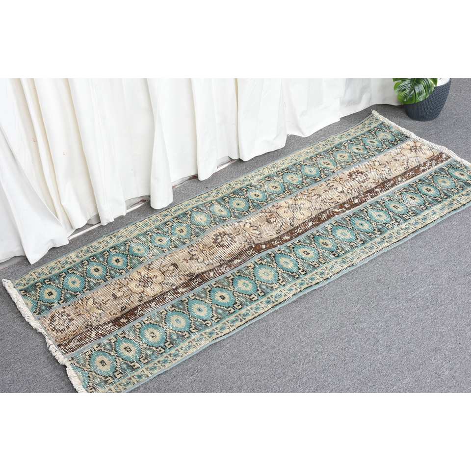 พรมตุรกีโบราณ19x46ฟุตพรมขนสัตว์สีเบจสีฟ้าแบบดั้งเดิมผ้าต่อผ้าทอสี่เหลี่ยมผืนผ้าโถงทางเดิน