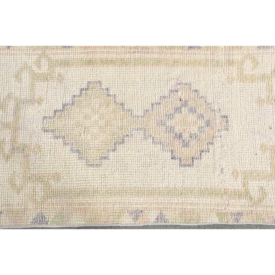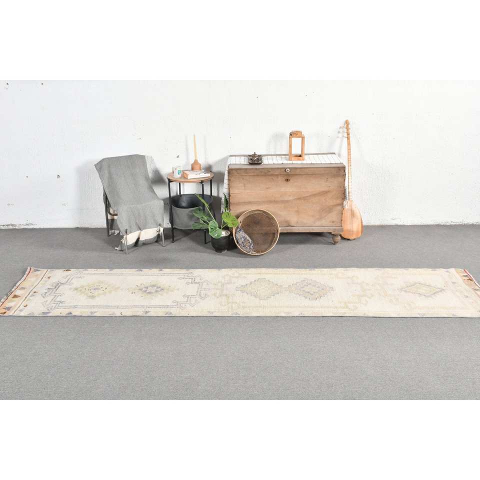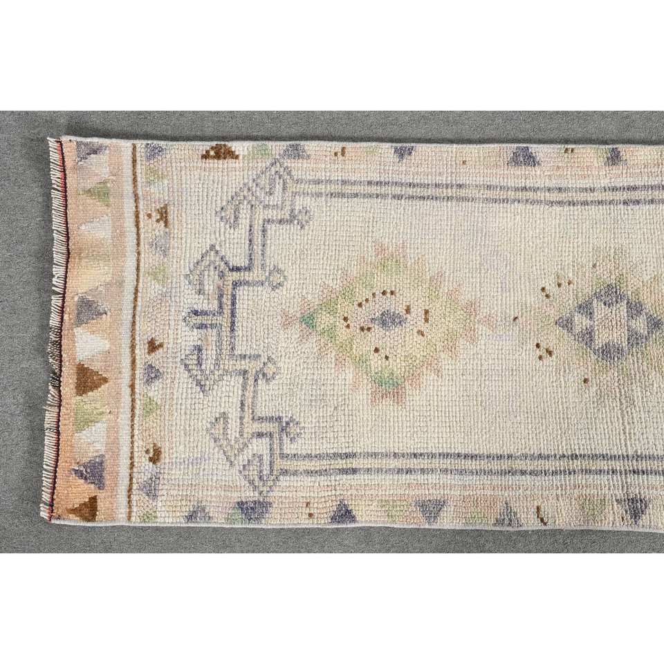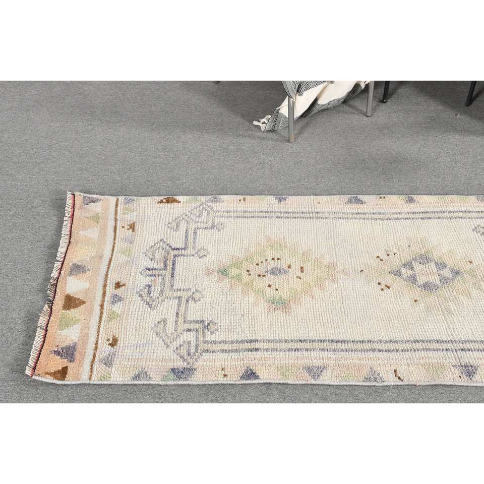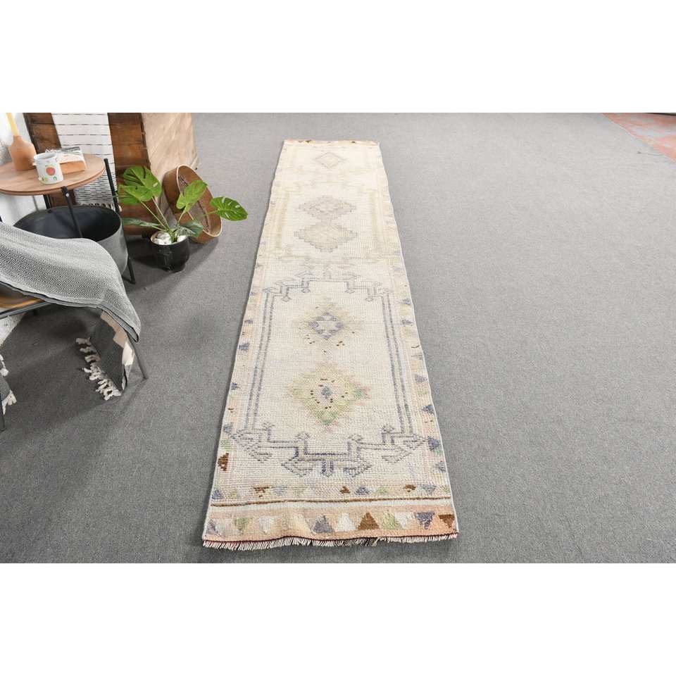 พรมตุรกีโบราณ2.4 x 11.5ft เบจขนสัตว์สานแบนพร้อมลวดลายปริศนาและยางรองดีไซน์ห้องโถงทรงสี่เหลี่ยมผืนผ้า