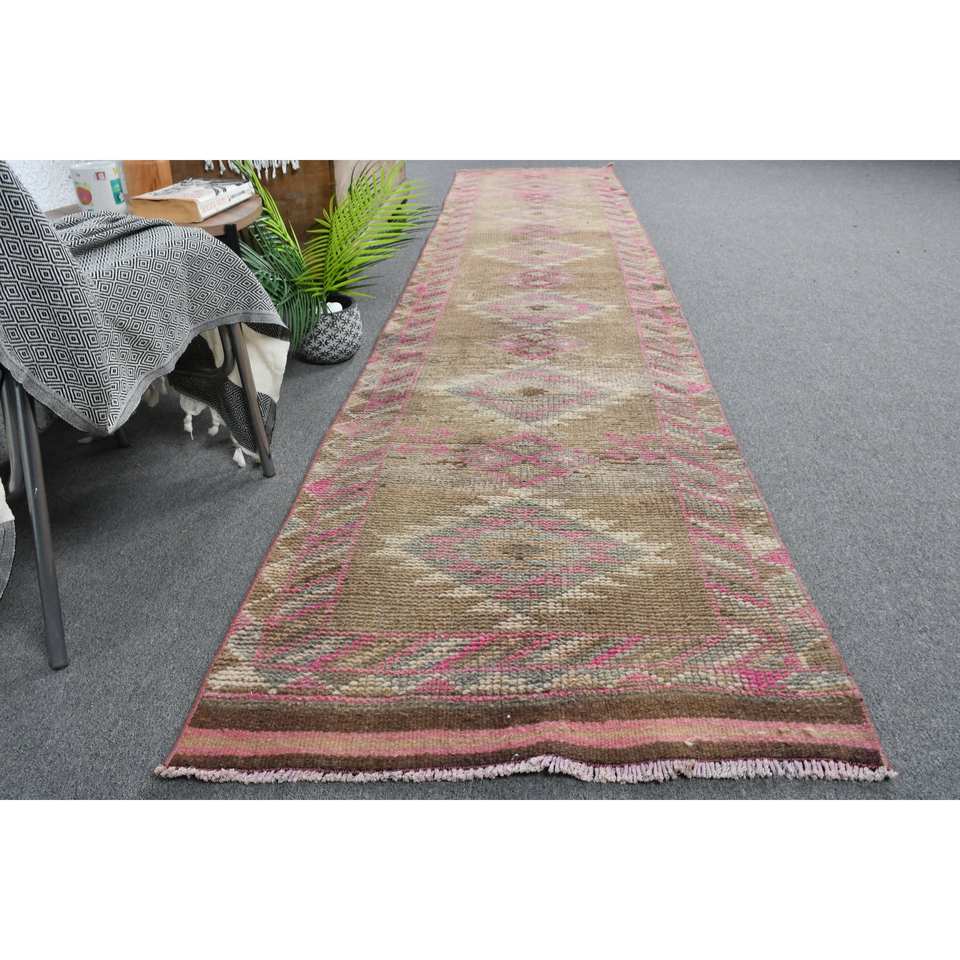 พรมตุรกีโบราณ2.6 x 11.8ft พื้นที่ขนาดใหญ่สีน้ำตาลชมพูปะต่อออกแบบวัสดุขนสัตว์ด้านหลังยางแอบสแตรกต์ทรงสี่เหลี่ยมผืนผ้าโถงทางเดิน