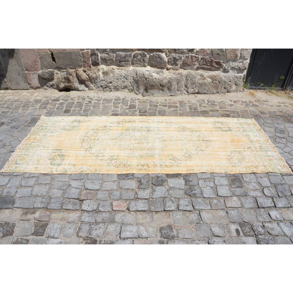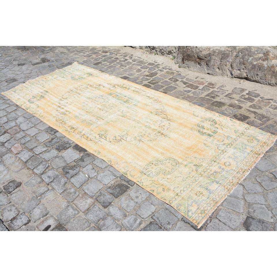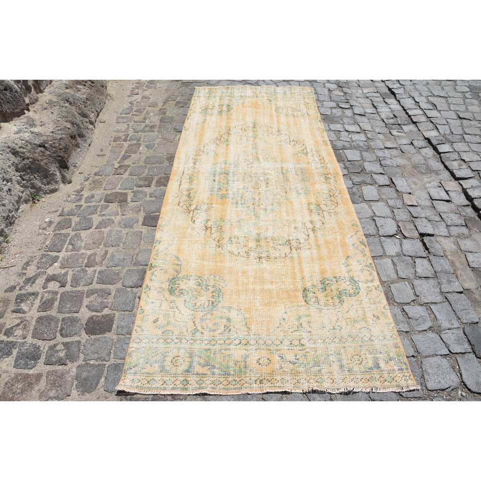 พรมขนสัตว์ตุรกีวินเทจ9.8ft 3.7 x ลวดลายปะต่อสีเหลืองสีเขียวสานแบนด้วยยางรองสำหรับห้องนั่งเล่นตกแต่งห้องโถง