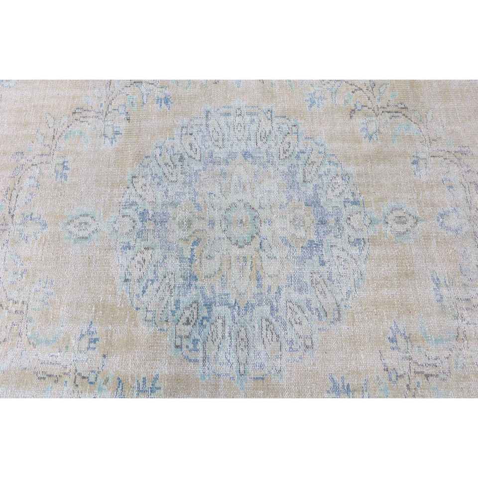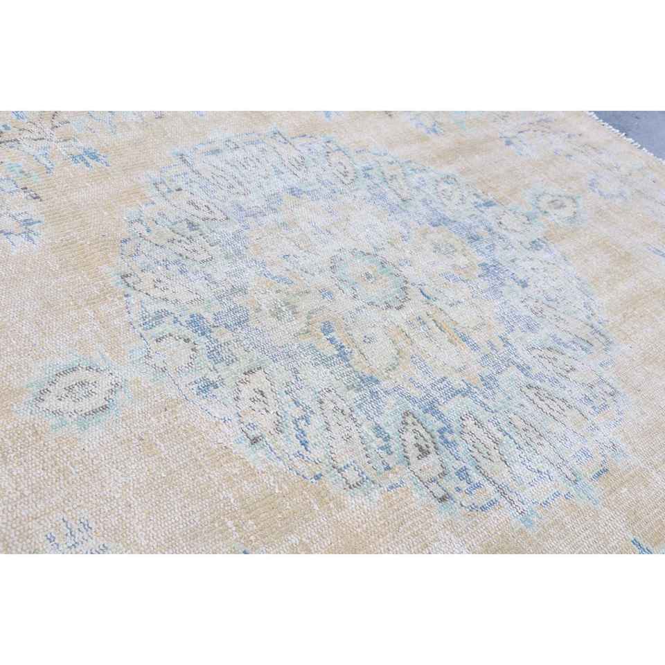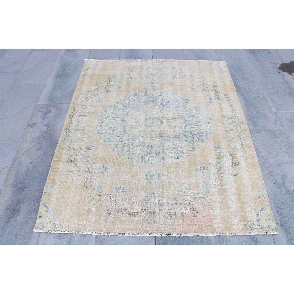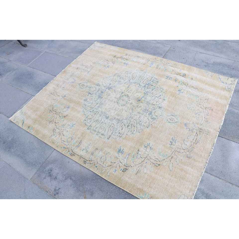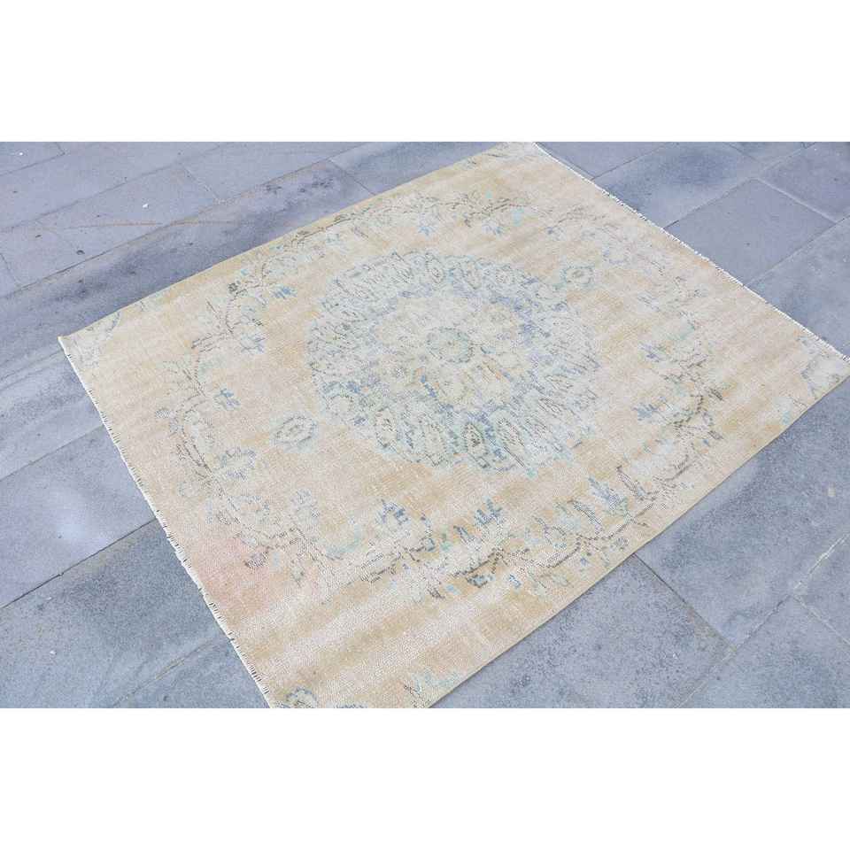 พรมตุรกีวินเทจ ขนาด 4.2x5 ฟุต สีเบจ ลายพิมพ์นามธรรม ทำจากขนสัตว์
