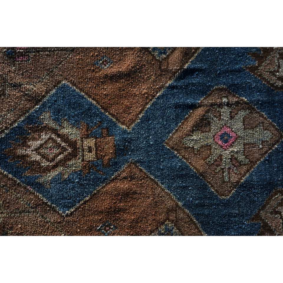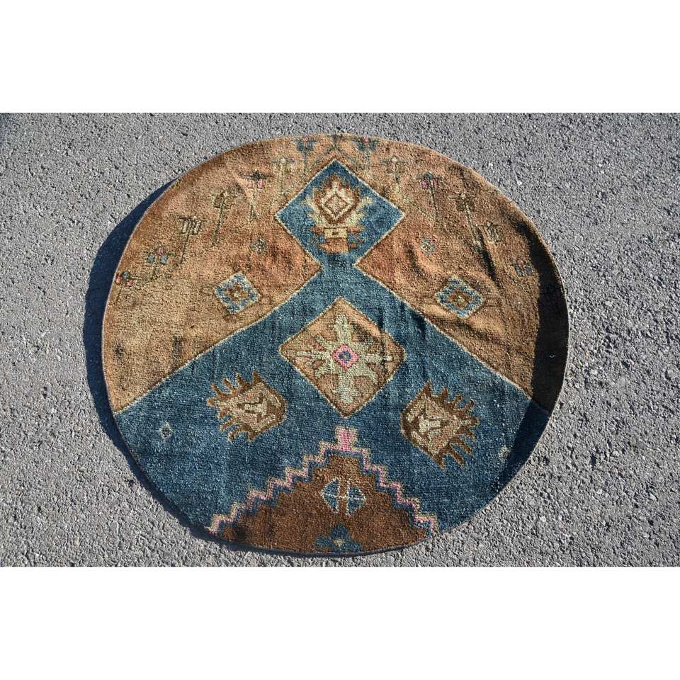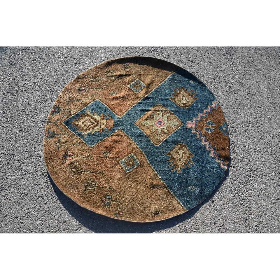 พรมตุรกีวินเทจ4.3 x 4.3ft สีฟ้าสีน้ำตาลงานเย็บปะติดปะต่อกันดีไซน์ขนสัตว์ทำมือพร้อมแผ่นยางรองสำหรับห้องนั่งเล่นวัยรุ่น