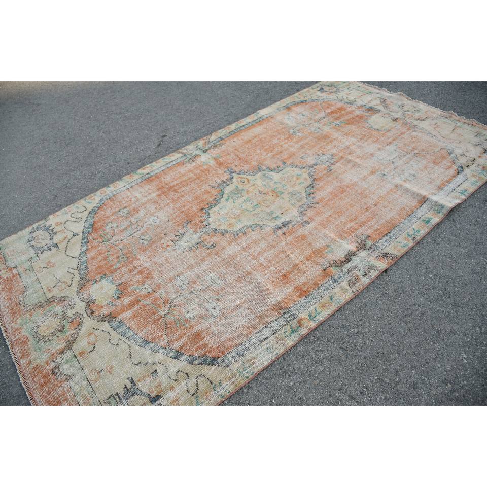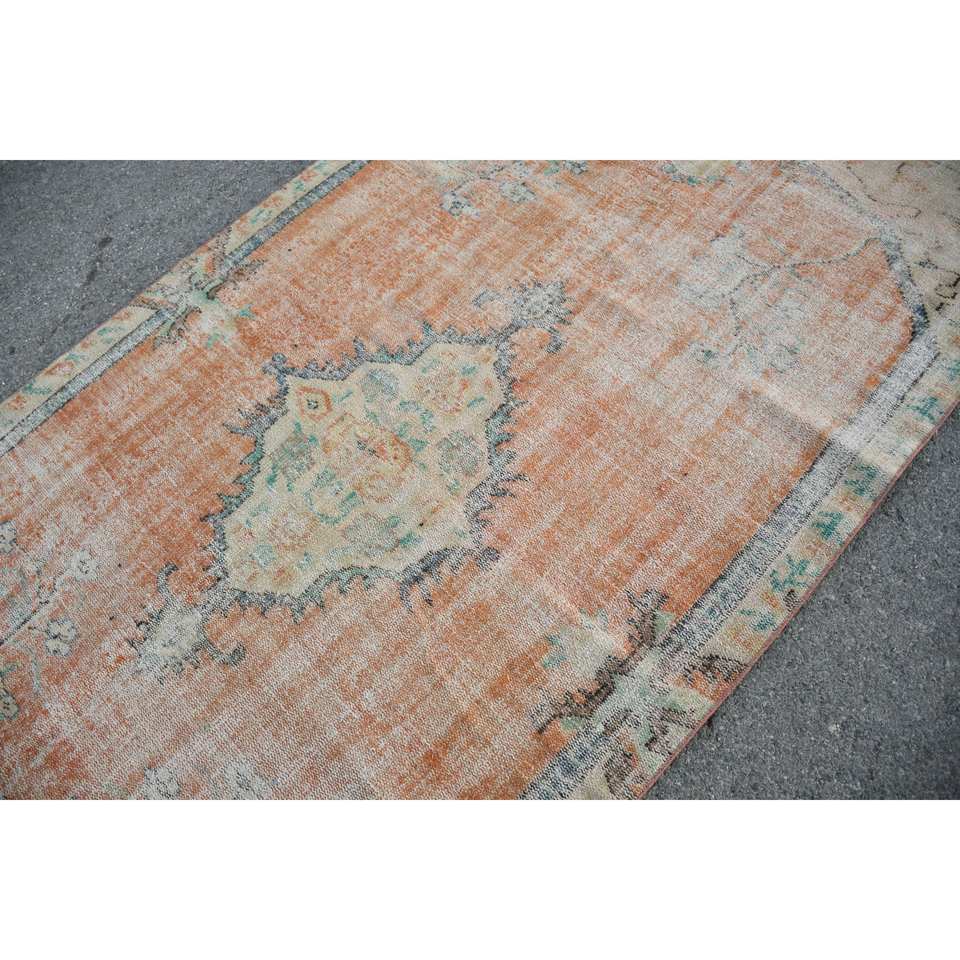 พรมตุรกีวินเทจขนาด5.1x9.6ฟุตผ้าทอสีเบจสีส้มแบนลายเย็บปะติดปะต่อกันสำหรับห้องนั่งเล่นตกแต่งห้องโถง