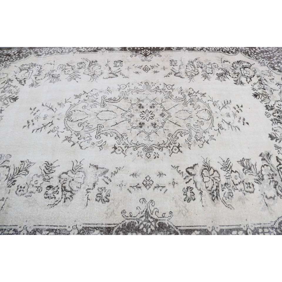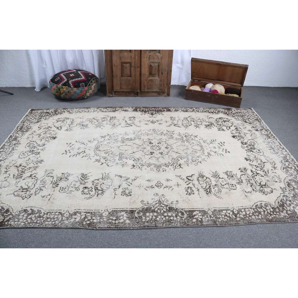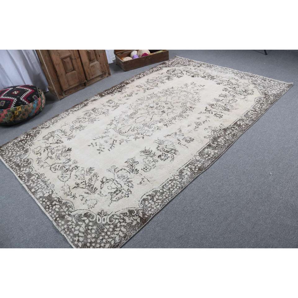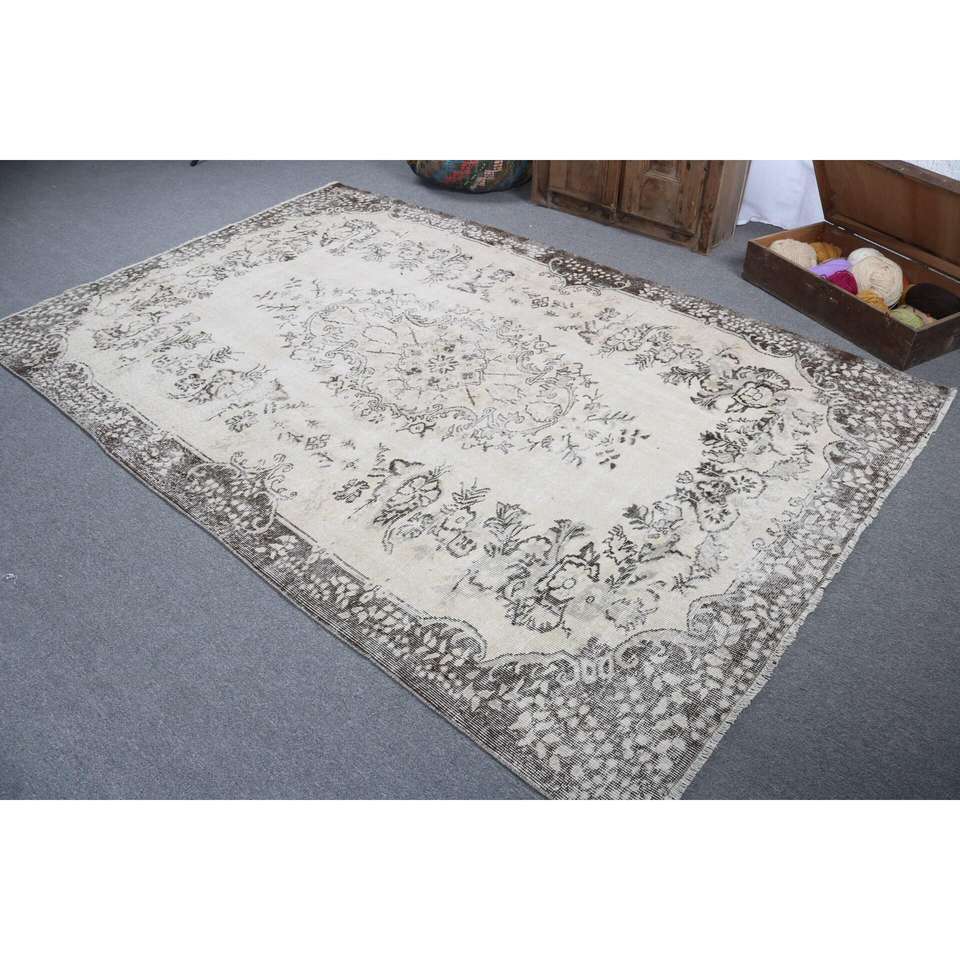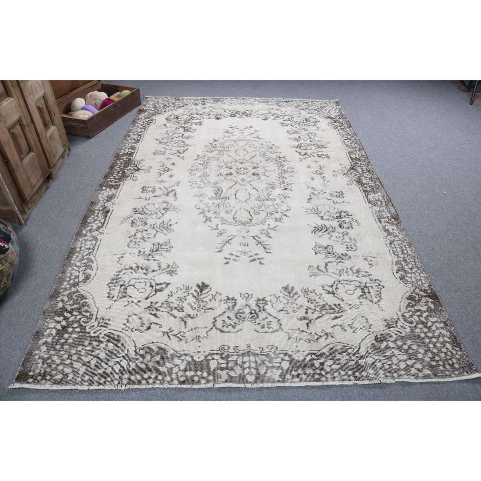 พรมตุรกีวินเทจ ขนาดใหญ่ 5.9x9.2 ฟุต พรมขนสัตว์ลายดอกไม้สีขาวเทา