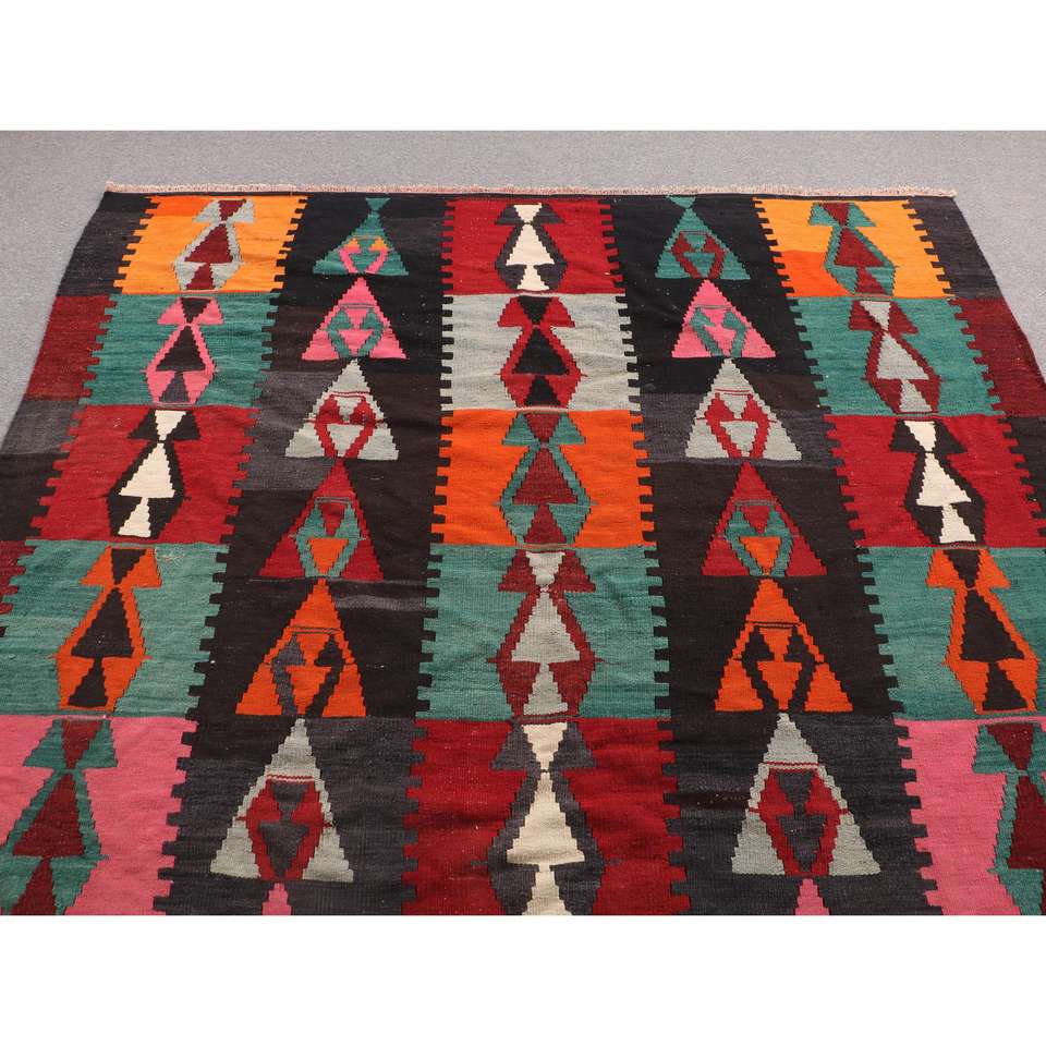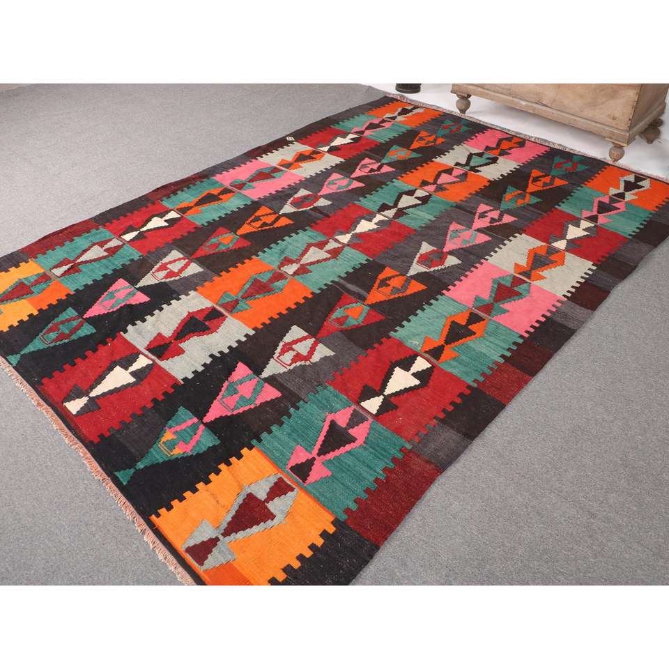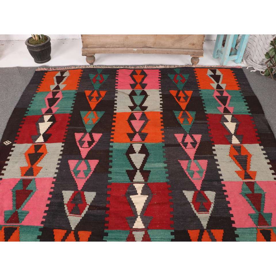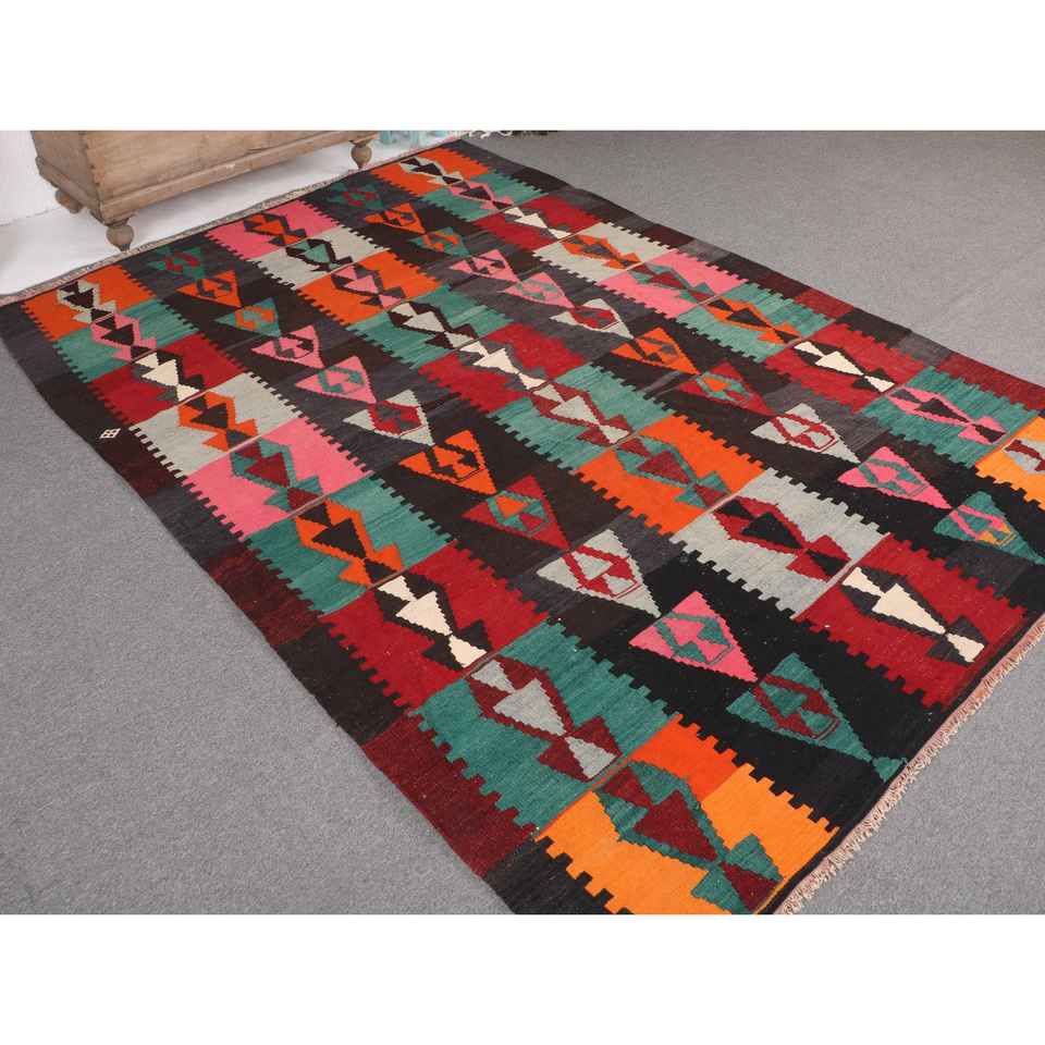 พรมตุรกีวินเทจ ขนาด 6.2x8.9 ฟุต พรมคิลิมสีแดง พรมขอบใหญ่