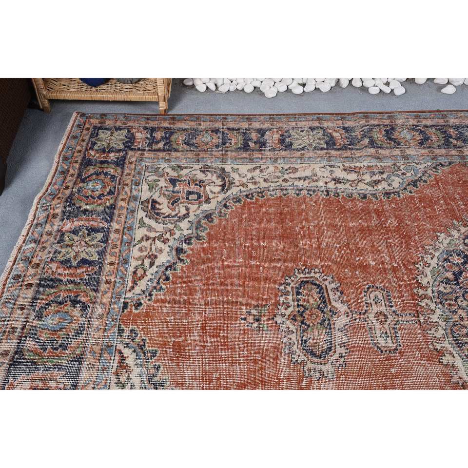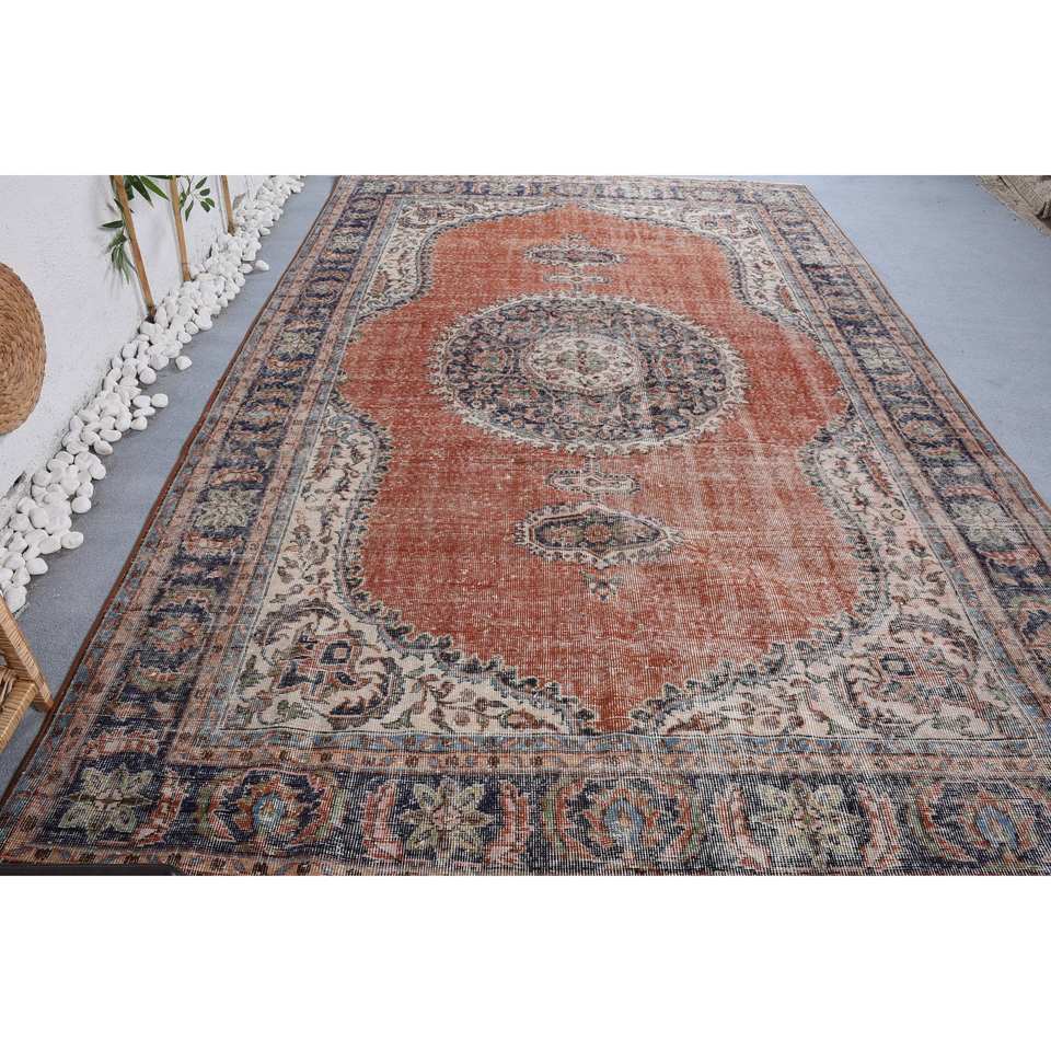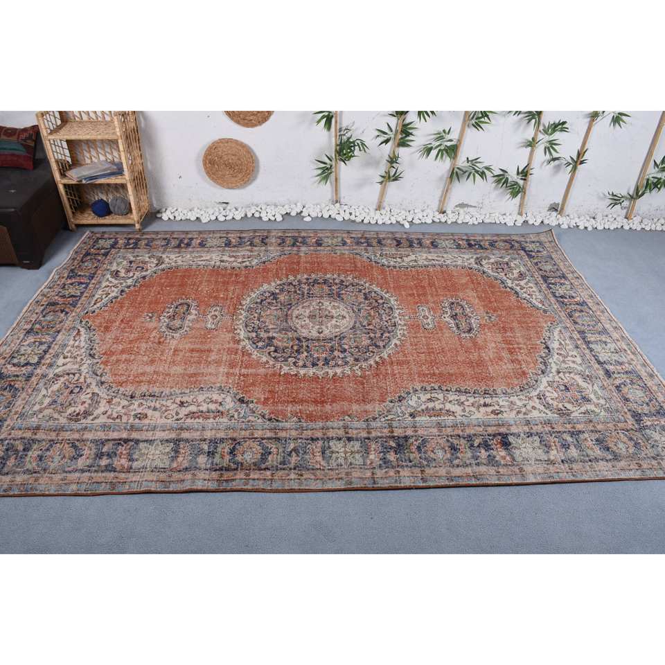 พรมสไตล์ตุรกีโบราณ6.9 x 10.8ft ผ้าวูลสีส้มน้ำเงินแบบเย็บปะติดสำหรับตกแต่งห้องนั่งเล่น