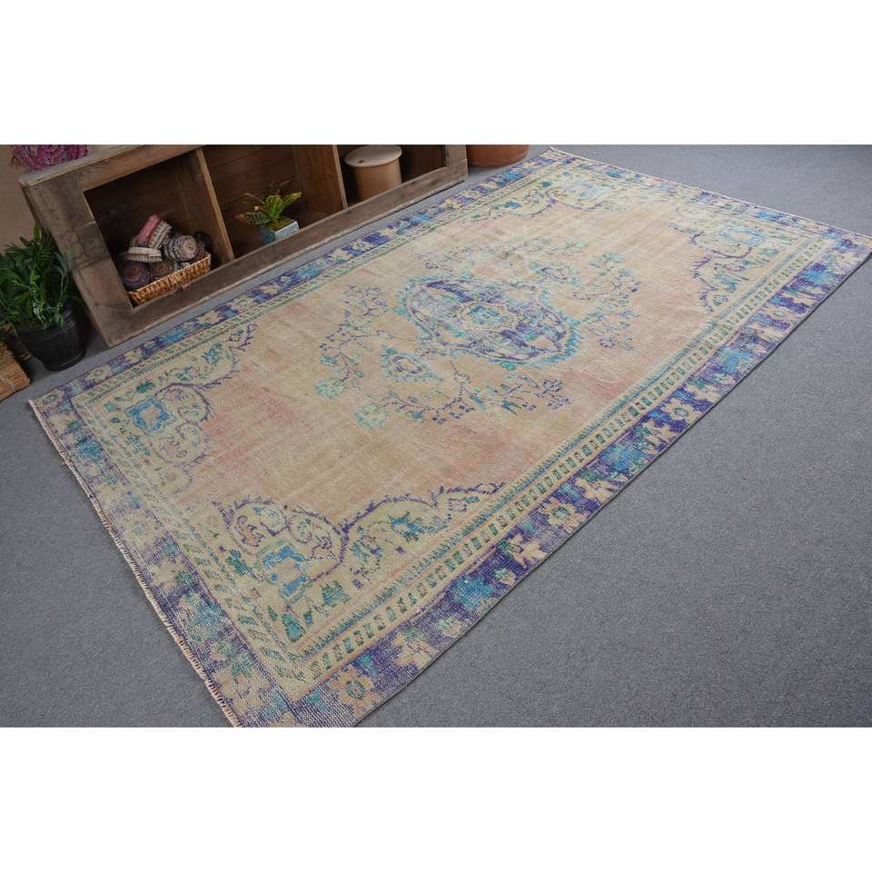 พรมตุรกีวินเทจขนแกะสีเบจสีฟ้า5.6 x 8.9ft แบนถักลายสำหรับตกแต่งห้องนั่งเล่นห้องโถงใช้น้ำยาง