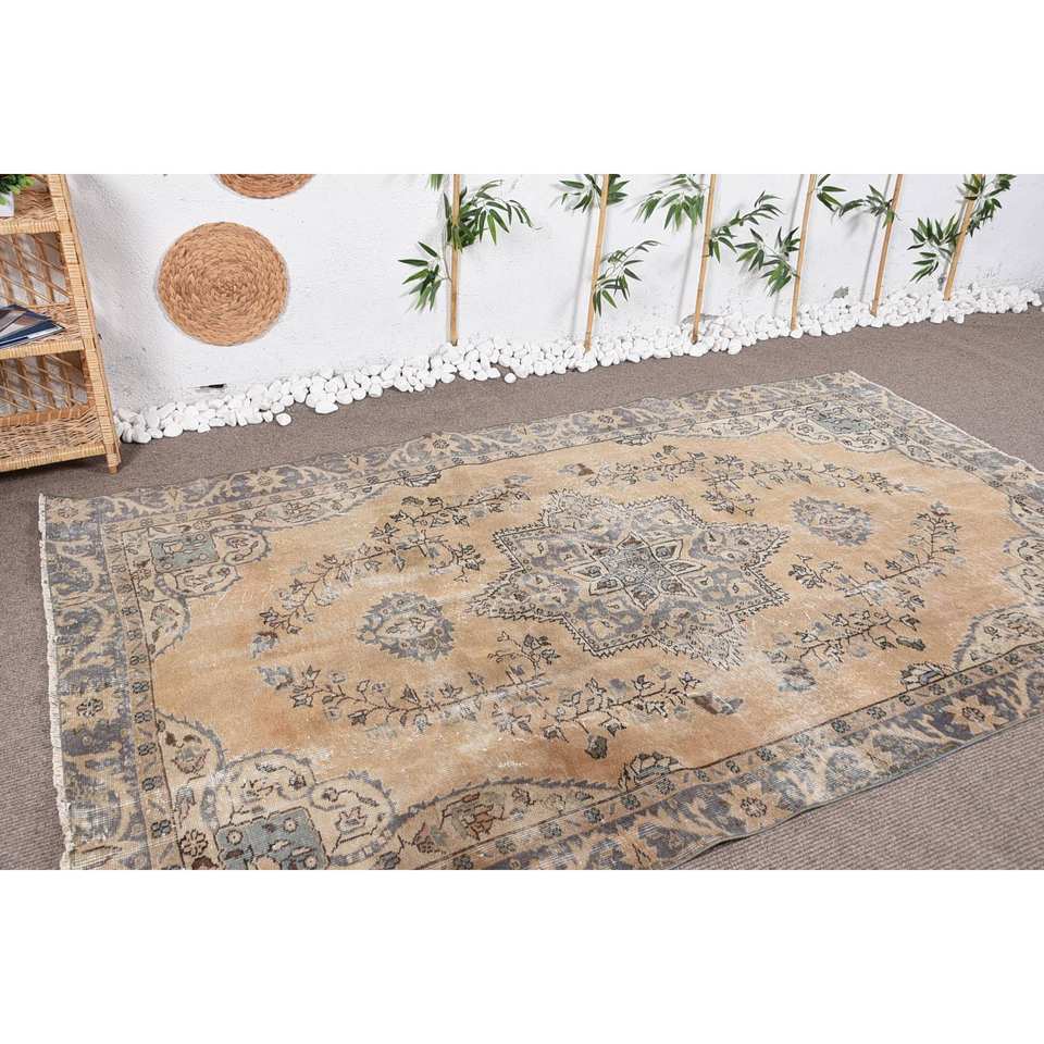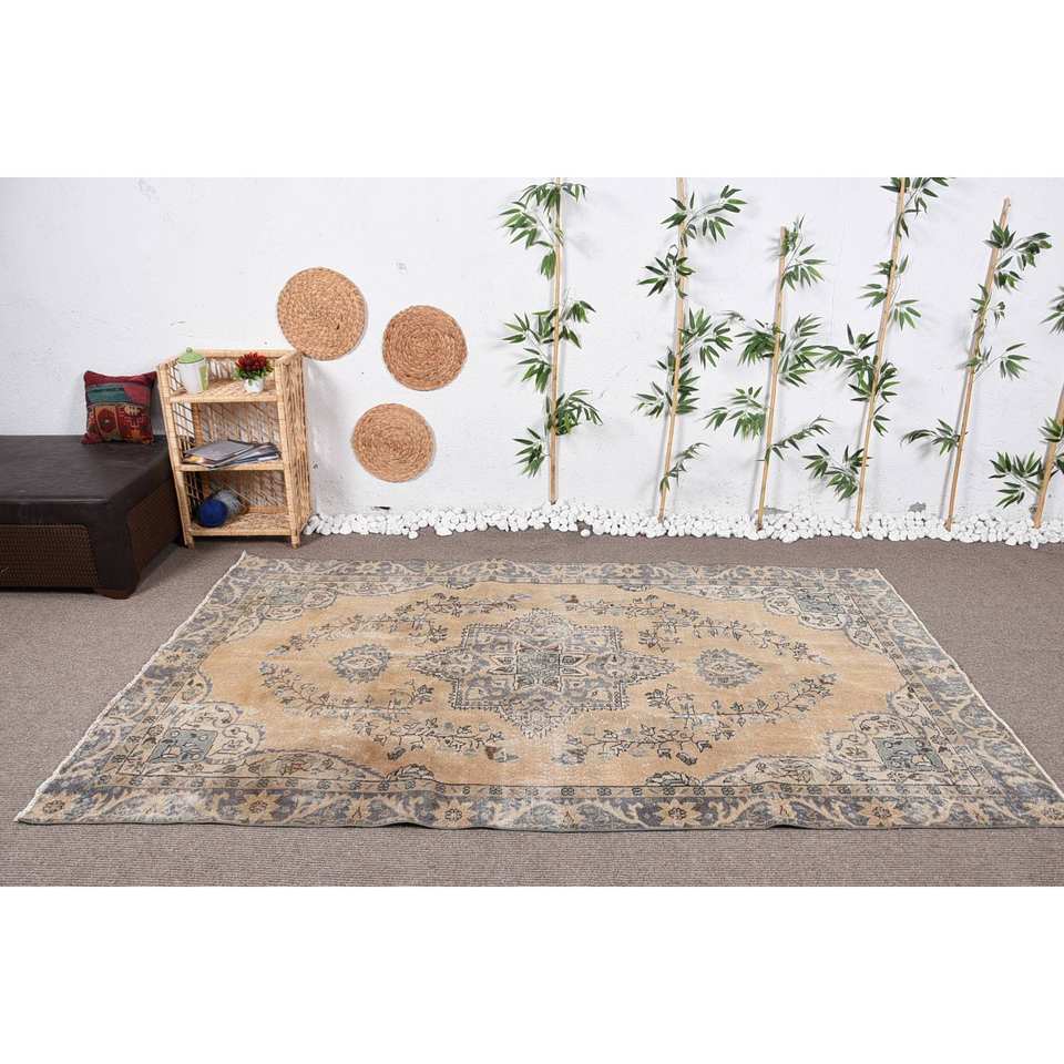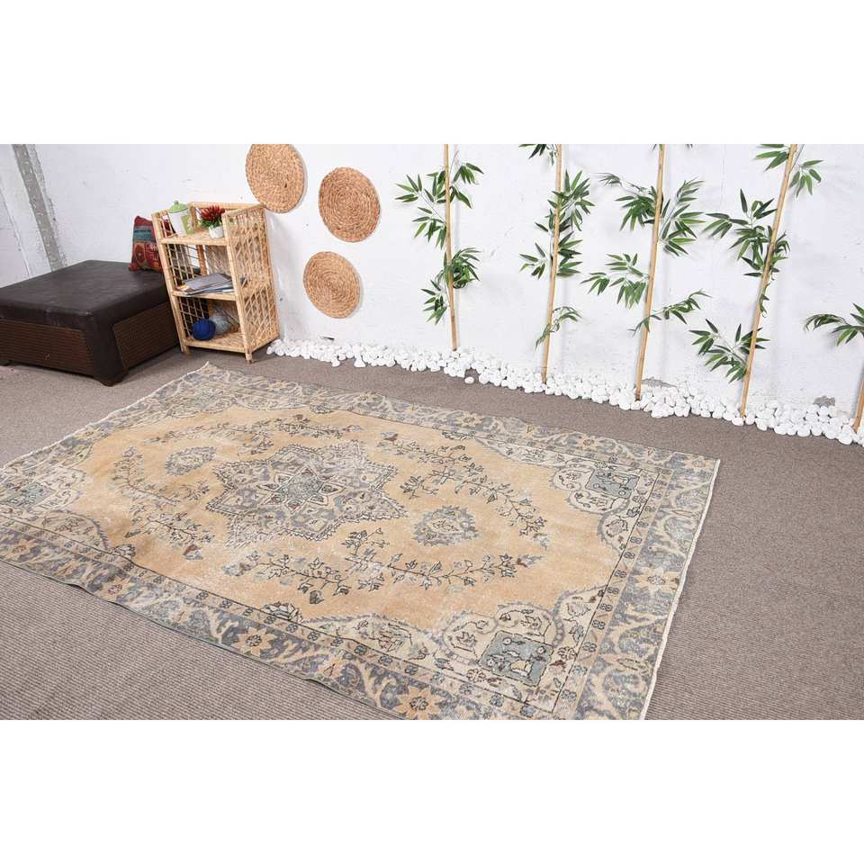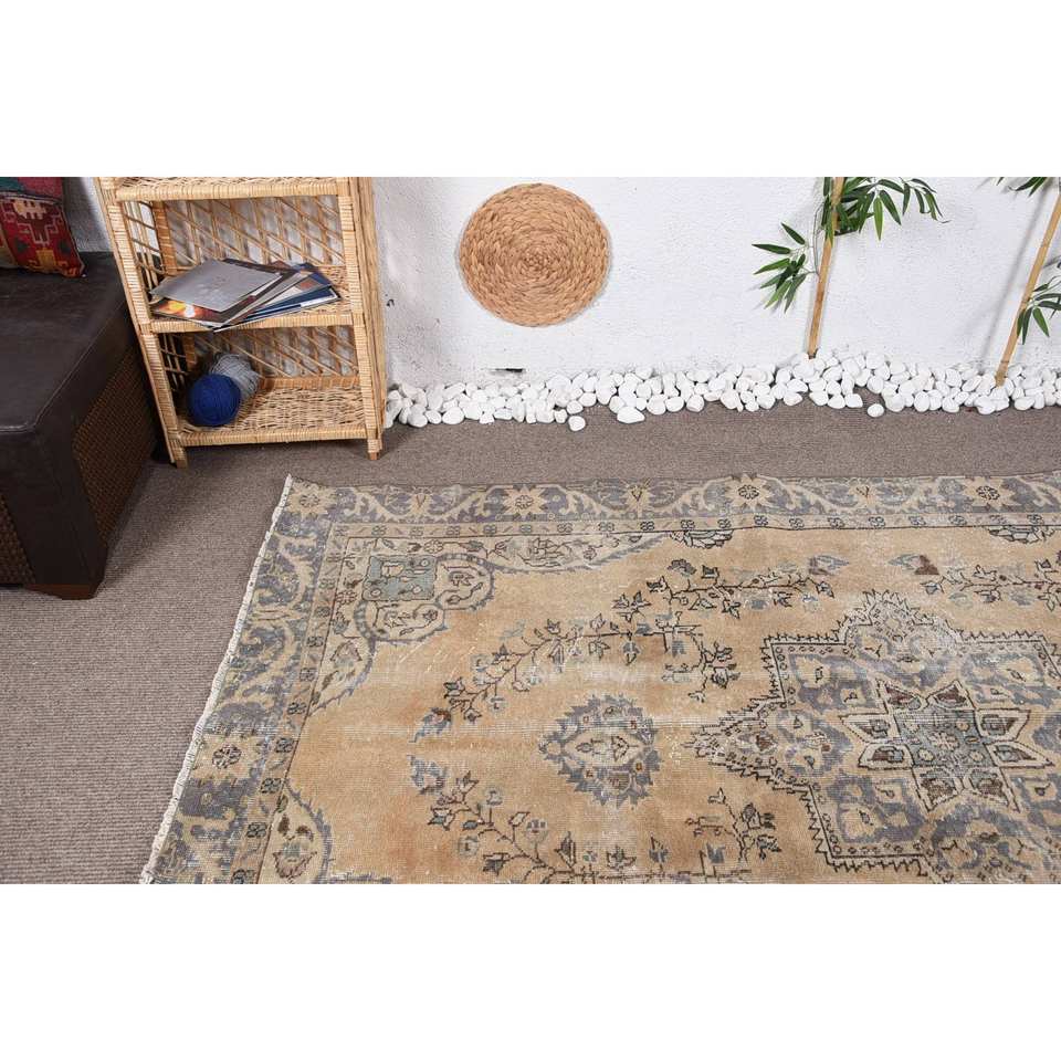 พรมตุรกีวินเทจผ้ากำมะหยี่สีเบจสีฟ้า5.4 x 8.7ft แฮนด์เมดสไตล์ทาบริซผ้าขนสัตว์โพลีเอสเตอร์เย็บปะติดปะต่อกันดีไซน์สี่เหลี่ยมโถงทางเดิน