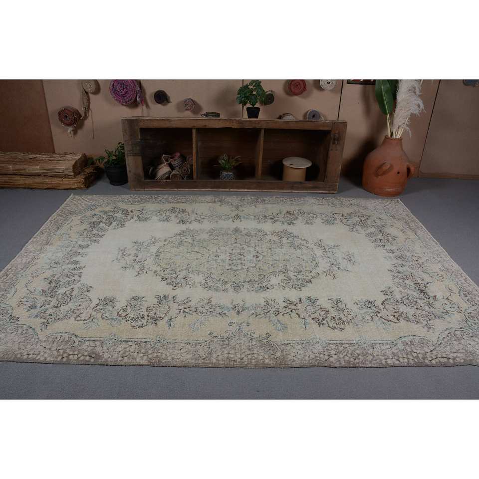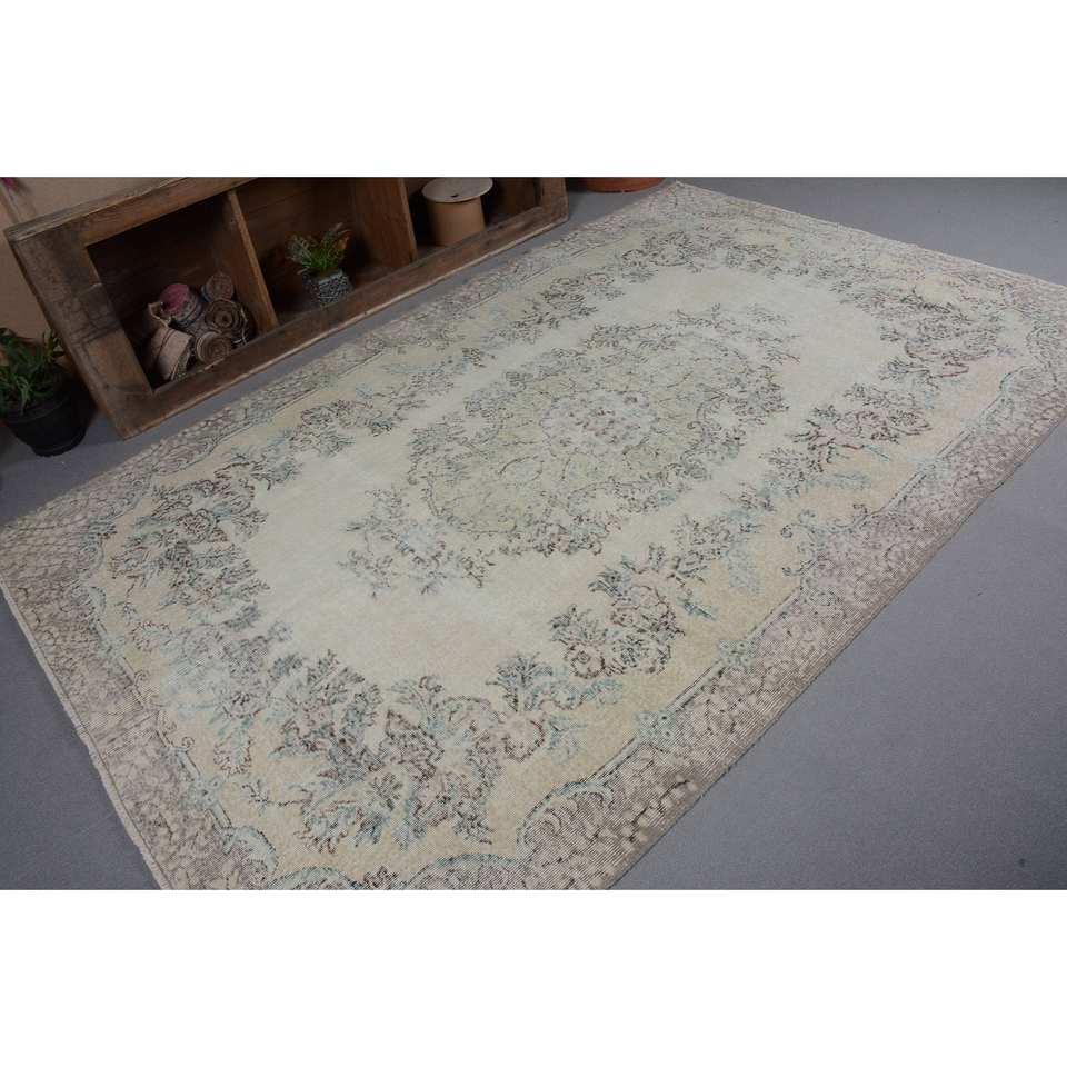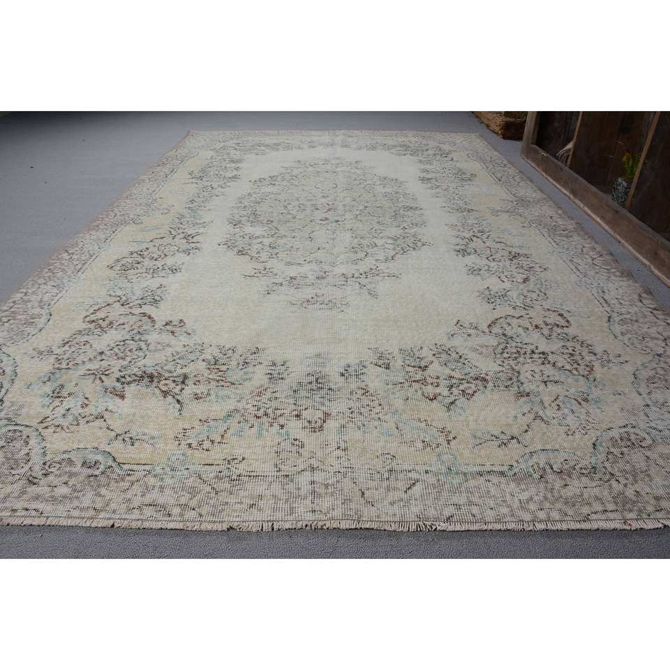 พรมตุรกีวินเทจขนแกะสีเบจสีฟ้า6.1 x 9.3ft แบนถักลายสำหรับตกแต่งห้องนั่งเล่นห้องโถงใช้น้ำยาง