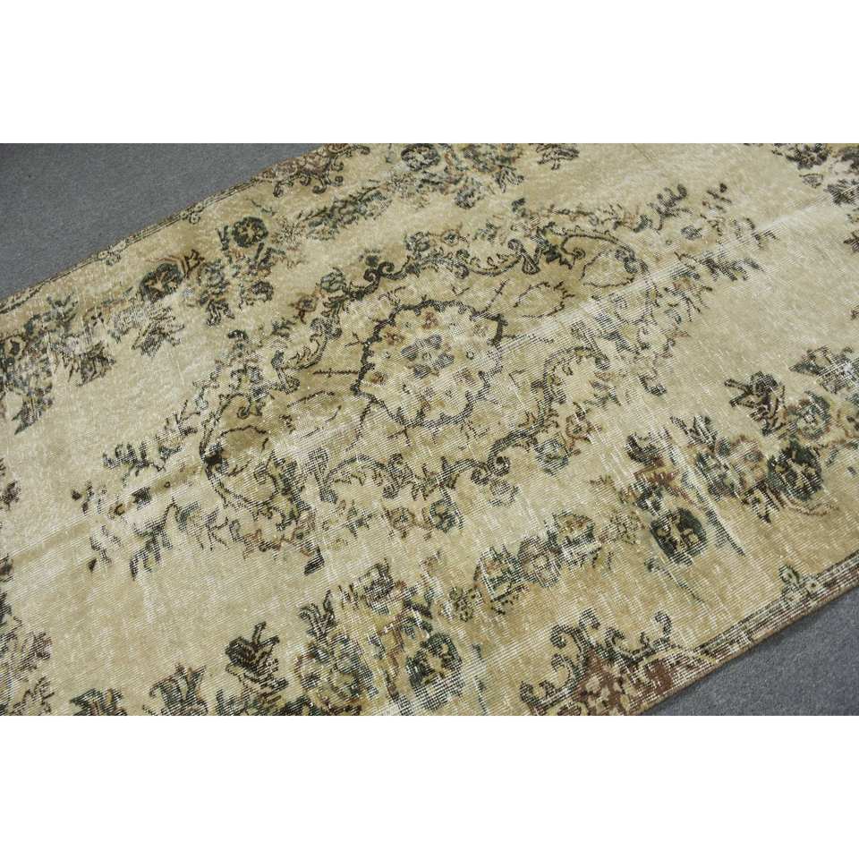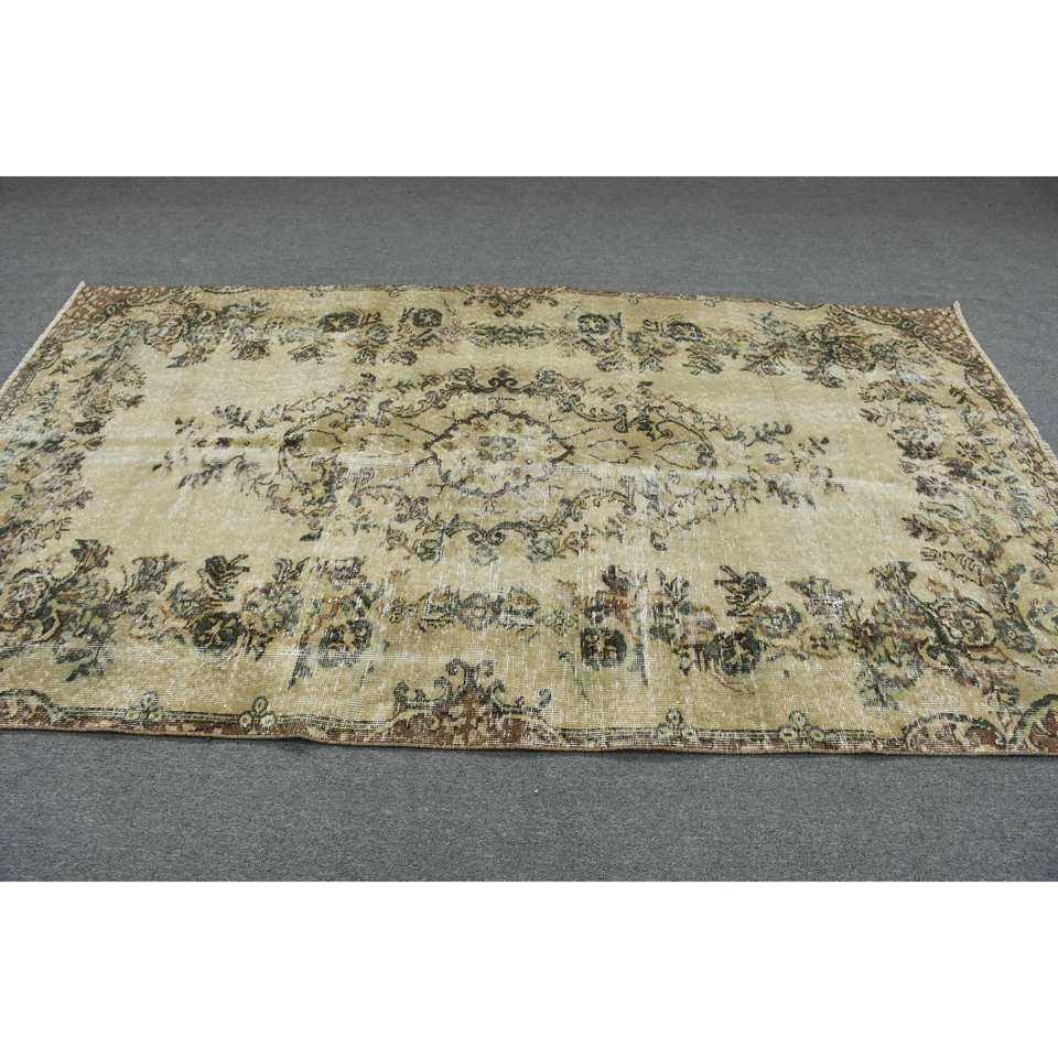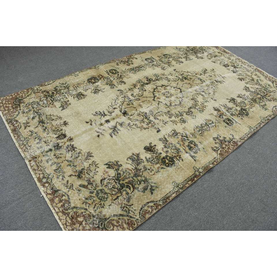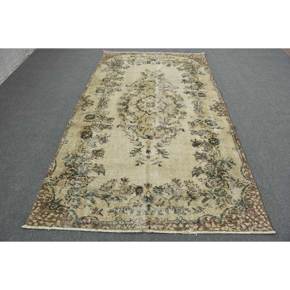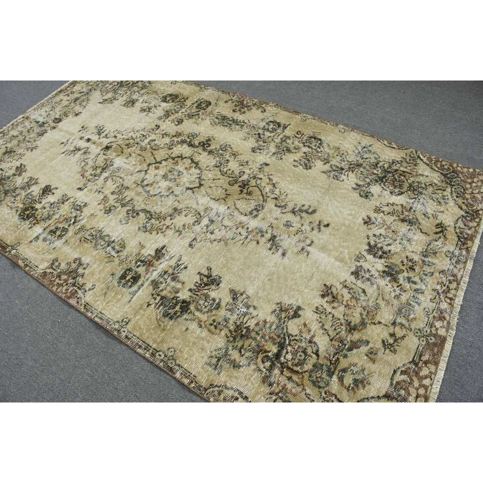 พรมตุรกีโบราณขนสีเบจ-น้ำตาล5x8.9ft แบนสานด้วยลวดลายเย็บปะติดปะต่อกันสำหรับตกแต่งห้องนั่งเล่นหรือใช้ในห้องโถง