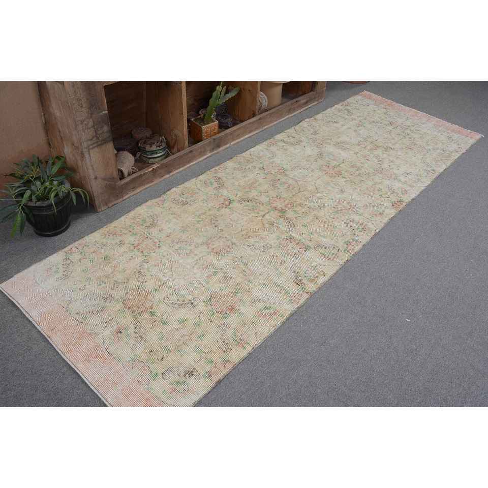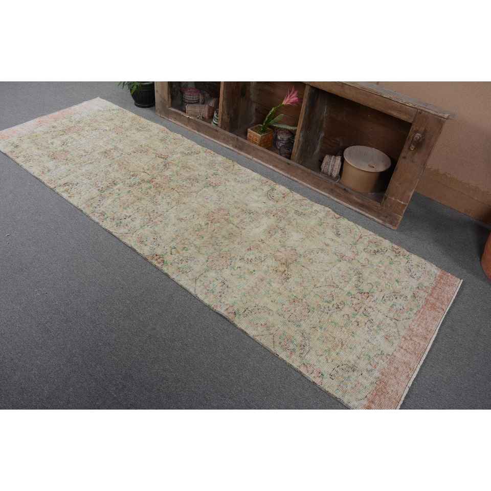 พรมตุรกีโบราณสีเบจสีเขียว3x8ft คลาสสิกสานเรียบการออกแบบการเย็บปะติดปะต่อกันวัสดุขนสัตว์ยางสำหรับตกแต่งห้องนั่งเล่น