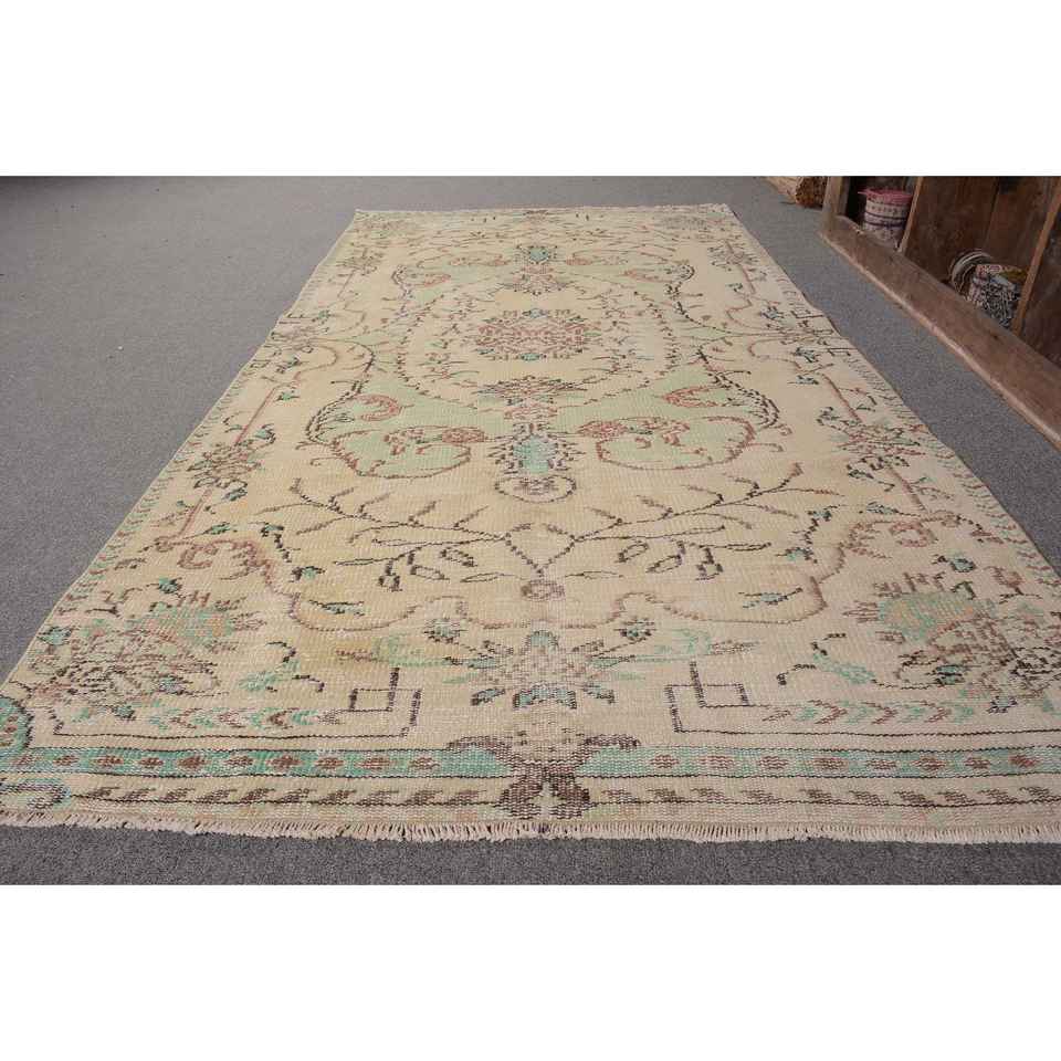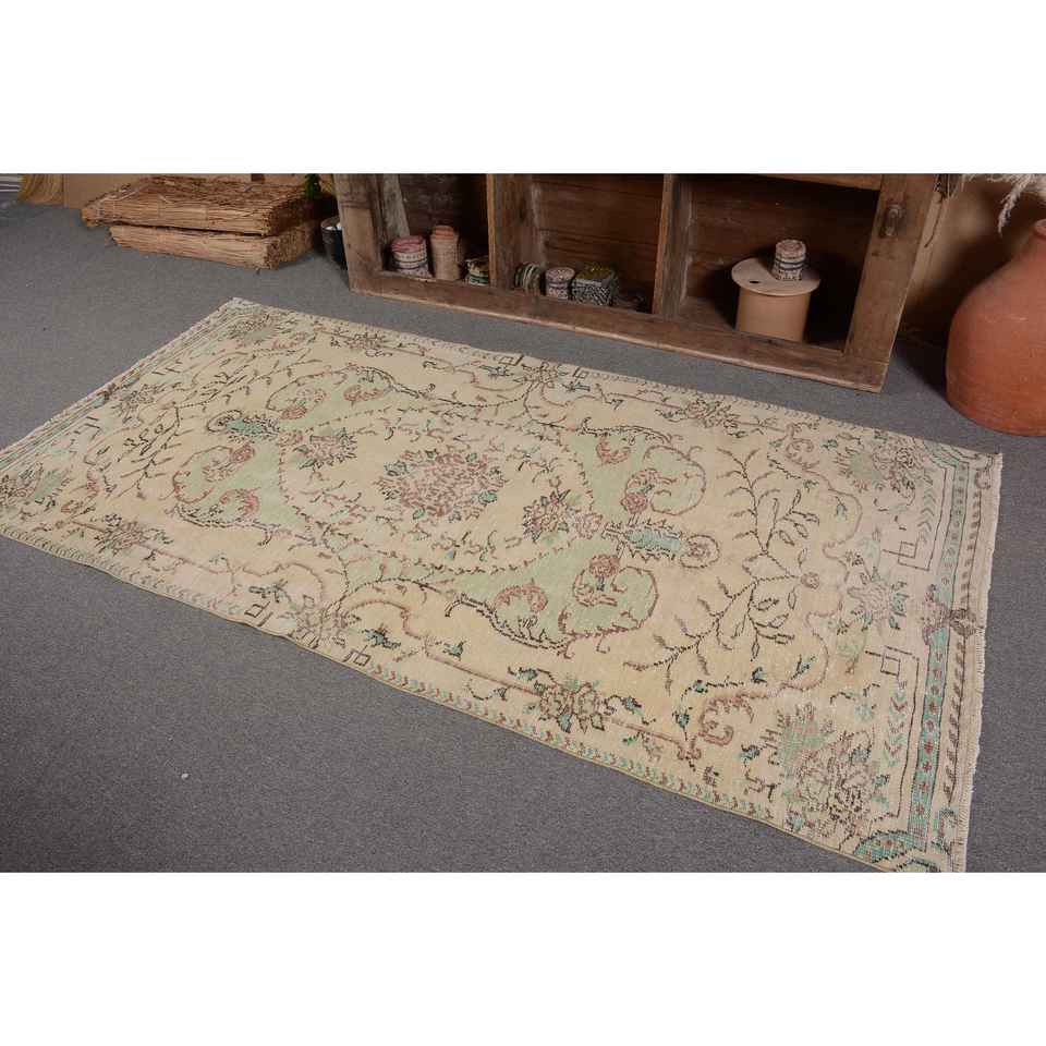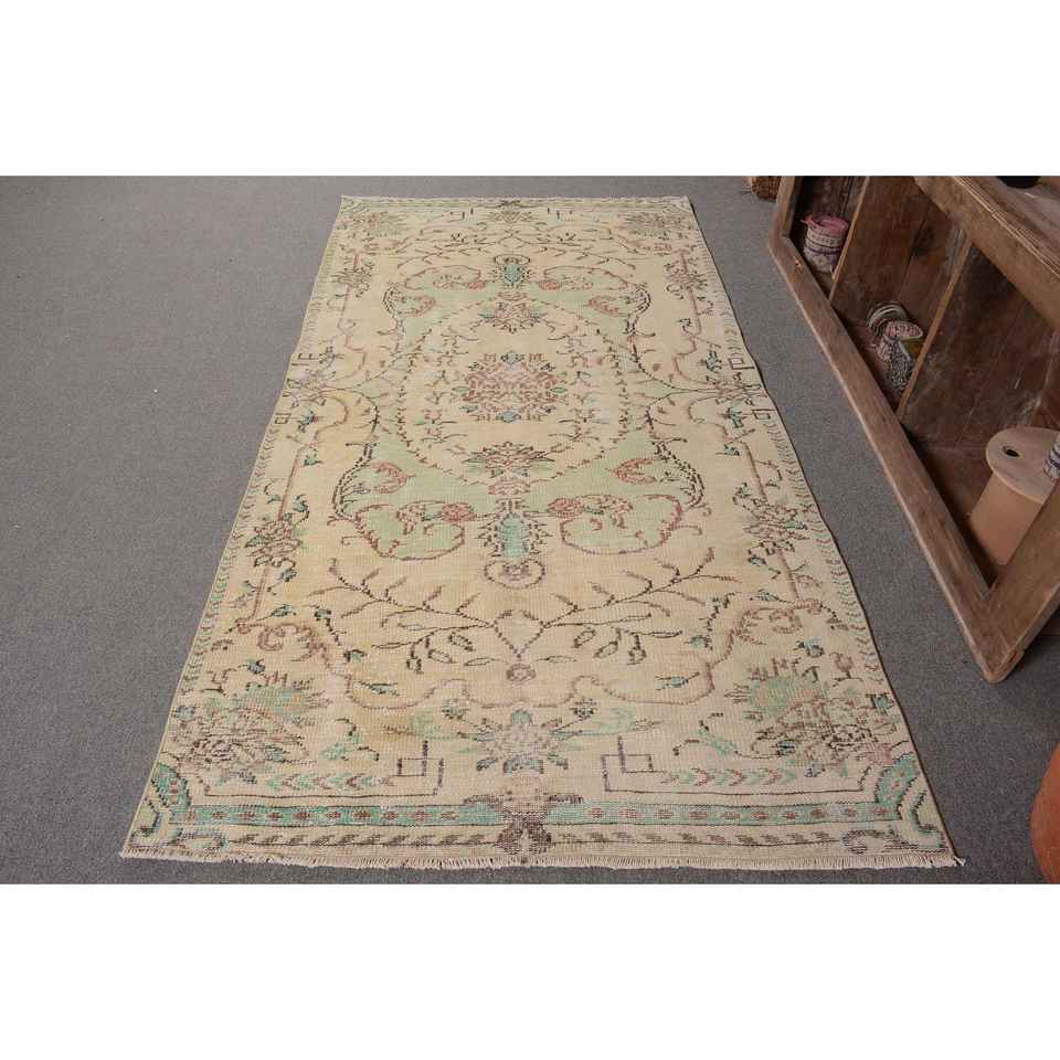 พรมตุรกีโบราณสีเบจสีเขียว4.1 x งานแฮนด์เมดพื้นที่ขนาดใหญ่งานเย็บปะติดดีไซน์สี่เหลี่ยมโถงทางเดินสำหรับห้อง