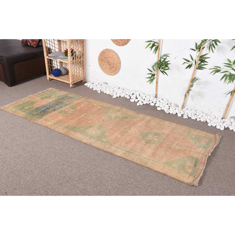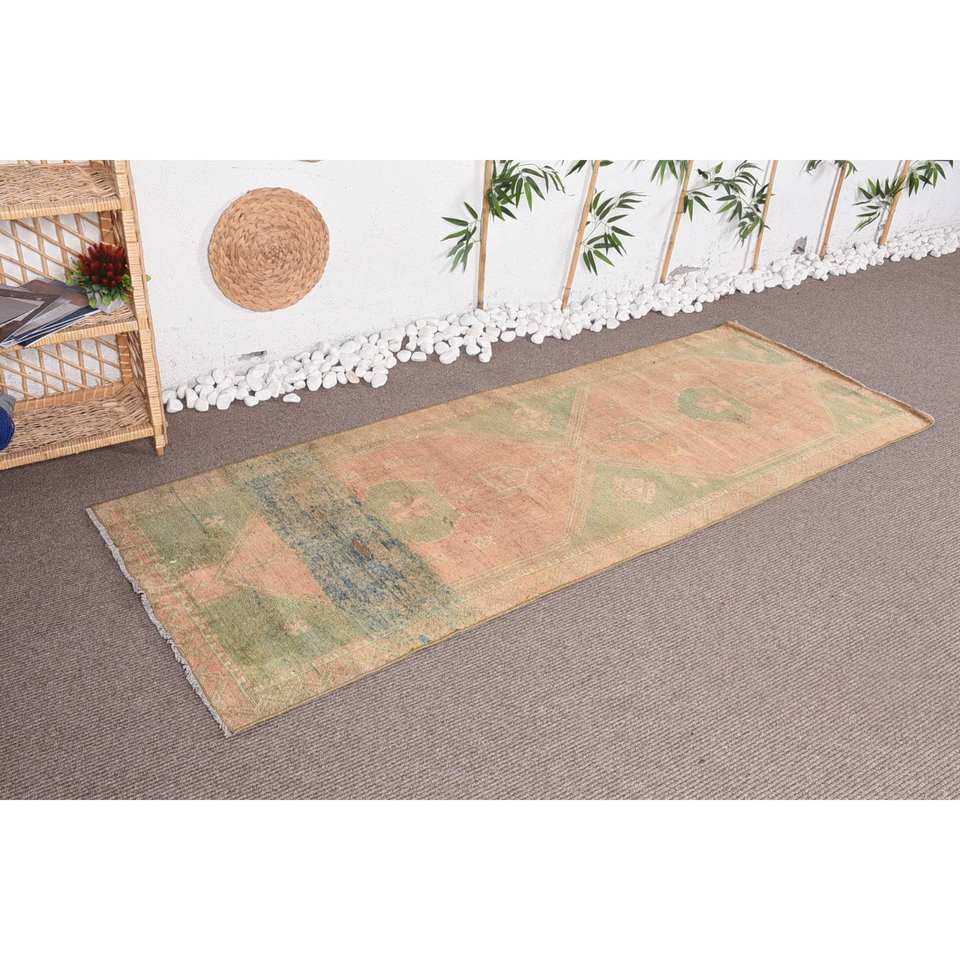 พรมสไตล์วินเทจสไตล์ตุรกีโบฮีเมียนสีเขียวเบจ2.7 x 7.5ft คลาสสิคพื้นที่ขนาดใหญ่สี่เหลี่ยมผืนผ้าการออกแบบการเย็บปะติดปะต่อกันวัสดุขนสัตว์น้ำยาง4เมตร
