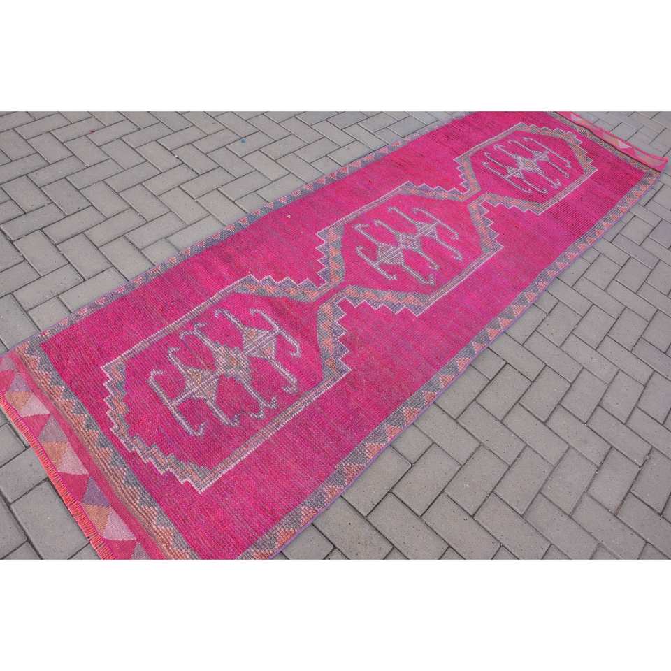 พรมตุรกีโบราณโบฮีเมียนสีชมพูสีเทาขนาด3.1x9.9ฟุตพรมขนสัตว์เย็บปะติดปะต่อกันขนาดใหญ่สำหรับห้องนั่งเล่นยางถักแบบคลาสสิก