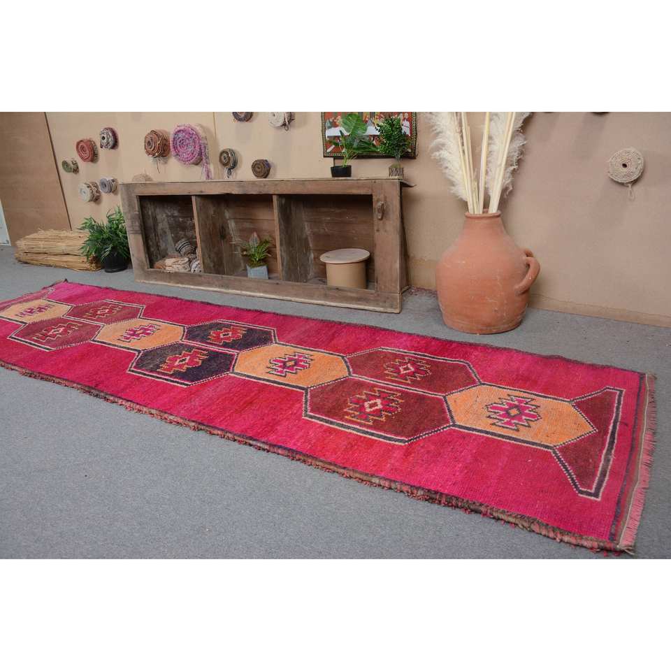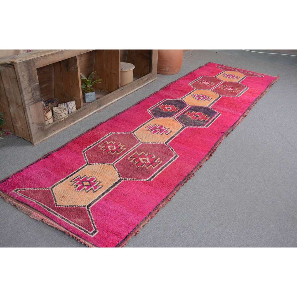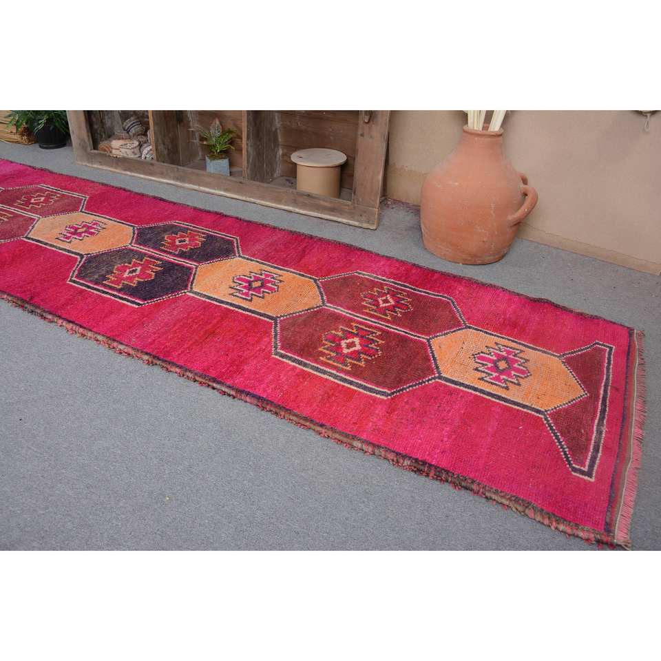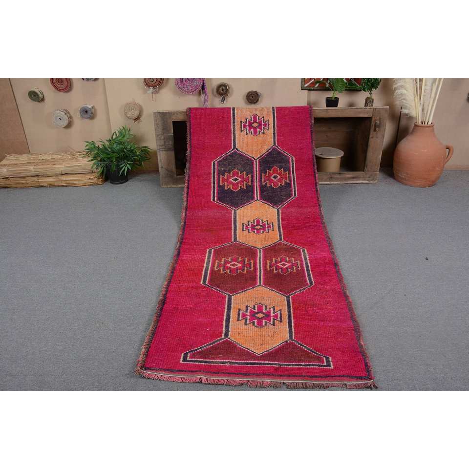 พรมตุรกีวินเทจโบฮีเมียนสีชมพูส้ม3.1 x 11.2ft งานปะทำด้วยมือผ้าขนสัตว์สี่เหลี่ยมผืนผ้าดีไซน์โถงทางเดินสำหรับข้างเตียงยางพาราหนุนหลัง