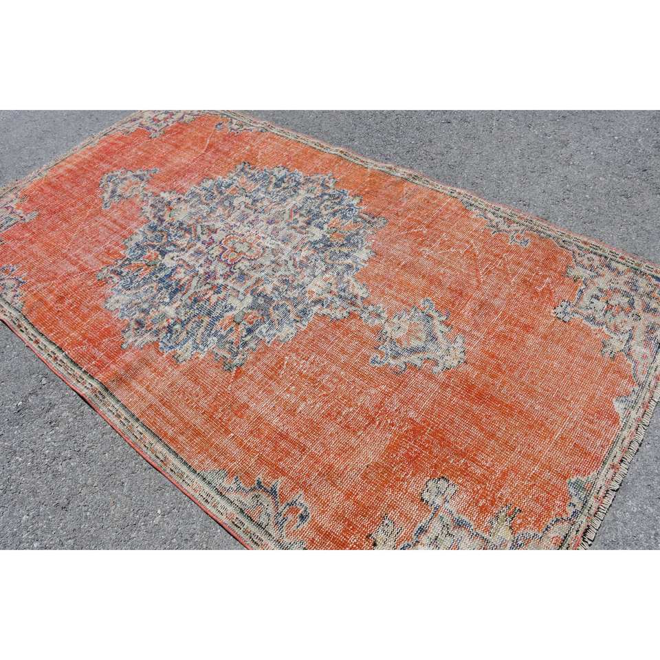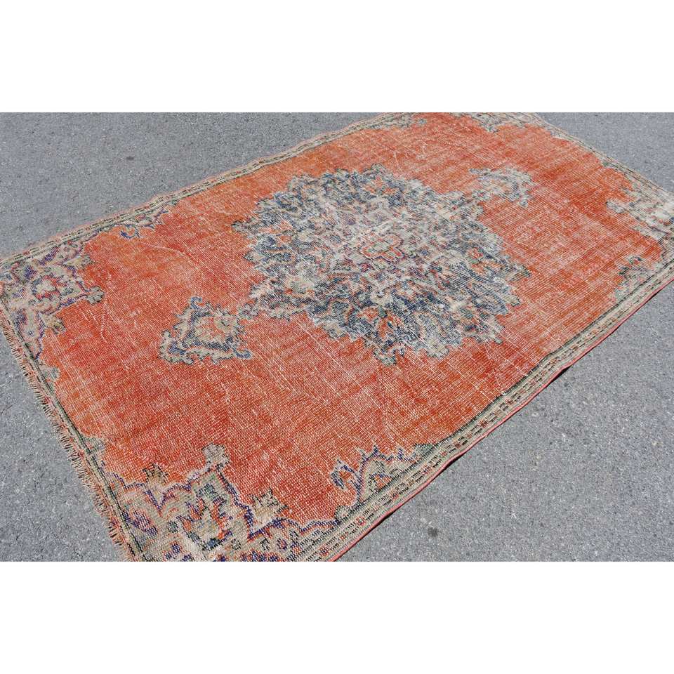 พรมสไตล์ตุรกีแนววินเทจดีไซน์คลาสสิกสีส้มสีฟ้า5.1 x 8.8ft งานเย็บปะวัสดุผ้าขนสัตว์แผ่นรองหลังยาง