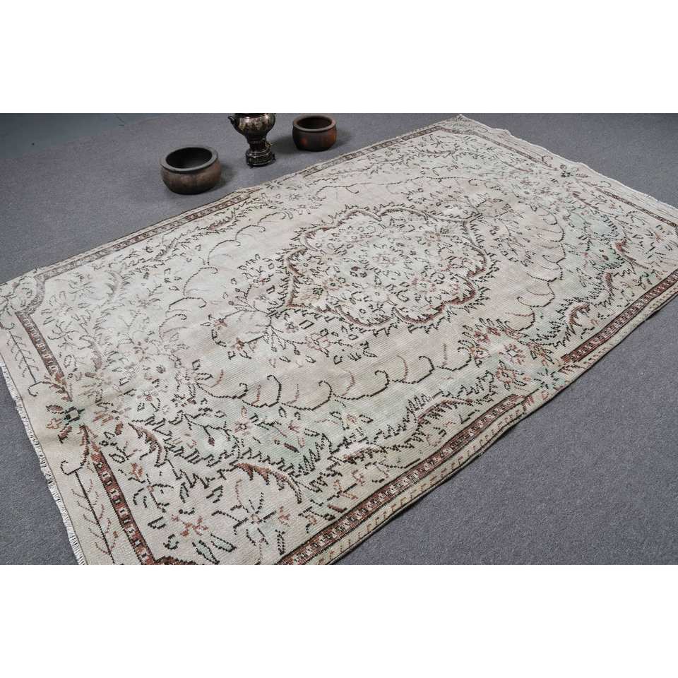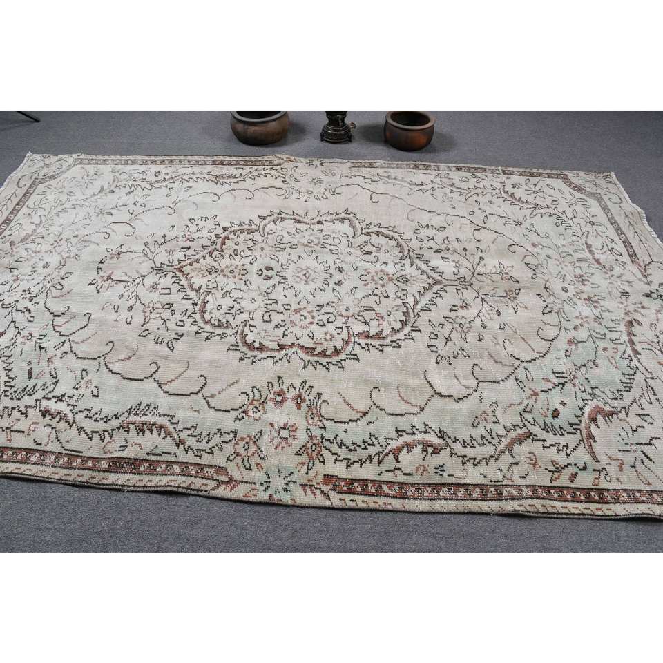 พรมตุรกีวินเทจคลาสสิกสีขาวเบจ5.7X9.4ฟุตผ้าขนสัตว์ลายเย็บปะติดปะต่อกันด้านหลังสำหรับห้องนั่งเล่นห้องโถงห้องนอนวัยรุ่น