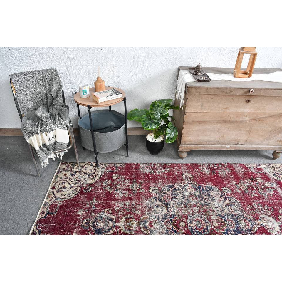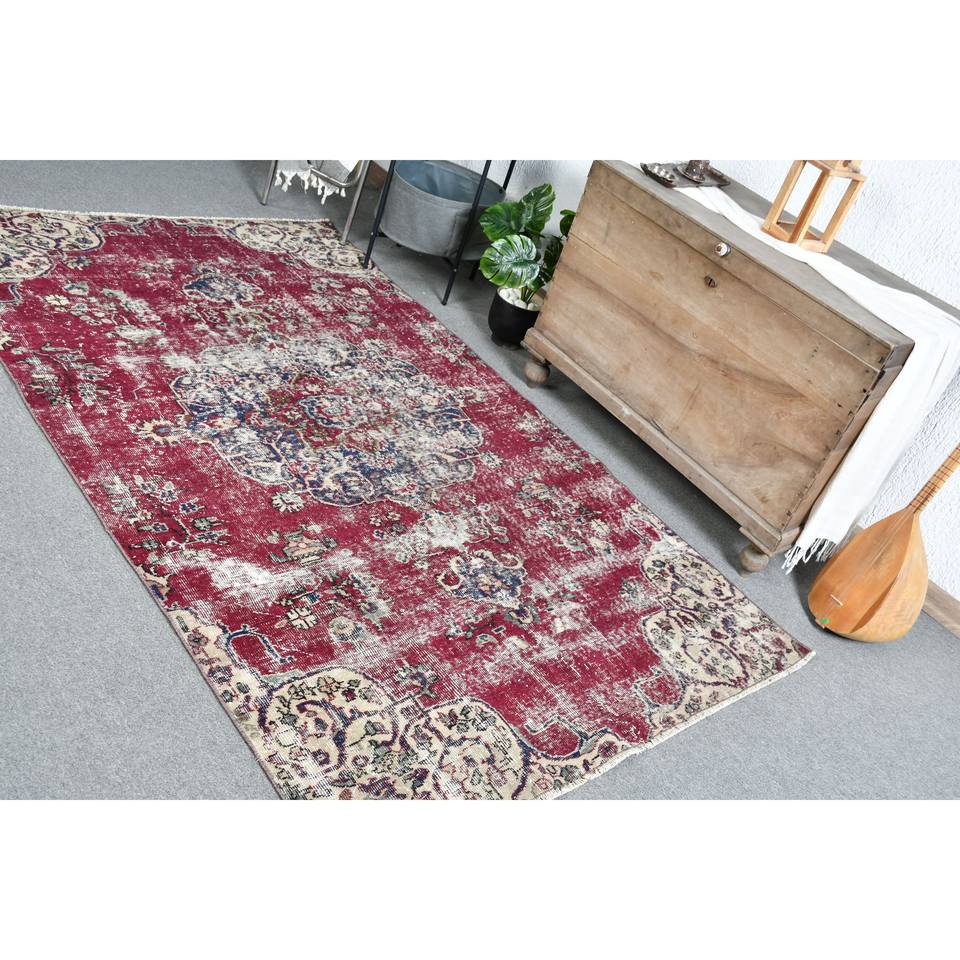 Vintage Turkish Rug Red Beige 4.6x7.6ft Large Area Wool Latex Patchwork for Hallway Bedroom Rectangular Side for Room Bedside