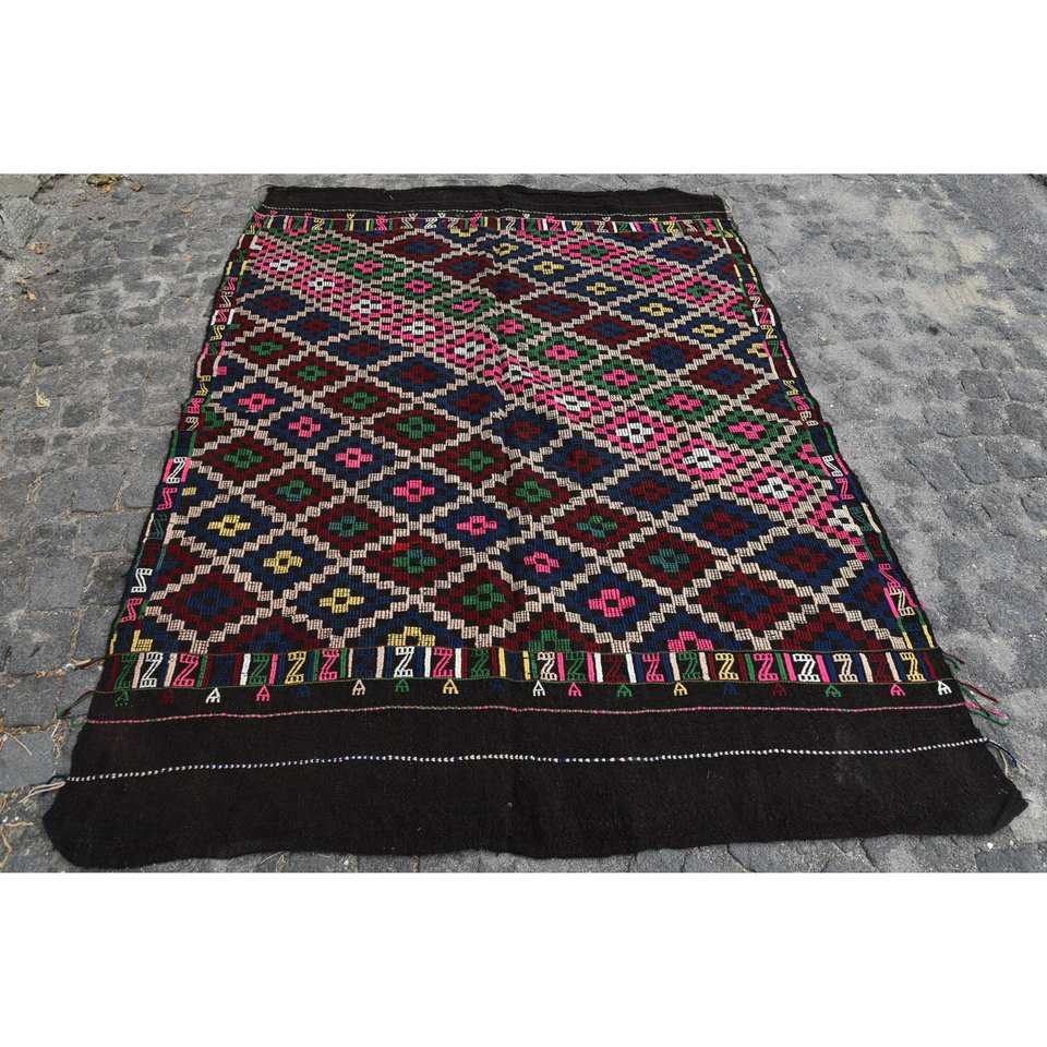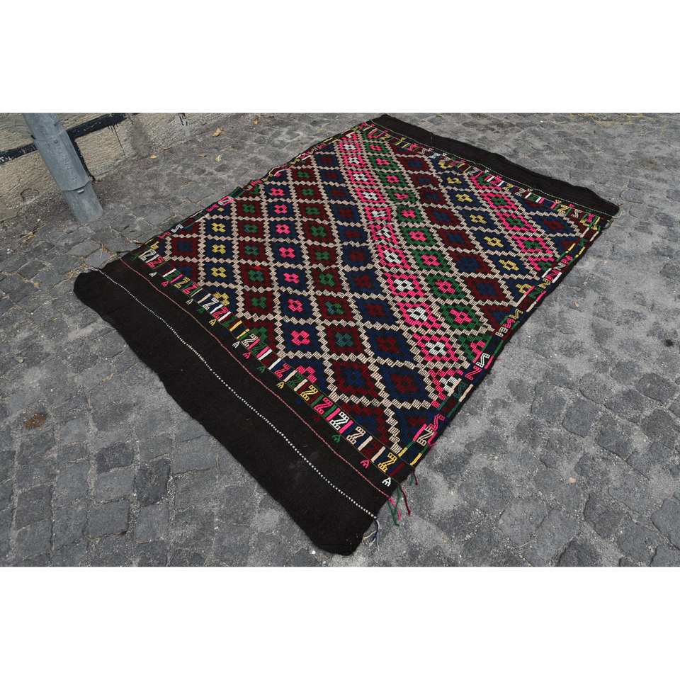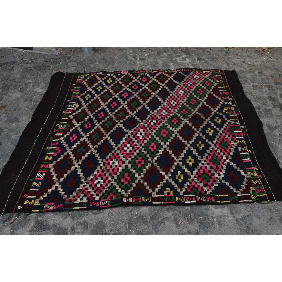 พรมตุรกีโบราณสีดำแบบดั้งเดิมขนาด5.3X7ฟุตขนสัตว์เย็บปะติดปะต่อกันออกแบบสำหรับห้องนั่งเล่นวัยรุ่นสี่เหลี่ยมผืนผ้าห้องโถงน้ำยาง