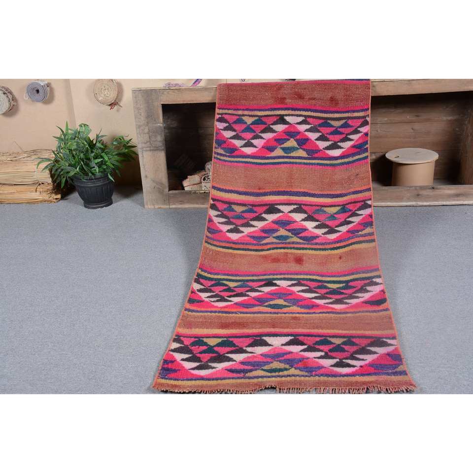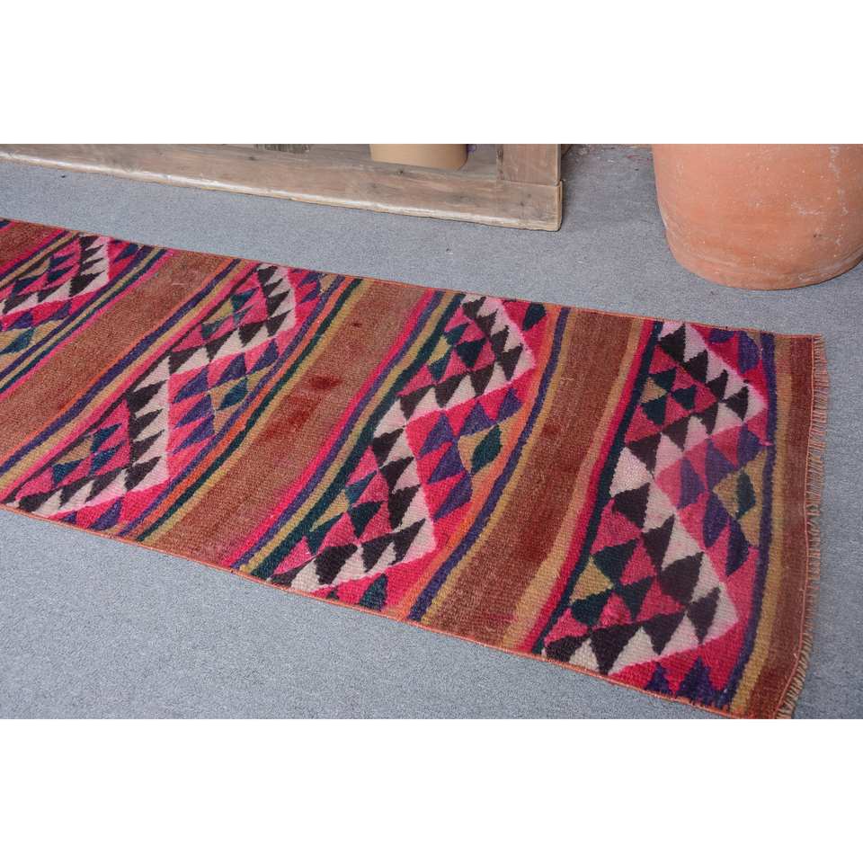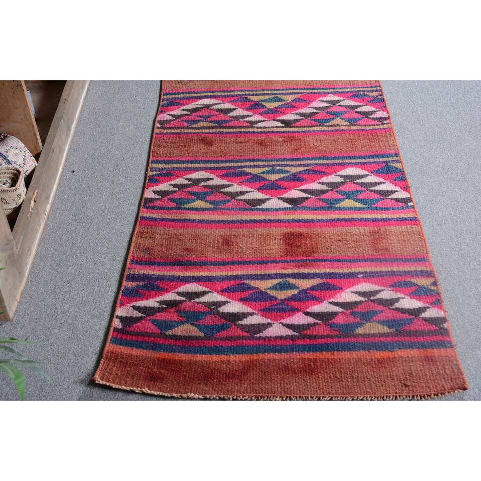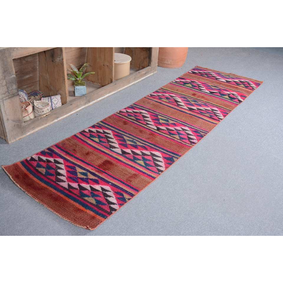 พรมตุรกีโบราณ2.4x11.8ft แดงแบบดั้งเดิมพื้นที่ขนาดใหญ่แผ่นรองยางขนสัตว์ความหนา10มม. ลายเย็บปะติดปะต่อกันสำหรับห้องโถงห้อง