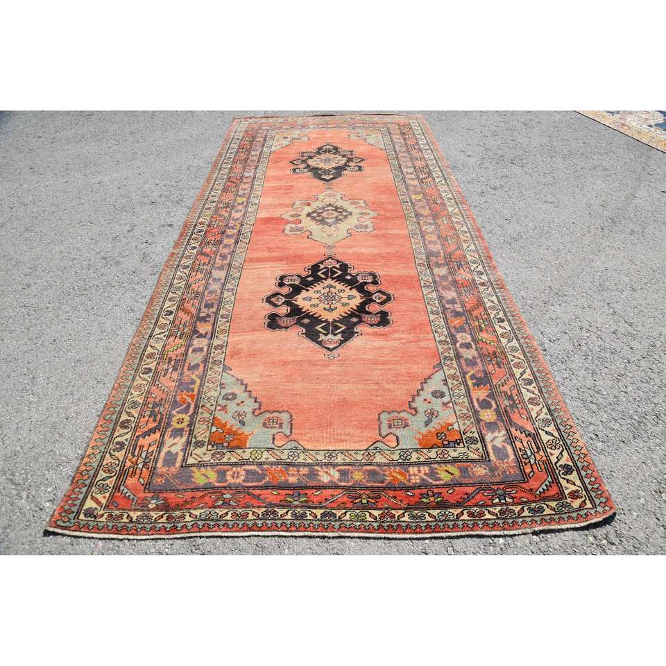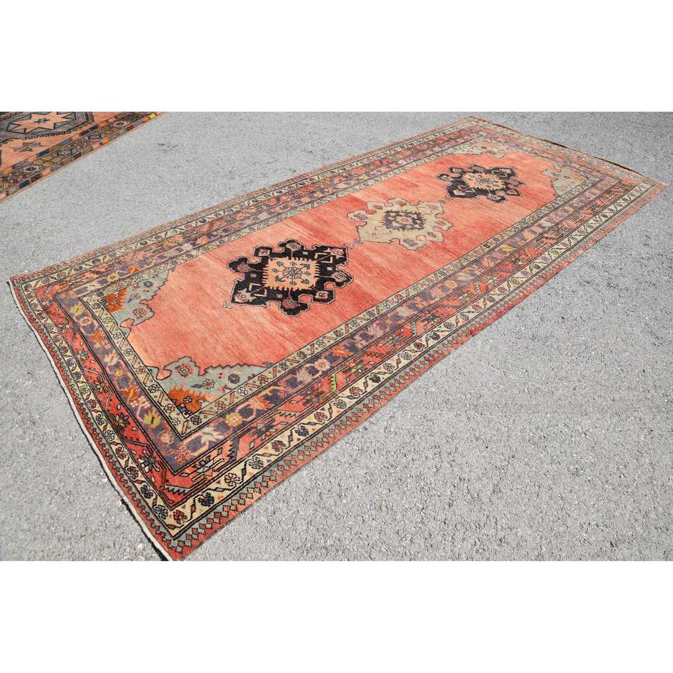 พรมขนสัตว์สไตล์เทอร์คอยน์แนววินเทจขนาด5.2x11.5ฟุตสีส้มคลาสสิกลายปะต่อทรงเรขาคณิตมียางด้านหลังสำหรับใช้ในห้องนั่งเล่น