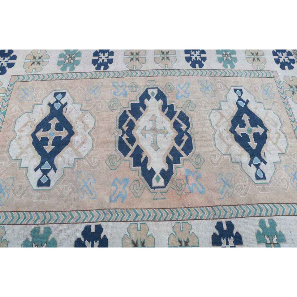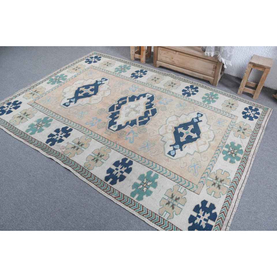 พรมขนสัตว์ตุรกีวินเทจ ขนาด 5.3x7.4 ฟุต (162x226 ซม.) พรมเปอร์เซียสีน้ำเงิน ลายปะติดปะต่อ พร้อมแผ่นรองหลังทำจากยางลาเท็กซ์