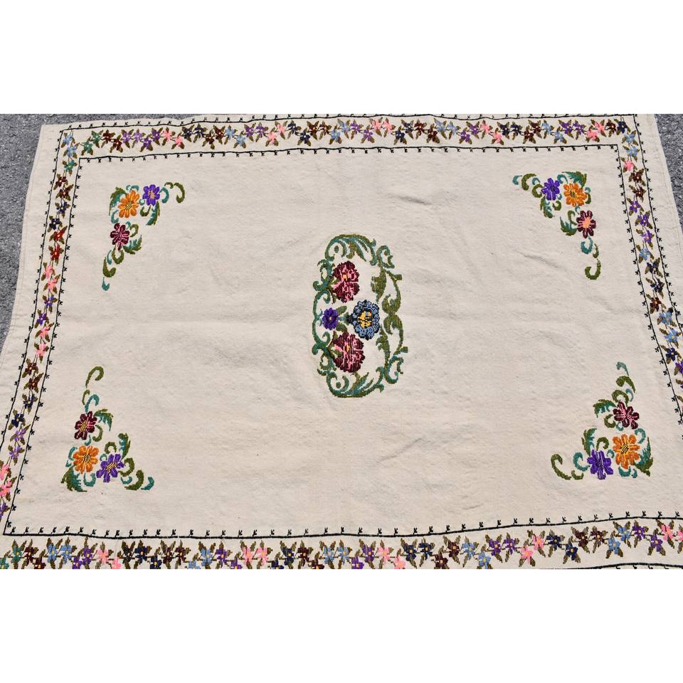 พรมขนสัตว์ตุรกีวินเทจ3.8 x 5.2ft เบจสีดีเย็บปะติดปะต่อกันดีไซน์สำหรับการใช้ชีวิตสี่เหลี่ยมผืนผ้าน้ำยางข้นลายไม้ไผ่