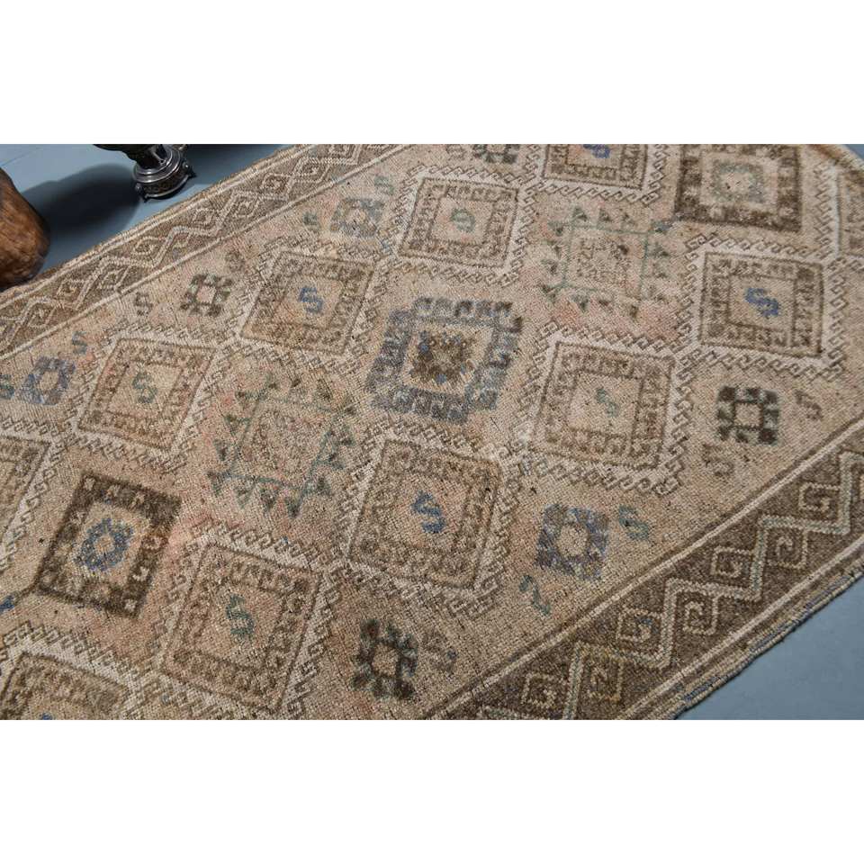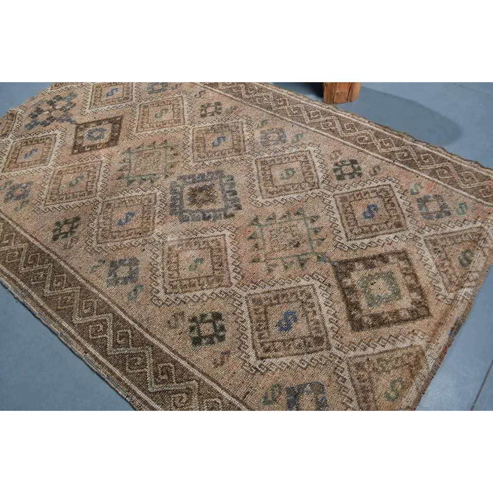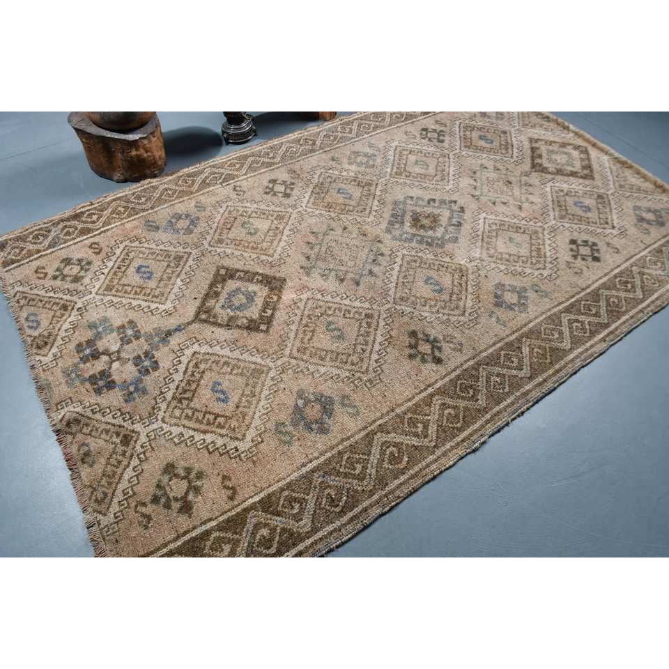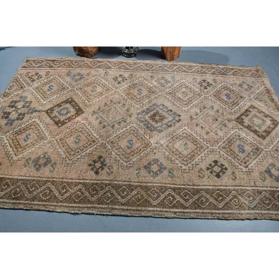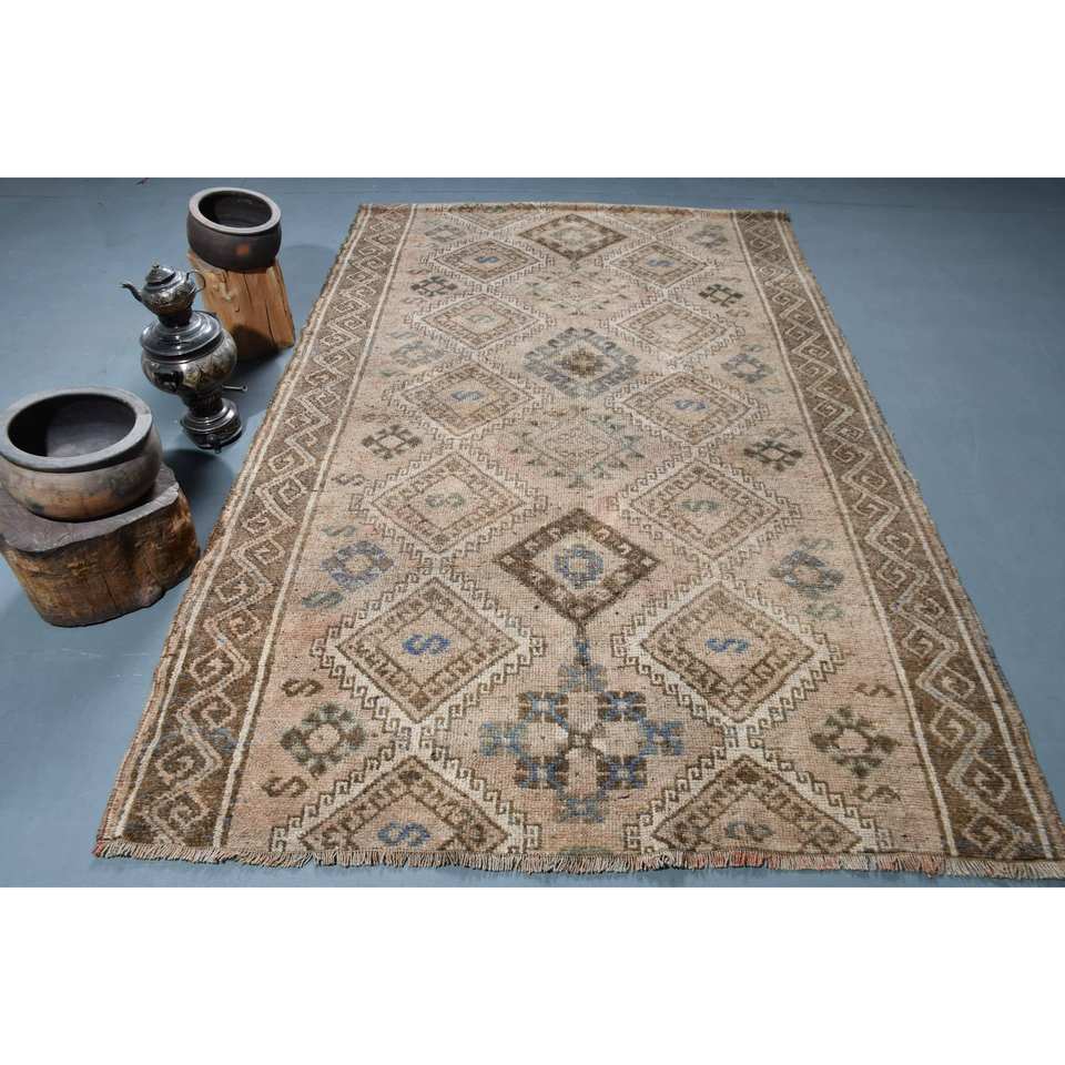 พรมขนสัตว์ตุรกีวินเทจขนาด5.3x8.2ฟุตลายปะต่อสีน้ำตาลเบจพร้อมแผ่นรองยางพาราดีไซน์โถงทางเดินทรงสี่เหลี่ยมสำหรับข้างเตียง