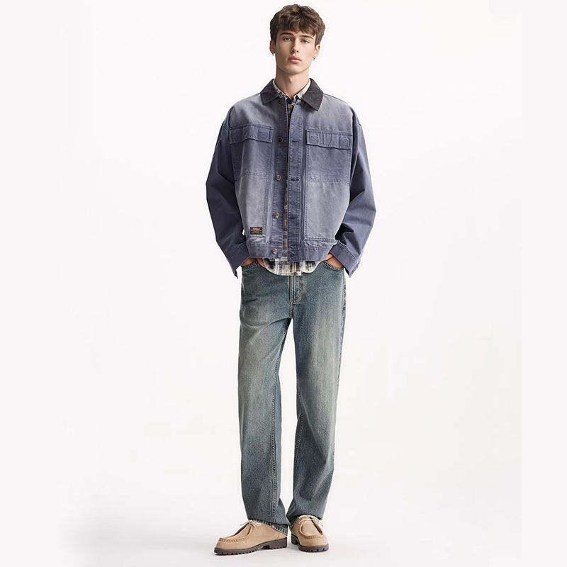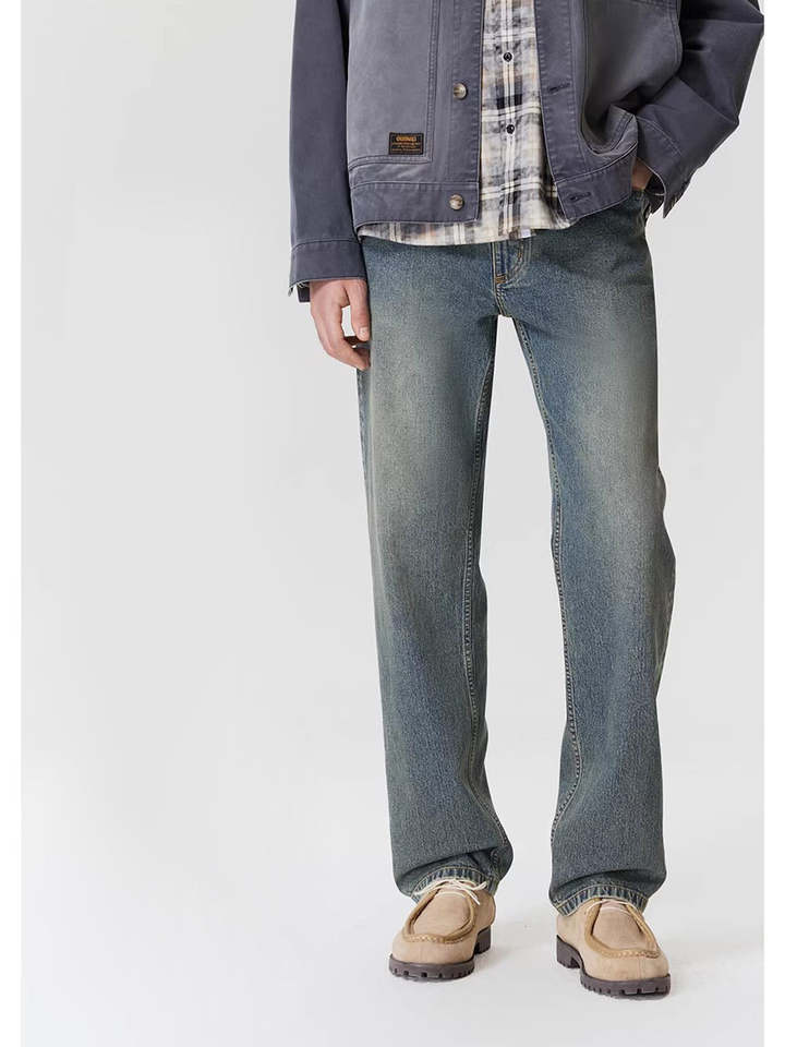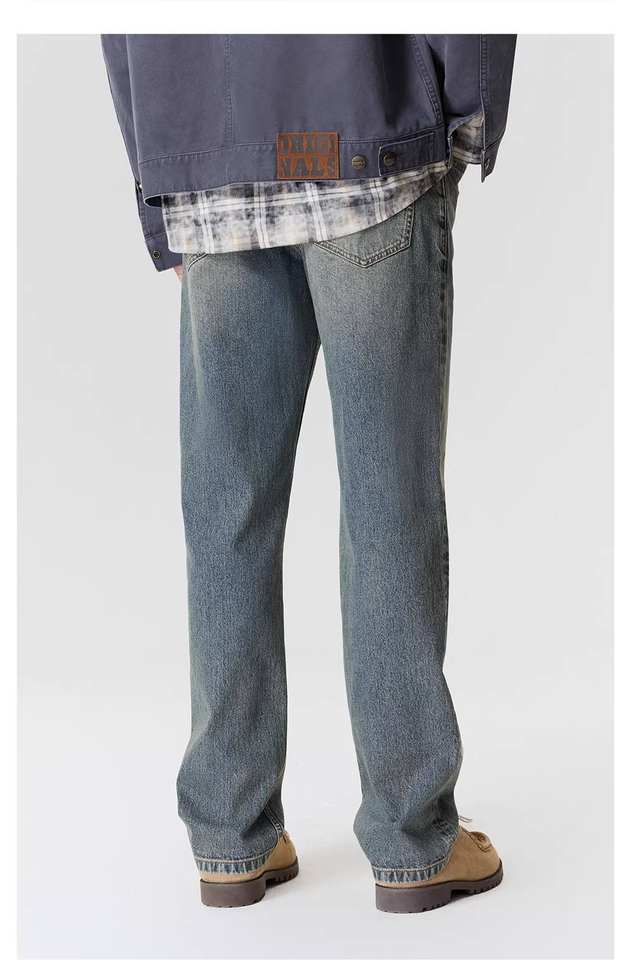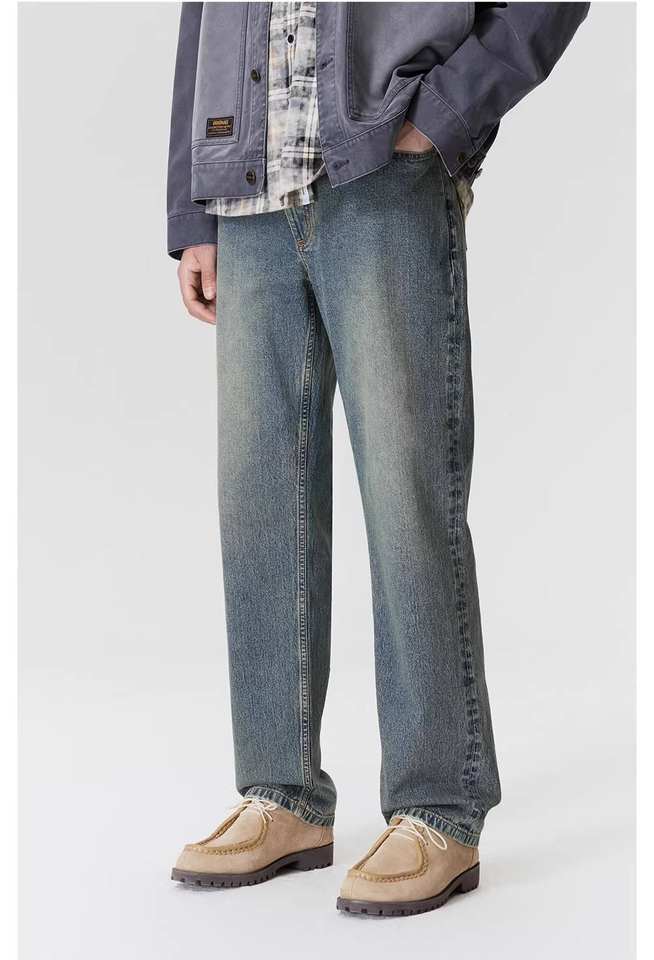 กางเกงยีนส์ผู้ชายทรงตรง ขาตรง น้ำหนักปานกลาง สไตล์ลำลอง สีน้ำเงินเข้ม ล้างแบบวินเทจ ใส่สบาย เหมาะสำหรับฤดูหนาว