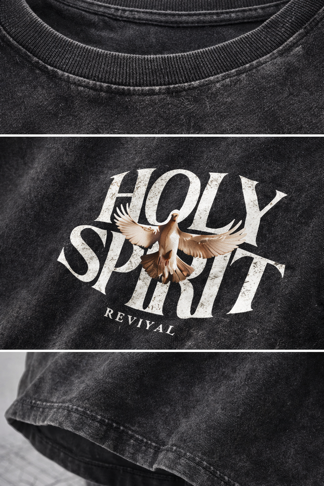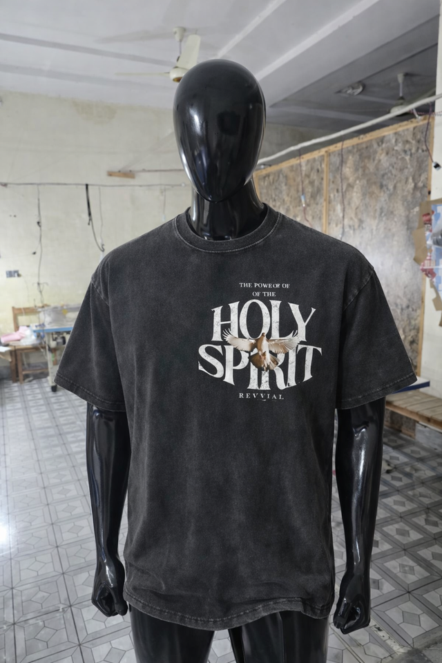 เสื้อยืดวินเทจสีดำล้างสีพร้อมโลโก้ 'Holy Spirit' - เสื้อยืดโอเวอร์ไซส์ลายกราฟิกฮิปฮอปพิมพ์ลายสกรีนพร้อมโลโก้แบบกำหนดเองสำหรับผู้ชาย