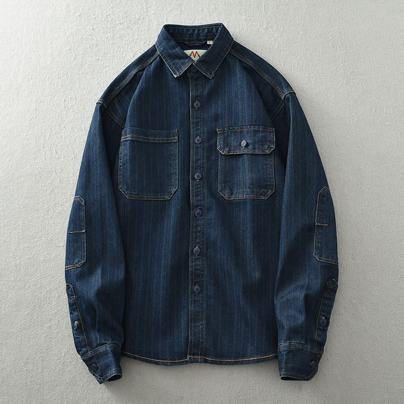 เสื้อยีนส์ลายทางแนวตั้งสำหรับผู้ชายเสื้อแจ็กเก็ตแขนยาวทรงหลวมผ้าฝ้ายสีฟ้าอ่อนสไตล์ย้อนยุคสำหรับ3XL