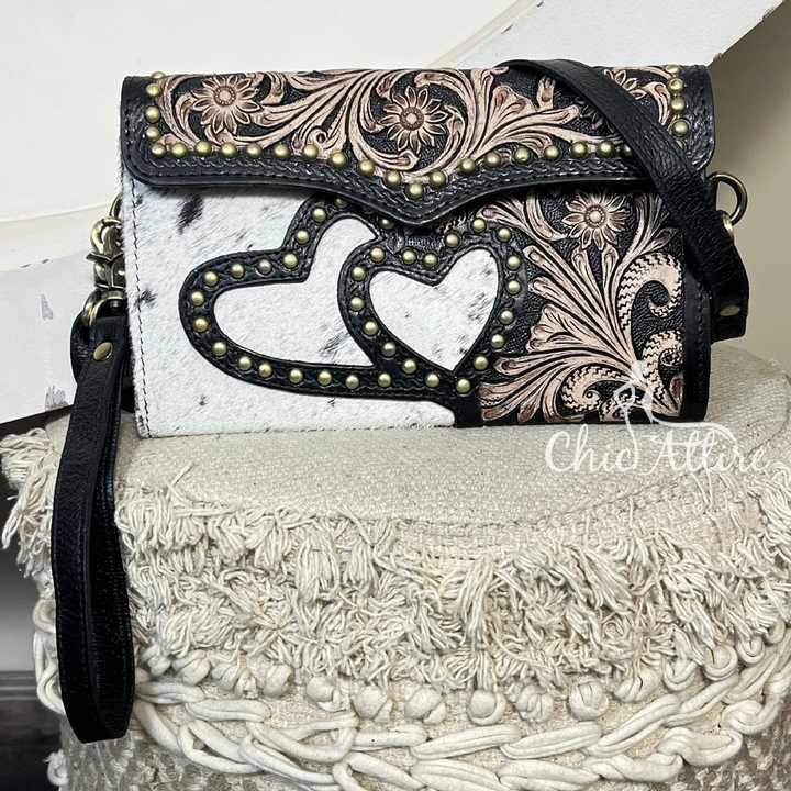 Hand Tooled Cowhide Leather Crossbody Wallet Clutch