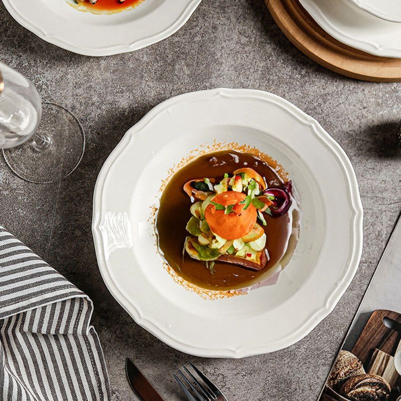 จานอาหารค่ำเซรามิกสีขาวแนววินเทจสำหรับใส่เค้กอาหารเช้าซุปซุปข้นสลัดผลไม้ของหวานเครื่องใช้บนโต๊ะอาหารในงานปาร์ตี้