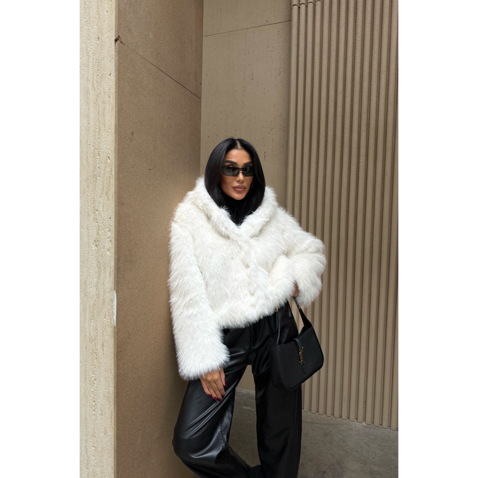 เสื้อโค้ทขนสั้นสีขาวสไตล์วินเทจ ลายสก็อต ทำจากวัสดุผ้าทอ แต่งกระดุมและซิป