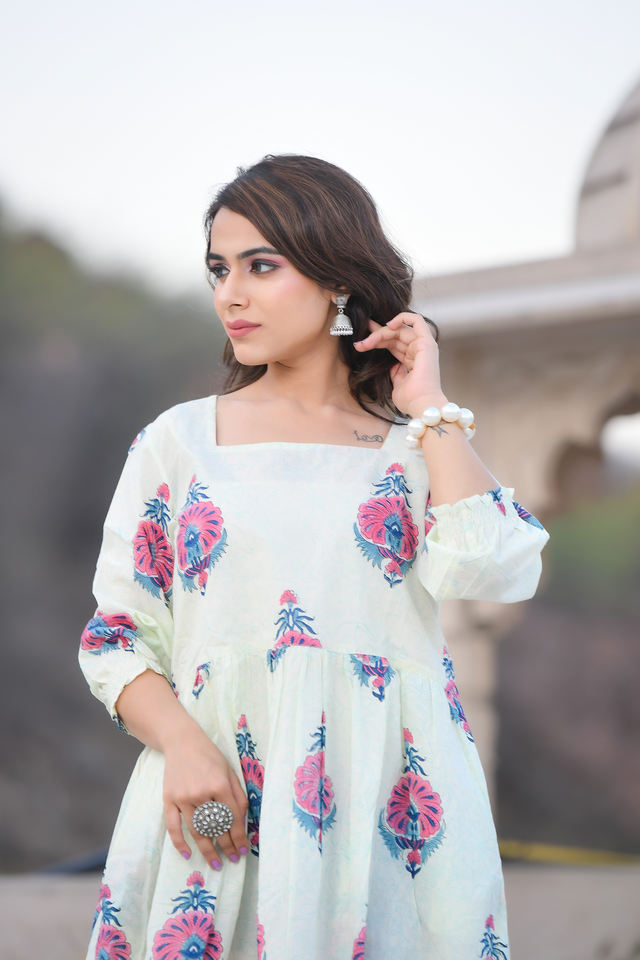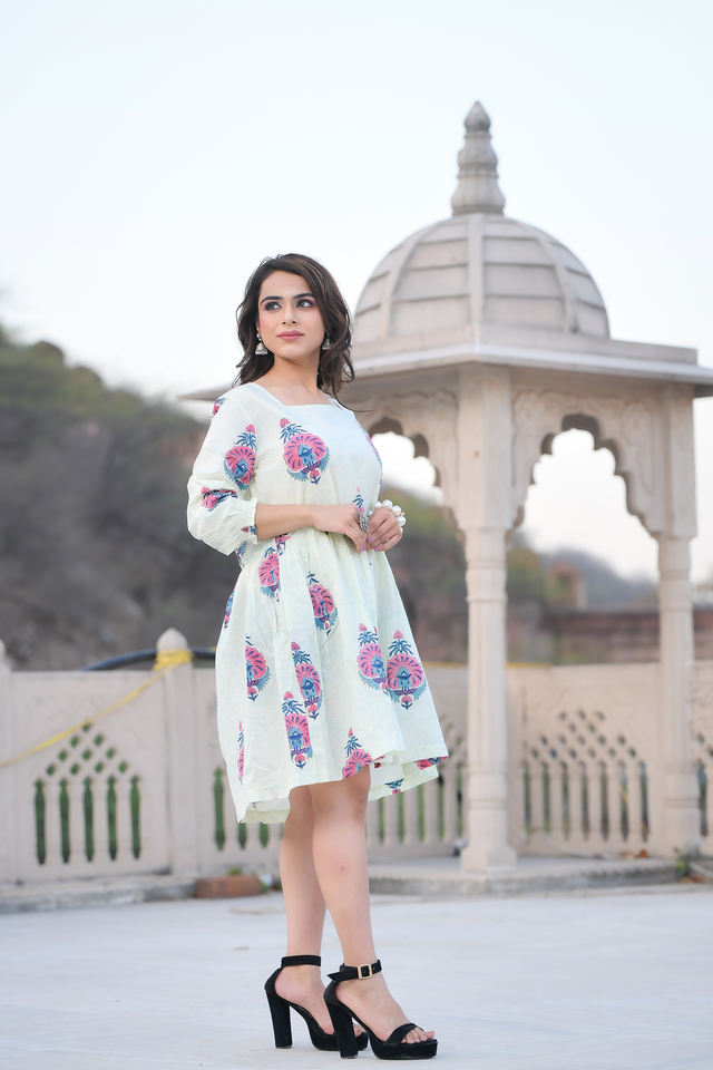 ชุดเดรสผ้าฝ้ายพิมพ์ลายบล็อกสำหรับผู้หญิง ความยาวมินิเดรส ผลิตตามสั่ง ขายส่ง รับผลิตตามขนาดและฉลากที่กำหนด สั่งซื้อจำนวนมาก