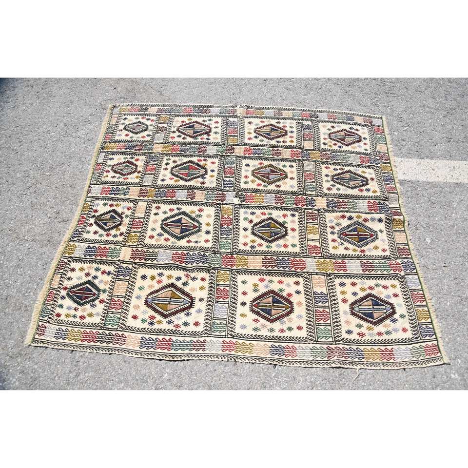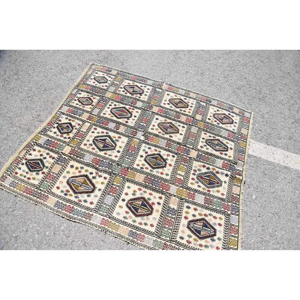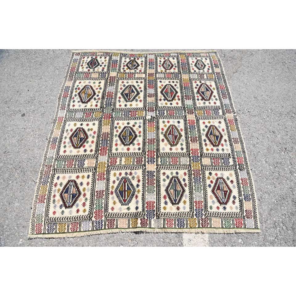 พรม kaboche ขนแกะสีขาววินเทจ4.4 x 4.8ft เย็บปะติดปะต่อกันทางเรขาคณิตที่ทำด้วยมือสำหรับตกแต่งห้องนั่งเล่นสำหรับวัยรุ่น